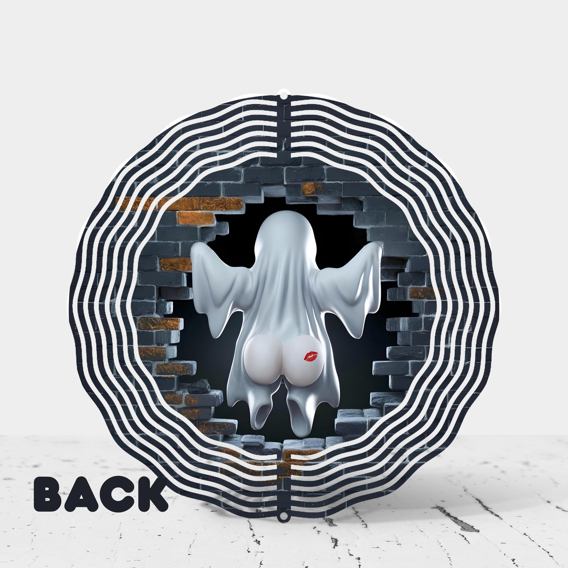 Add a whimsical touch to your garden with this eye-catching 10x10 inch 3D ghost wind spinner. Crafted from durable aluminum, this double-sided piece features a vibrant sublimation-printed ghost breaking out of a brick wall, creating a striking 3D illusion. The front side shows the front of the ghost, while the back offers a playful view of the ghost's butt, with two customizable options: one plain and one adorned with a charming heart. Designed to rotate 360 degrees, it moves beautifully in the breeze, bringing life and personality to any outdoor space.