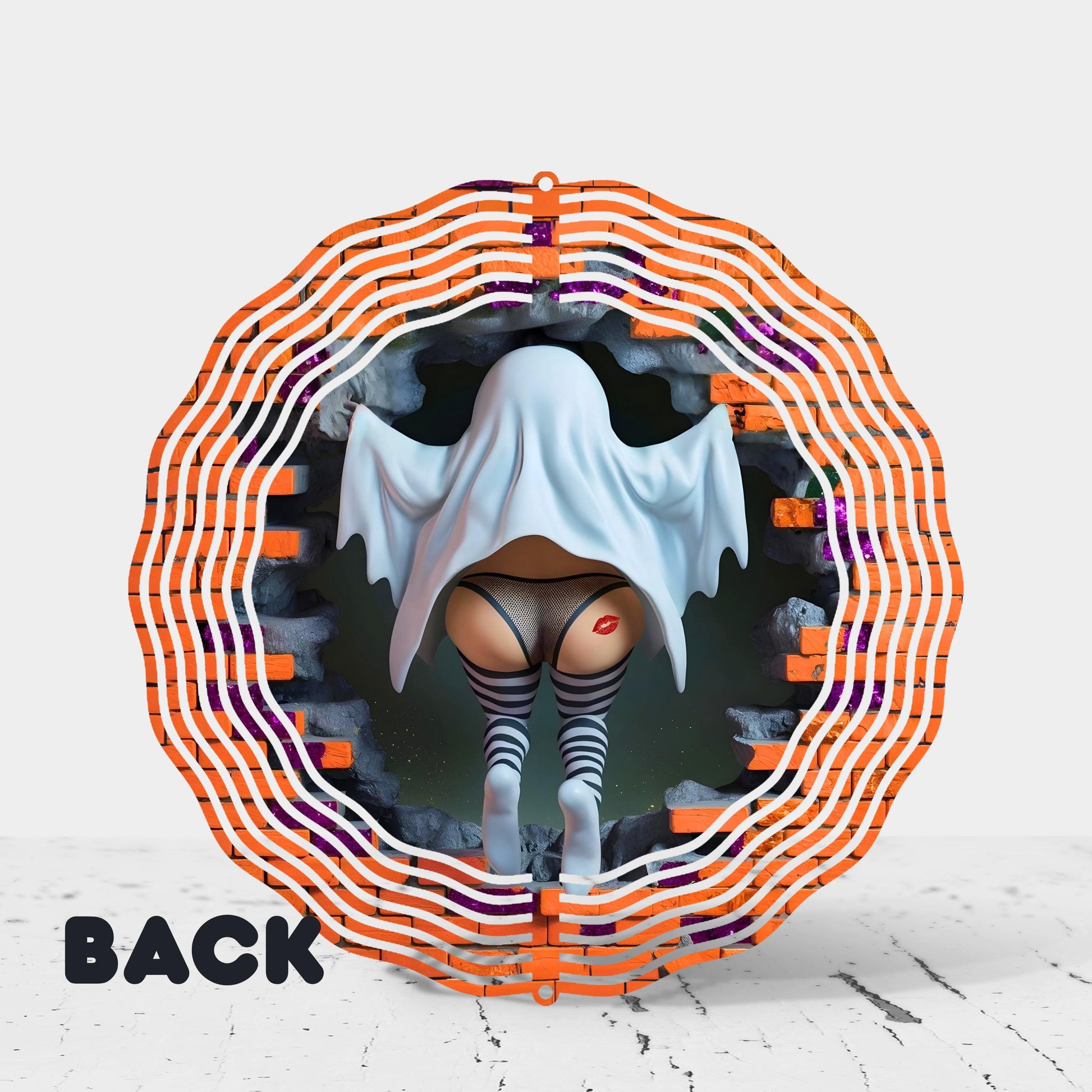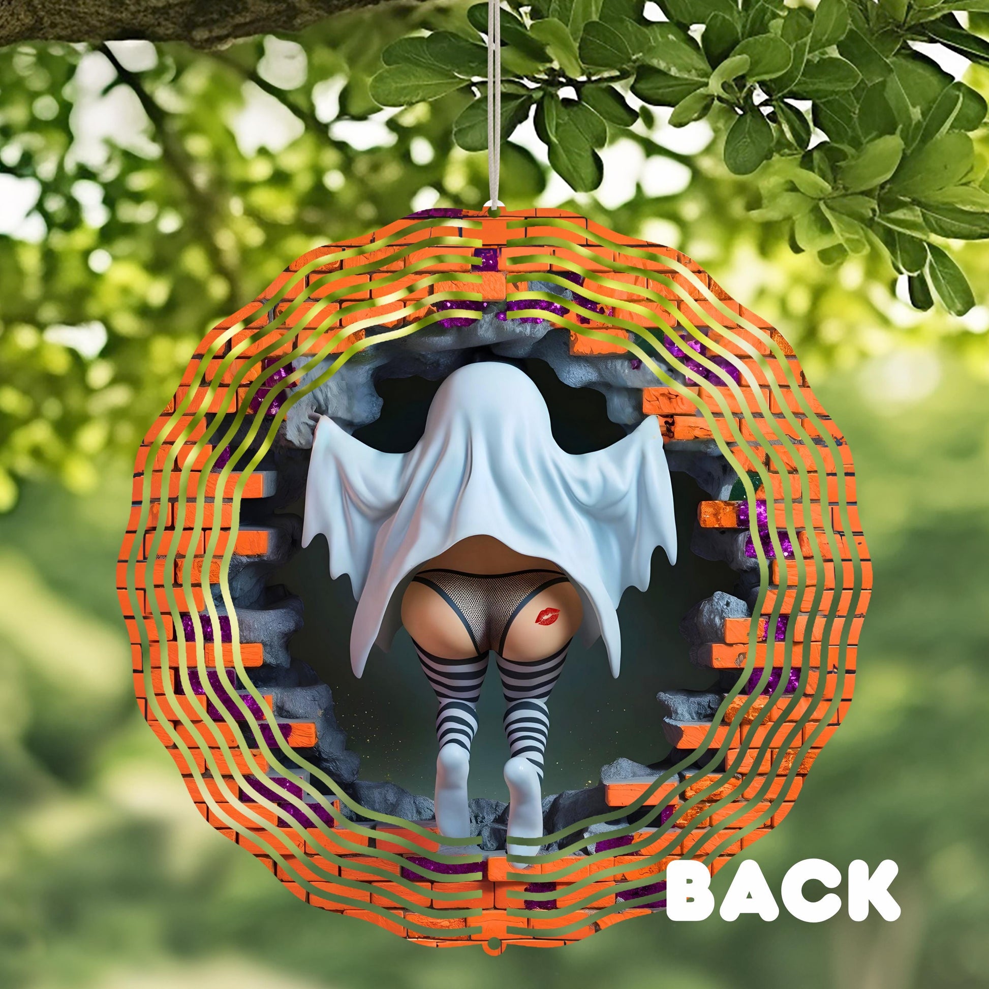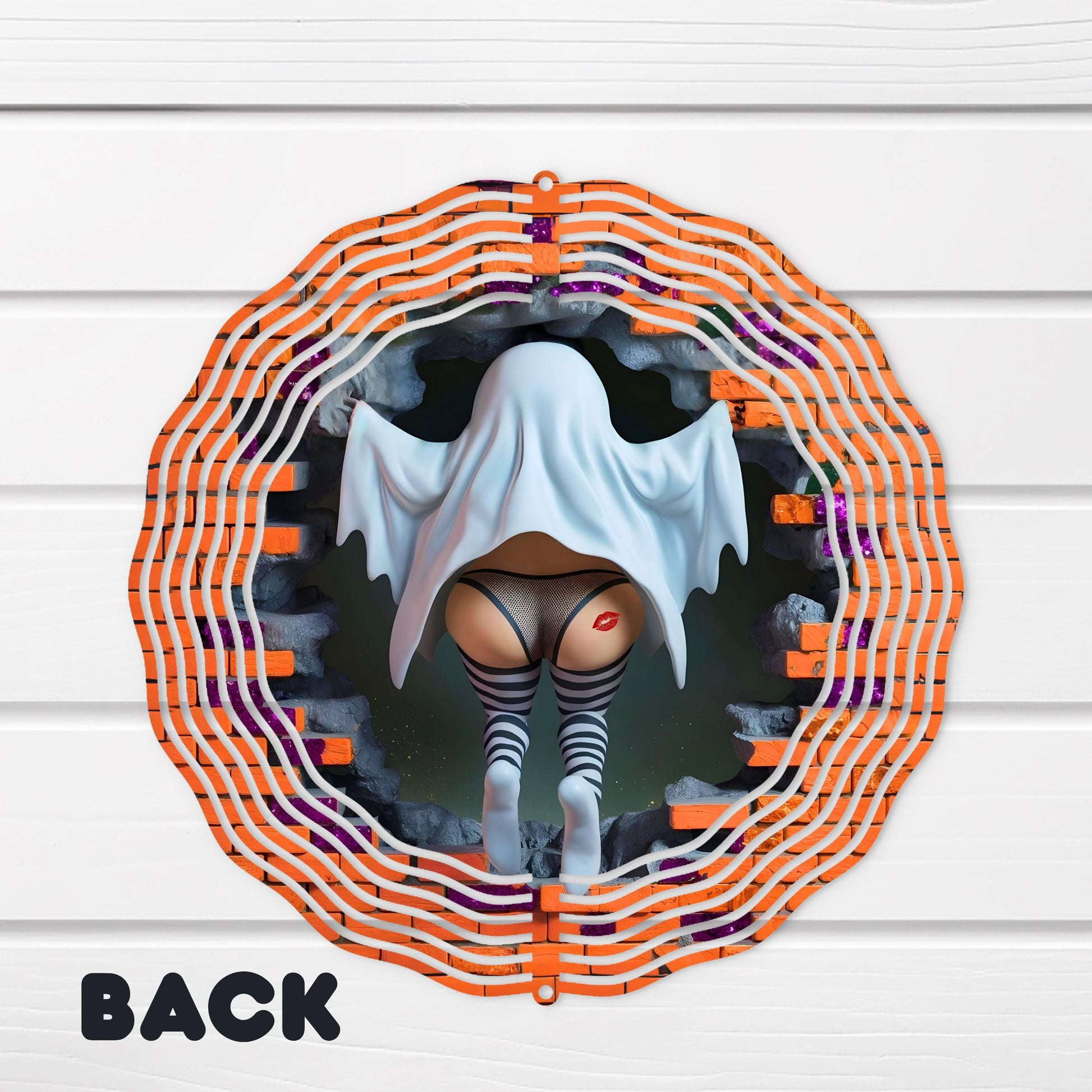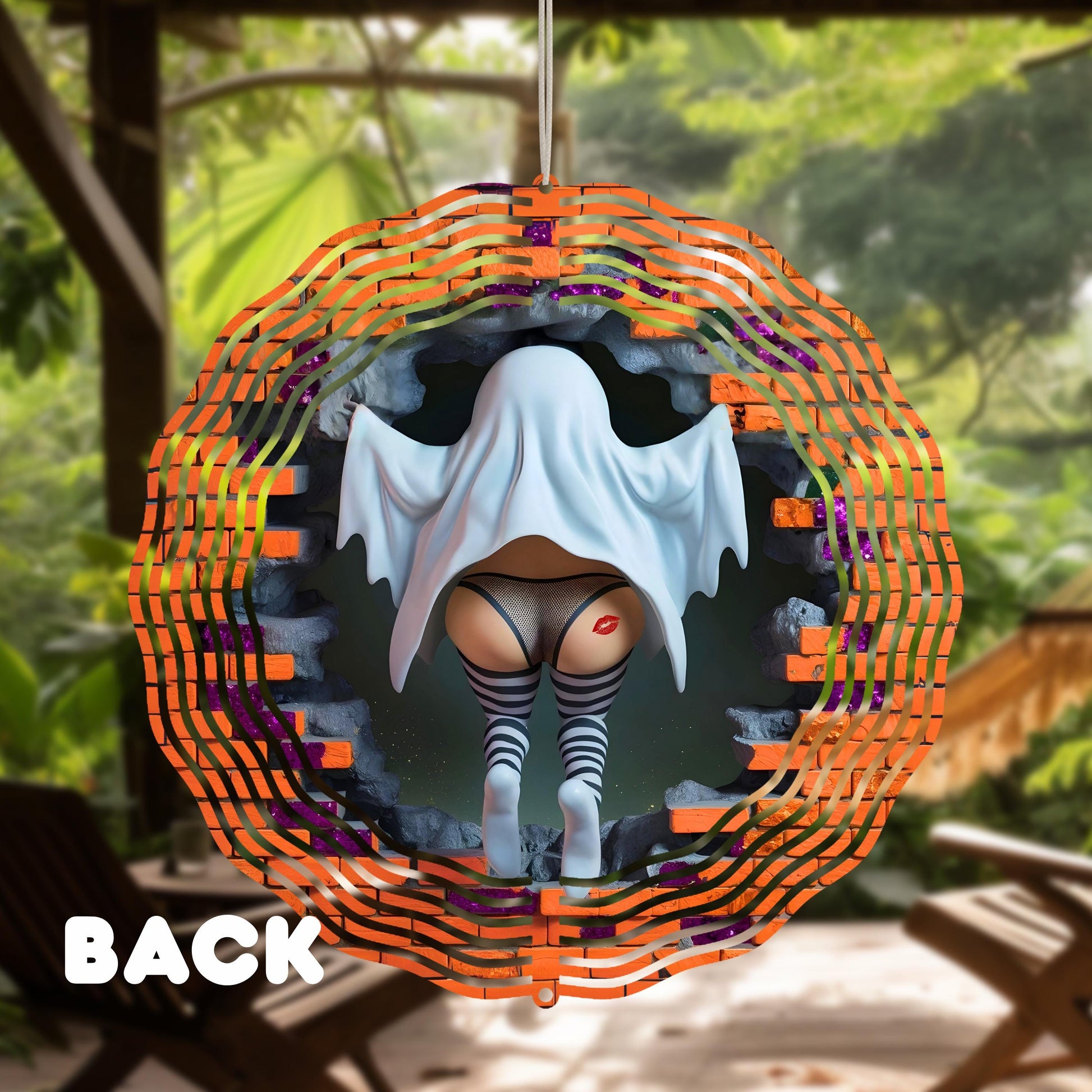 Add a spooky touch to your outdoor space with this unique 10x10 inch 3D double-sided aluminum wind spinner. Crafted with high-quality sublimation printing, the vibrant ghost image appears on both sides—front showing the ghost's face and the back revealing a playful ghost butt with an optional charming heart detail. The spinner's durable aluminum construction ensures it stands up to the elements with UV protection coating, maintaining its vivid colors season after season. Its 360-degree rotation feature allows the ghost to dance in the breeze, creating an eye-catching display perfect for Halloween or year-round spooky garden decor.