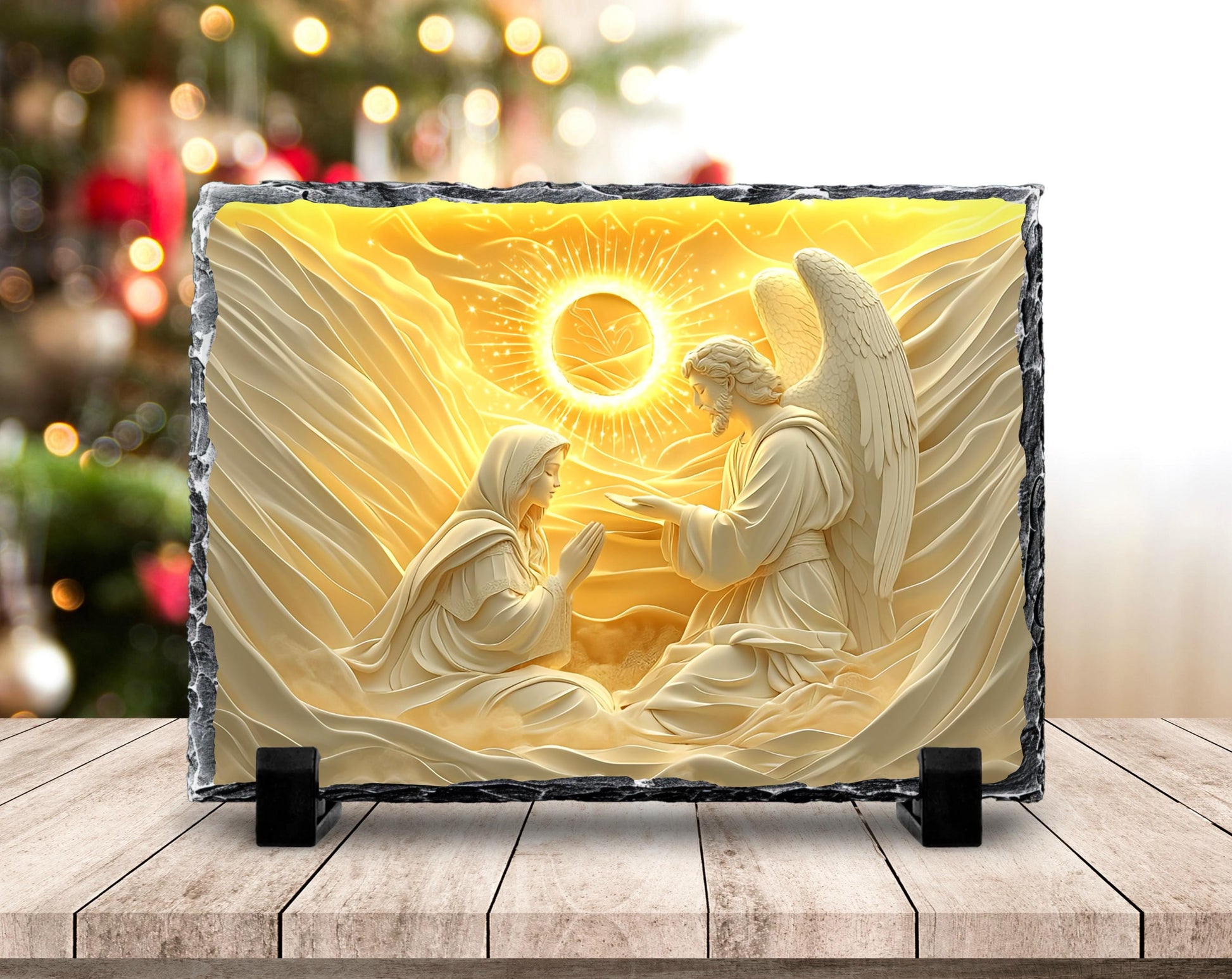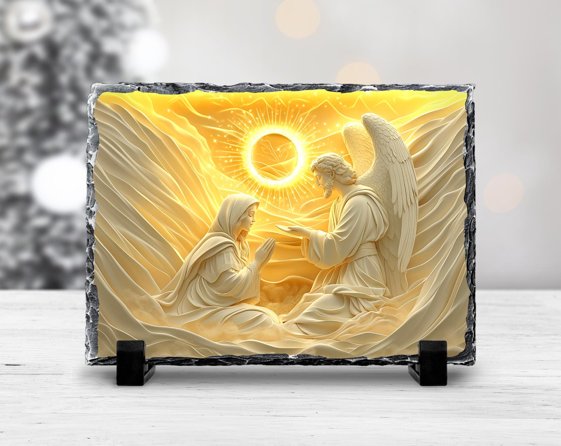 Transform your space with this beautifully crafted 3D depiction of Mary in prayer alongside an angel, set against a serene golden sun backdrop. This unique slate plaque measures 5.85x7.85 inches, featuring fractured edges that add an artistic touch, making it a striking addition to any home or sacred environment. Ideal for personal devotion or as a thoughtful gift, this piece seamlessly blends spirituality with elegance.