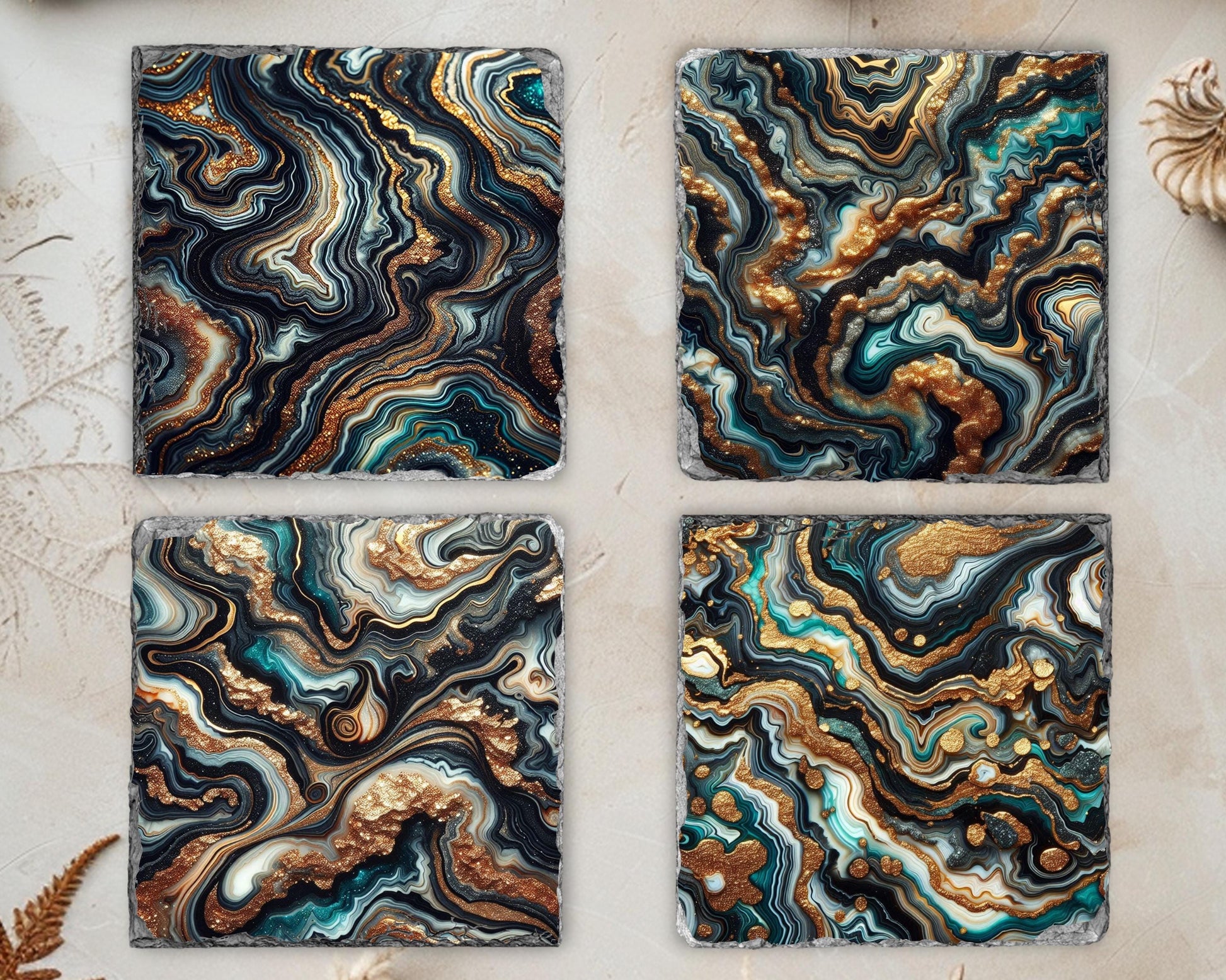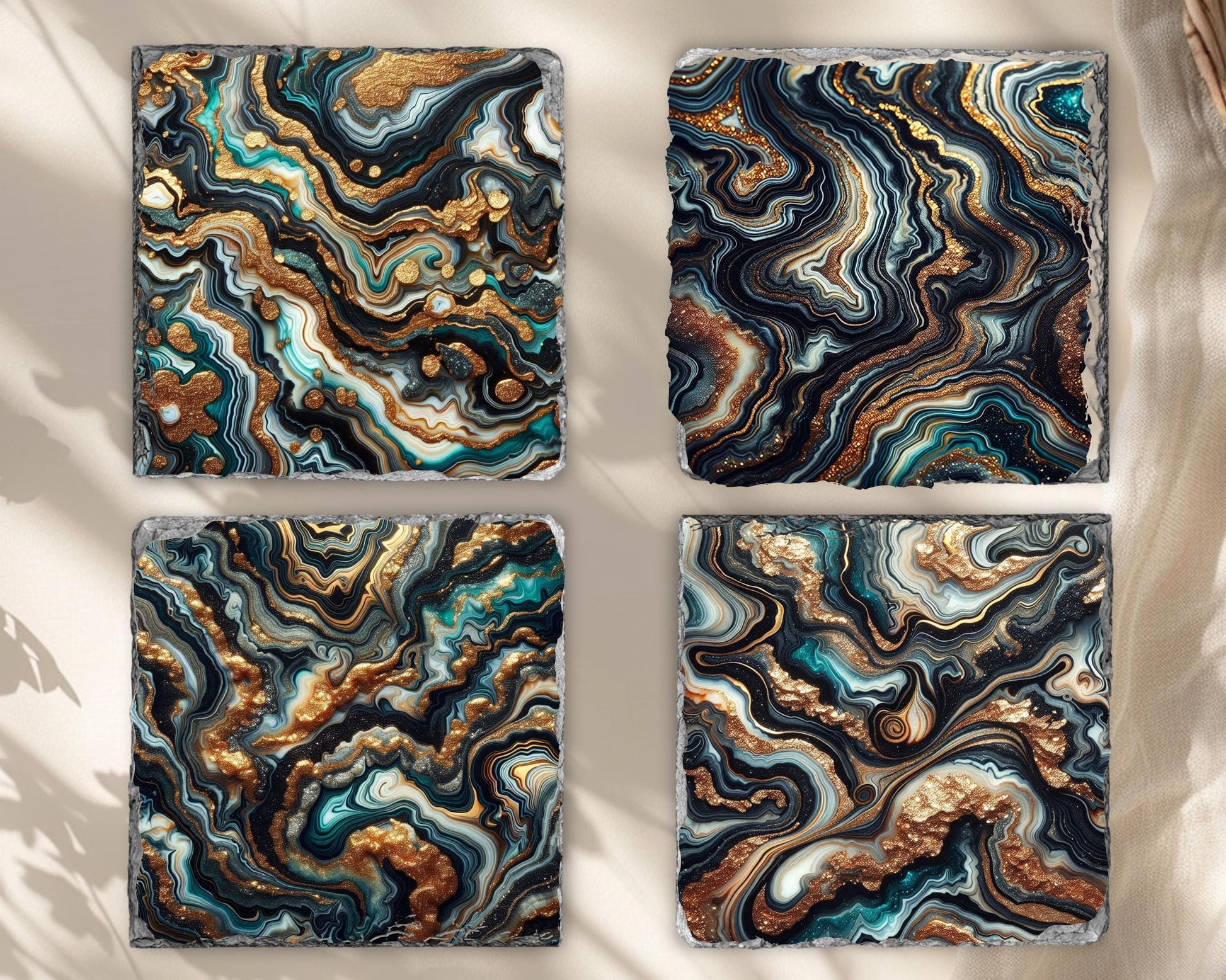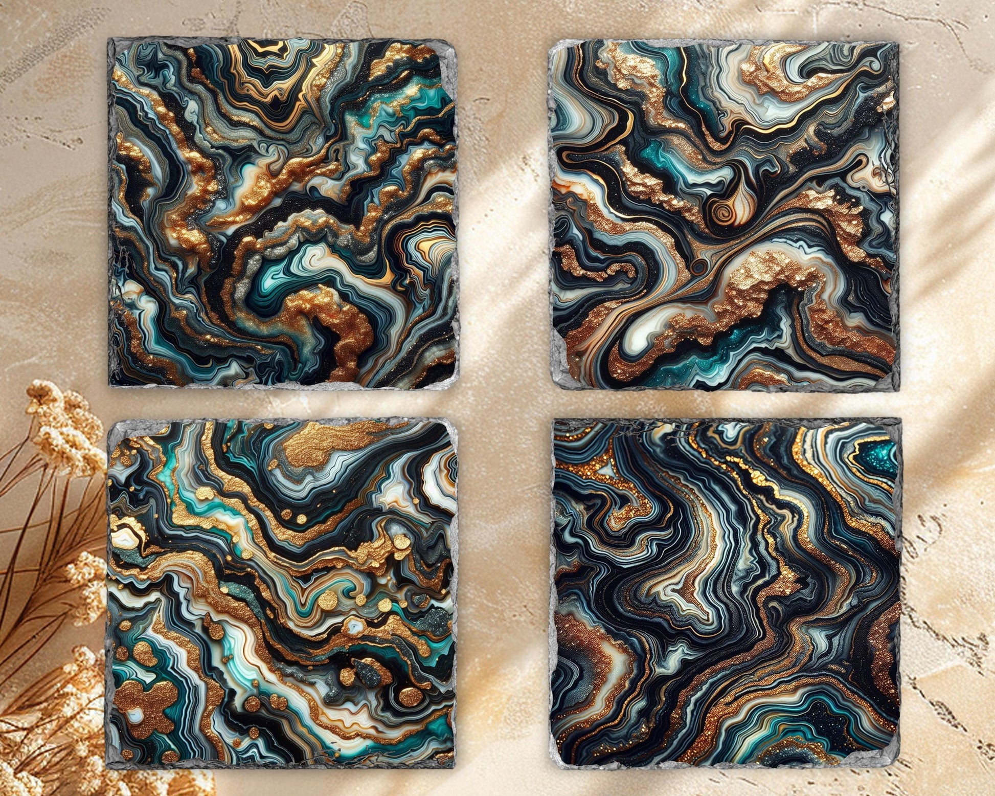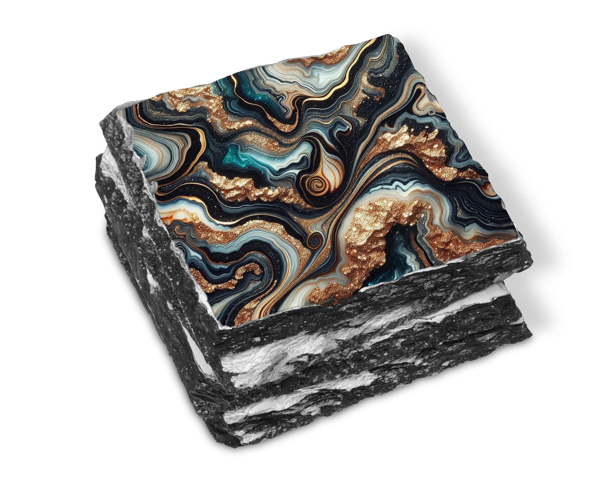 Experience the harmonious blend of bold elegance and natural beauty with our handcrafted slate coaster set. This unique collection features four coasters, each showcasing distinct designs inspired by agate, with a captivating palette of black, gold, and shimmering faux glitter silver. The swirling patterns evoke the allure of geodes and mineral formations, adding a sophisticated element to your home décor.