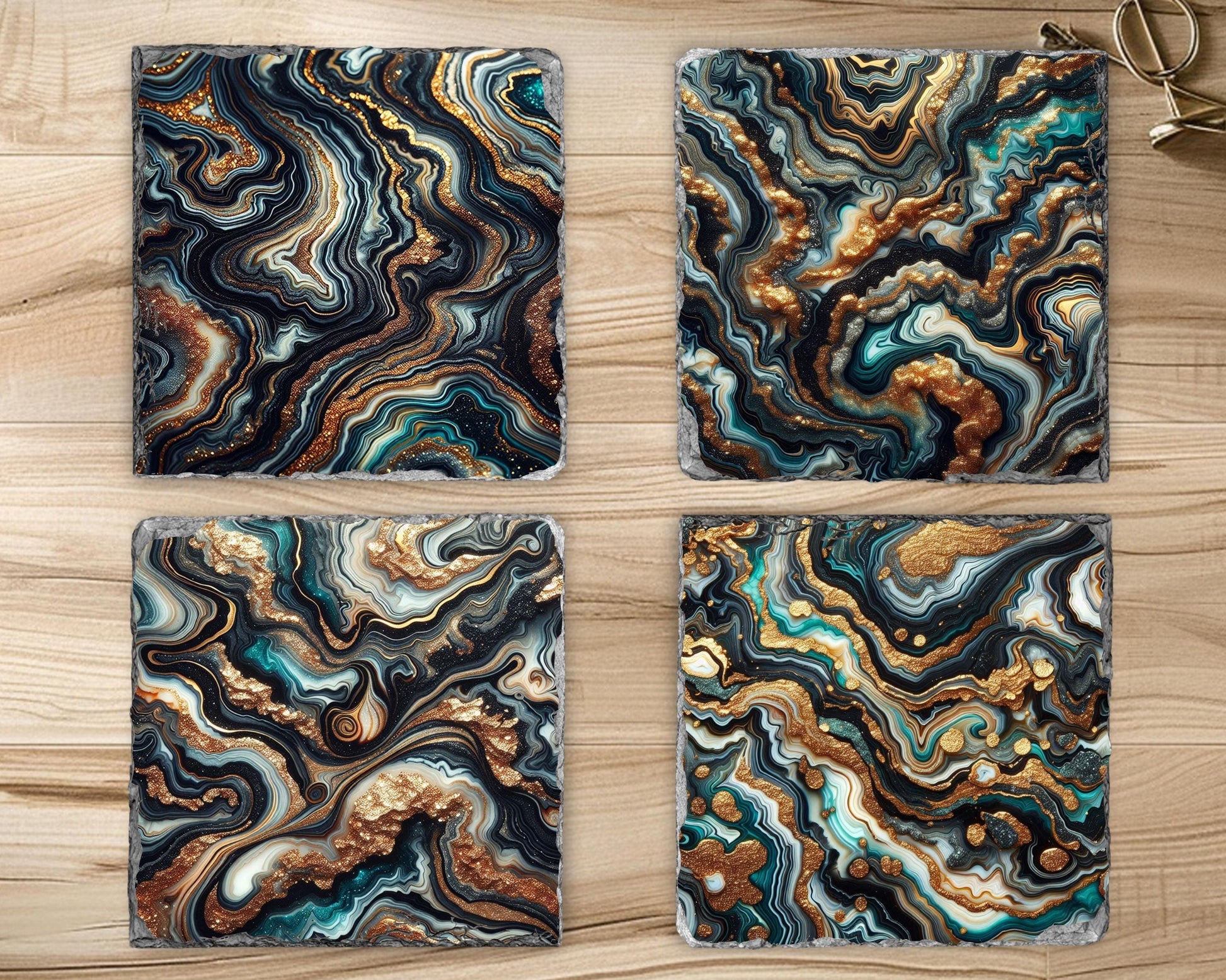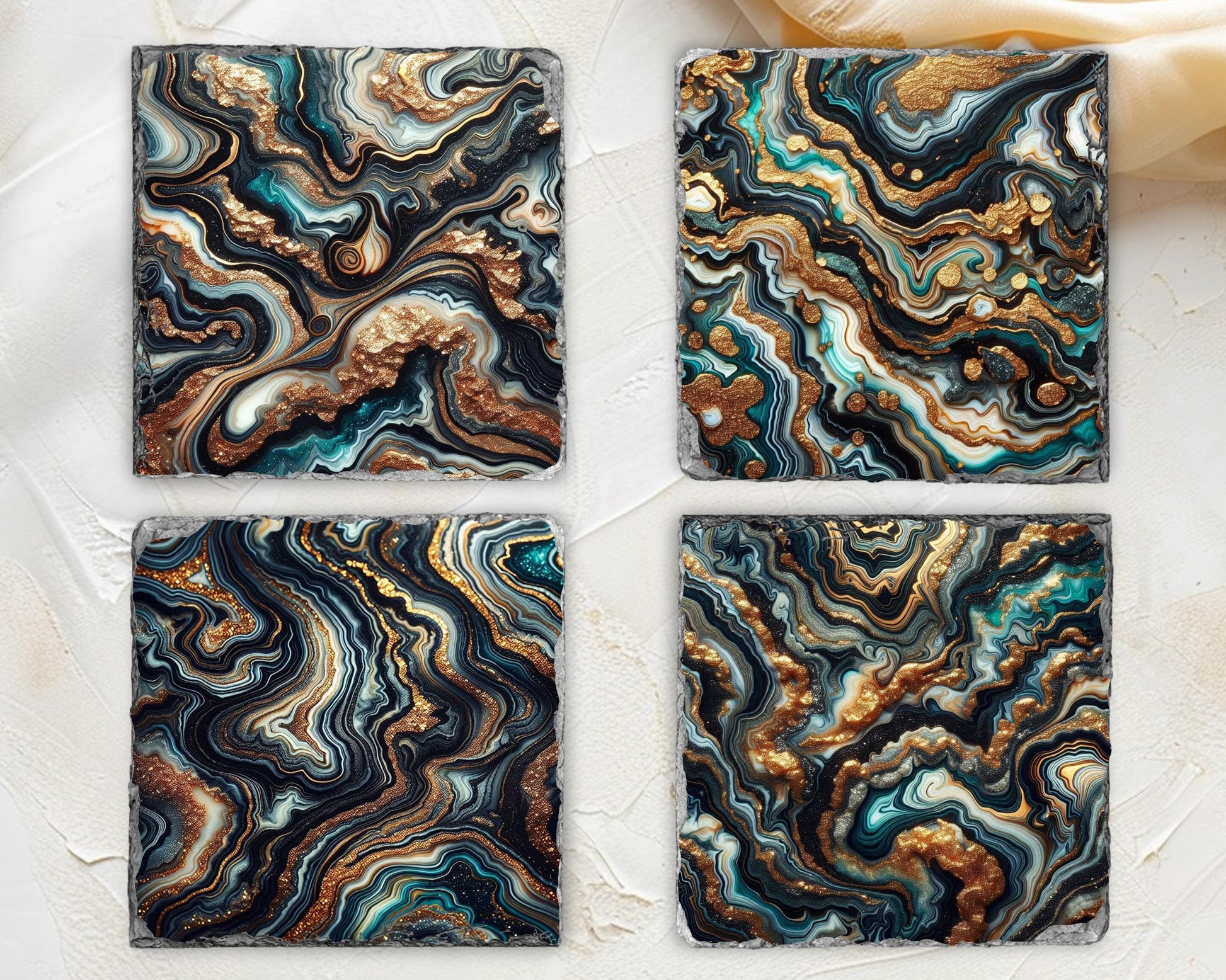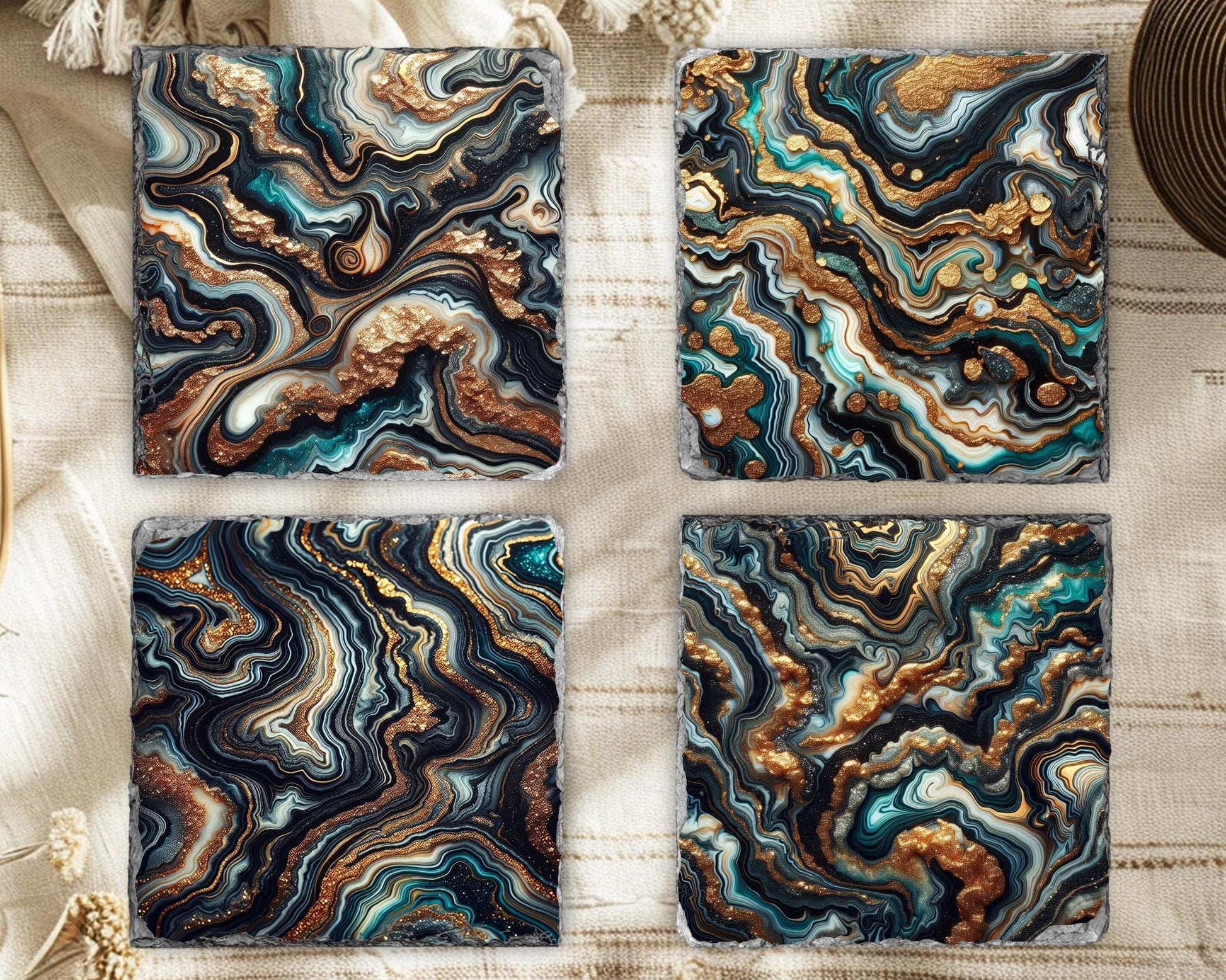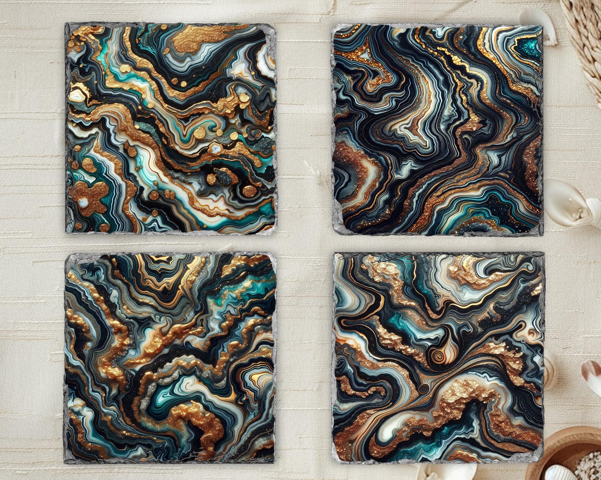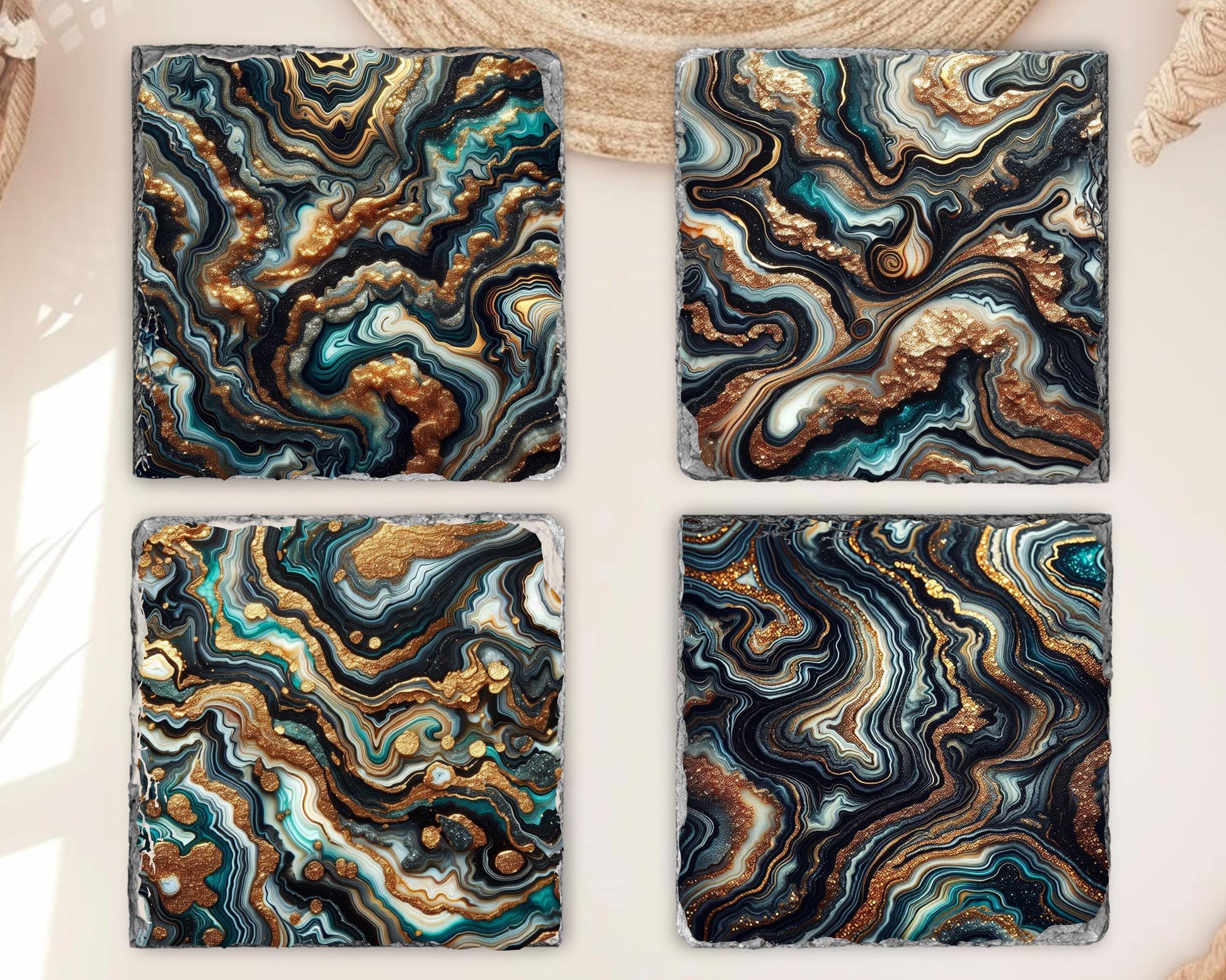 Experience the harmonious blend of bold elegance and natural beauty with our handcrafted slate coaster set. This unique collection features four coasters, each showcasing distinct designs inspired by agate, with a captivating palette of black, gold, and shimmering faux glitter silver. The swirling patterns evoke the allure of geodes and mineral formations, adding a sophisticated element to your home décor.
