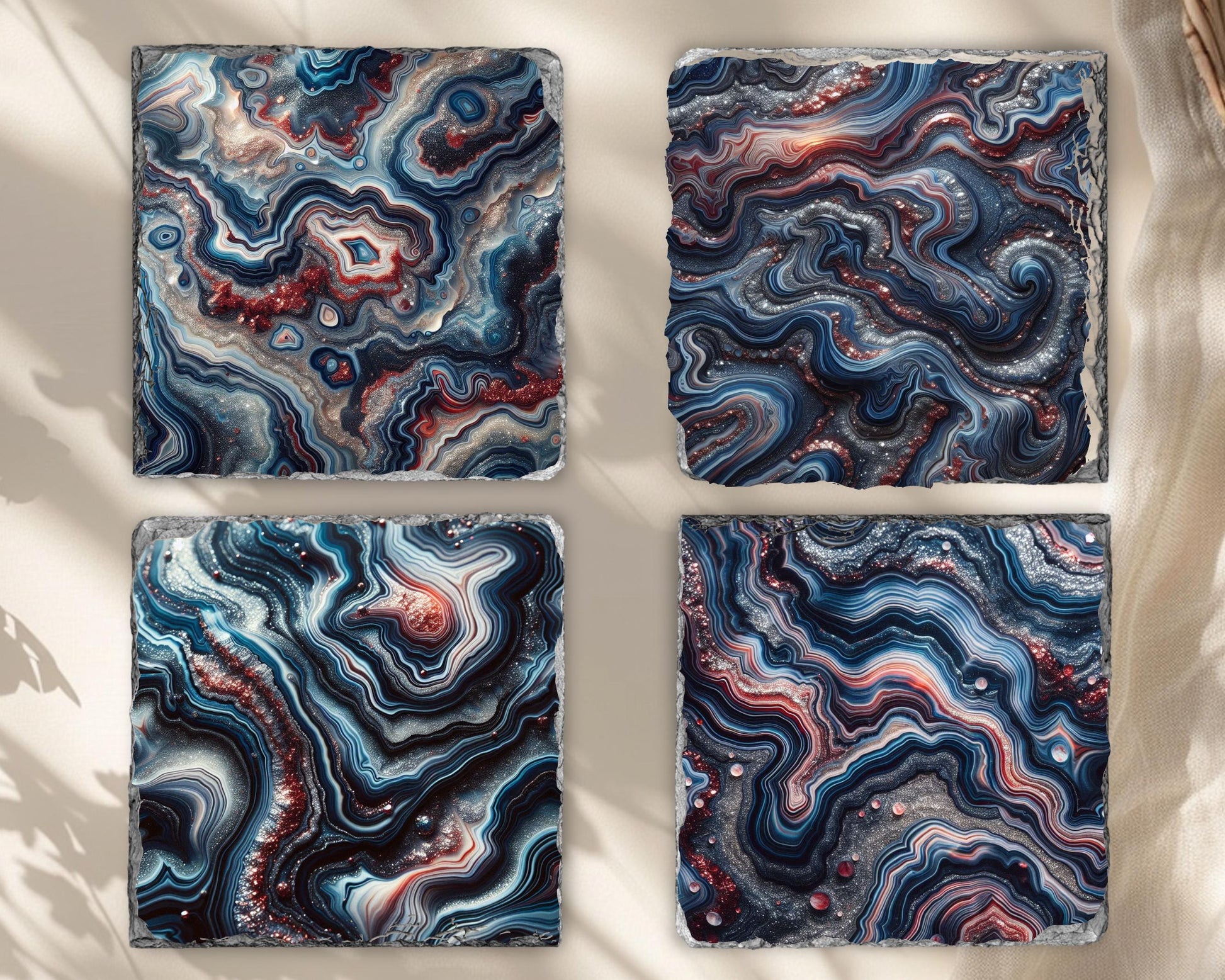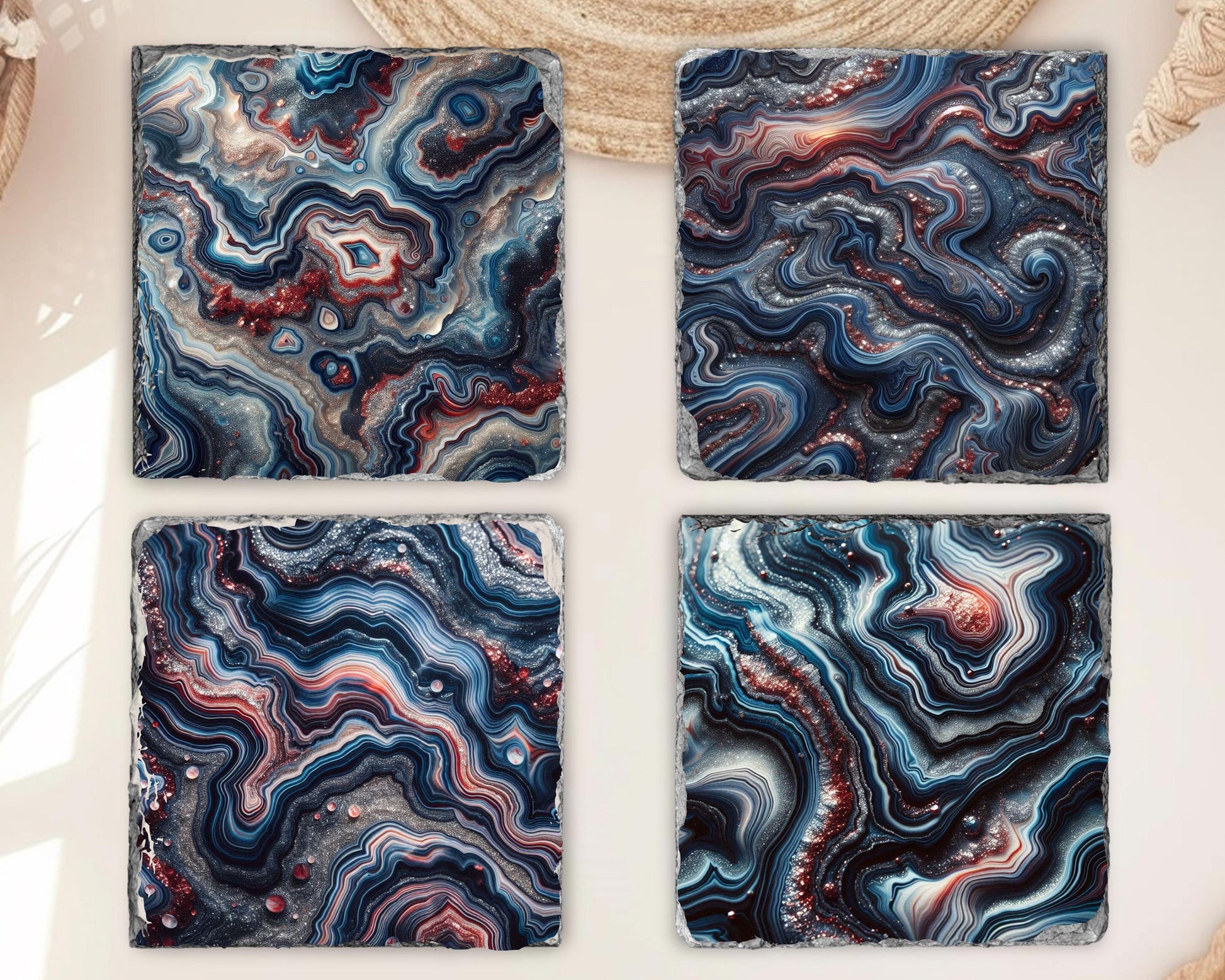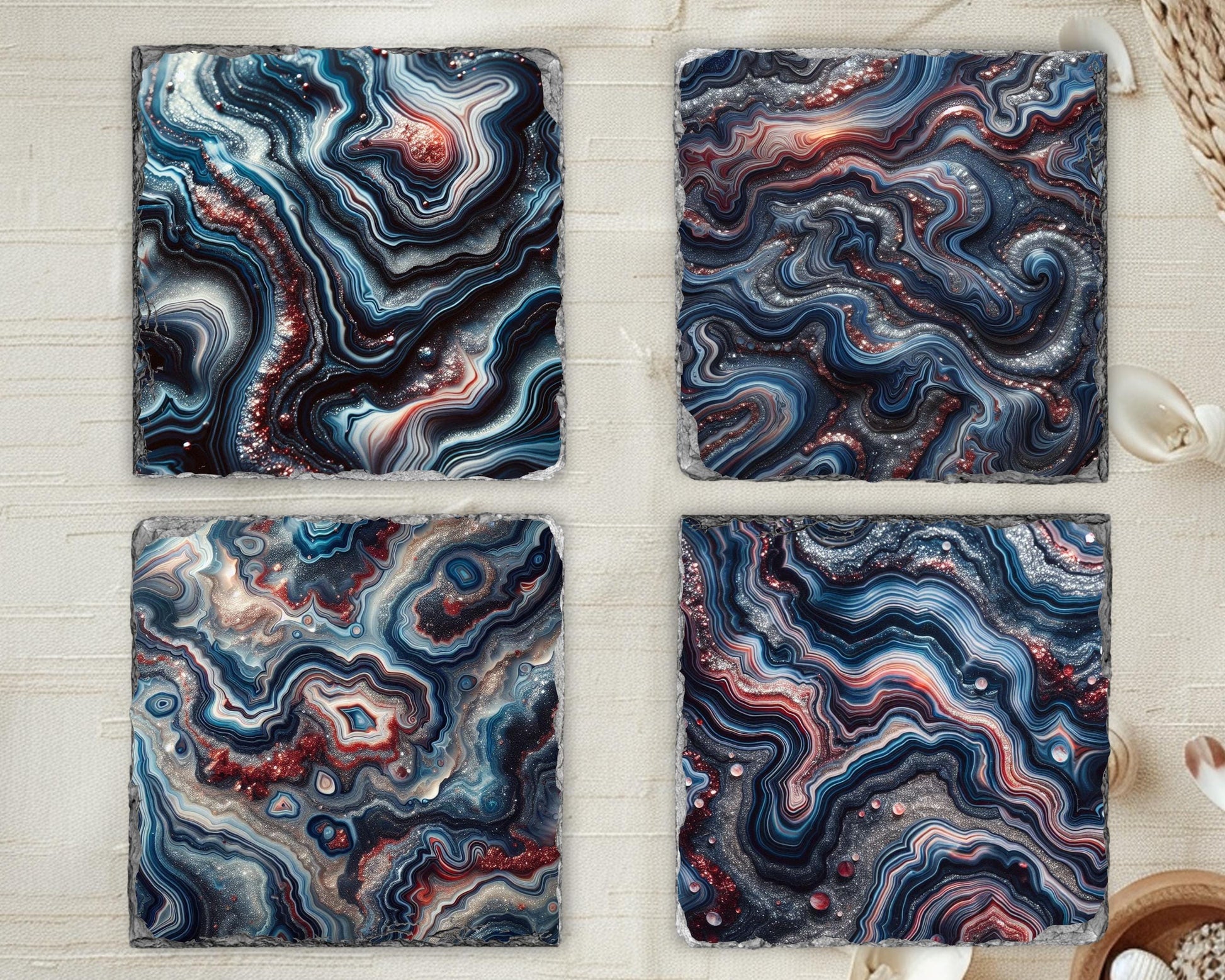 Enhance your home décor with our Slate Coaster Set, featuring four distinct agate-inspired designs that bring a touch of bold elegance to any table setting. Each coaster measures approximately 3.5 x 3.5 inches and showcases unique swirling patterns in deep steel blue, rich red, and shimmering faux glitter silver, beautifully complemented by the natural fractured edges of the slate.