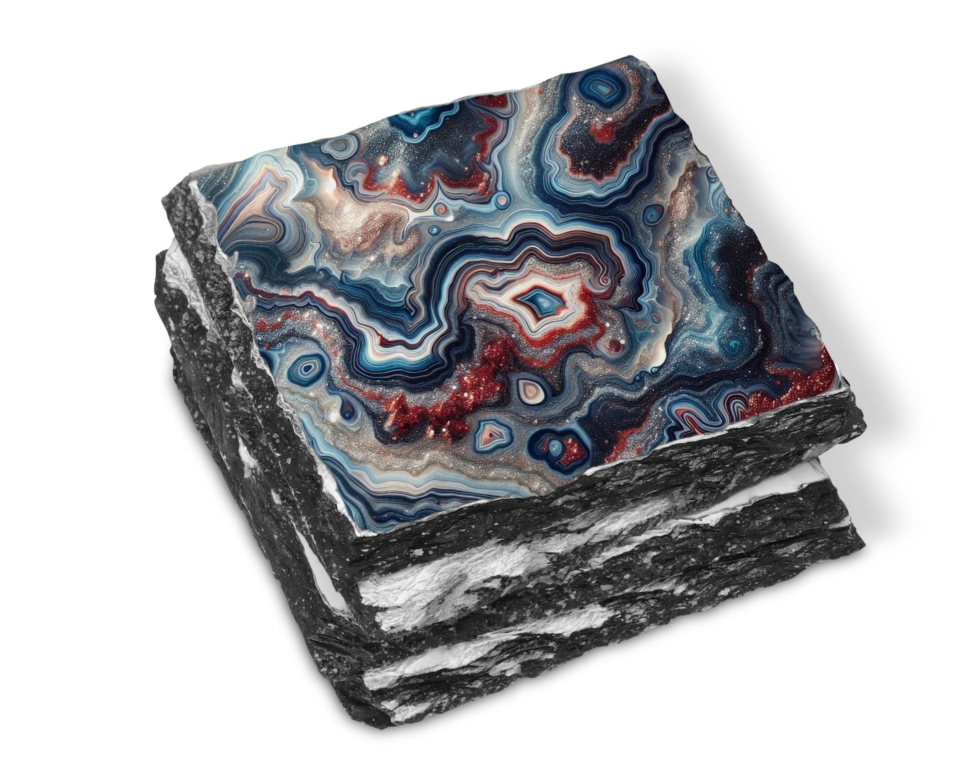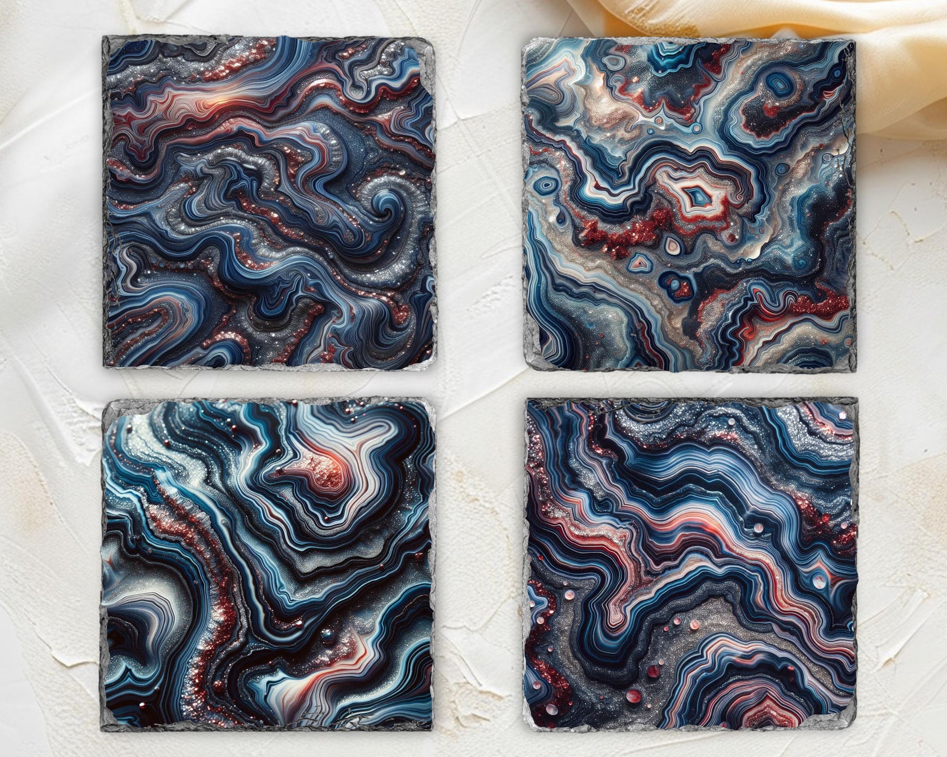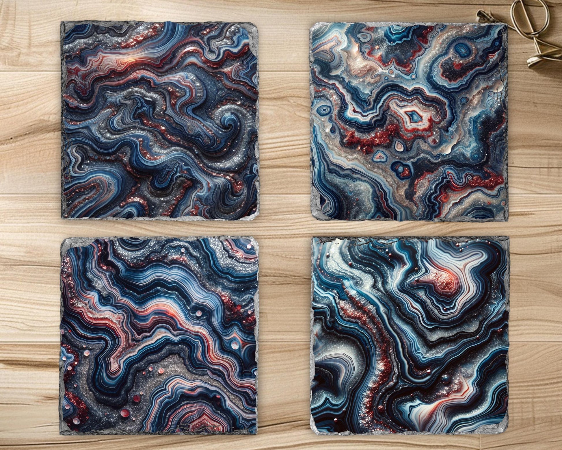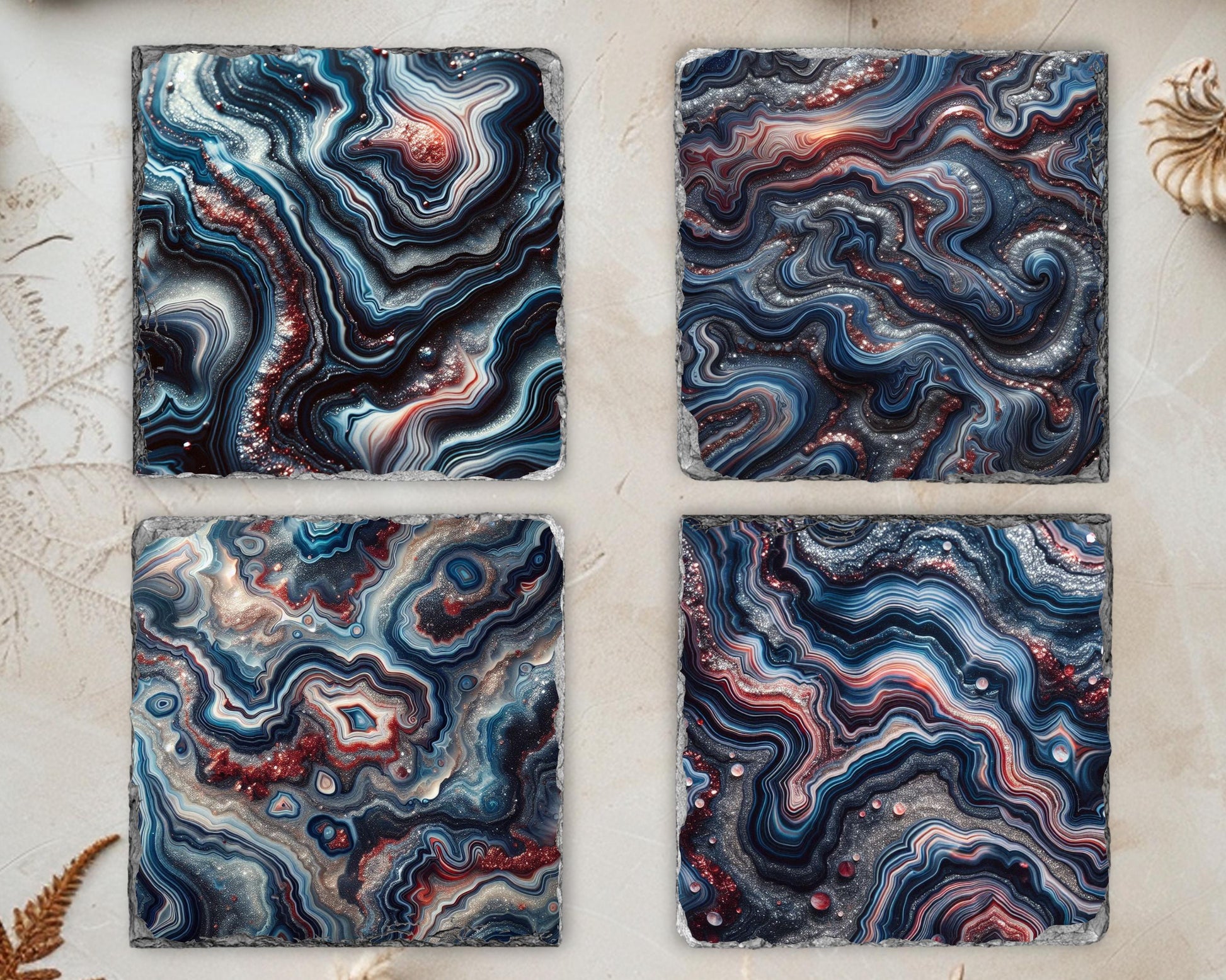 Enhance your home décor with our Slate Coaster Set, featuring four distinct agate-inspired designs that bring a touch of bold elegance to any table setting. Each coaster measures approximately 3.5 x 3.5 inches and showcases unique swirling patterns in deep steel blue, rich red, and shimmering faux glitter silver, beautifully complemented by the natural fractured edges of the slate.