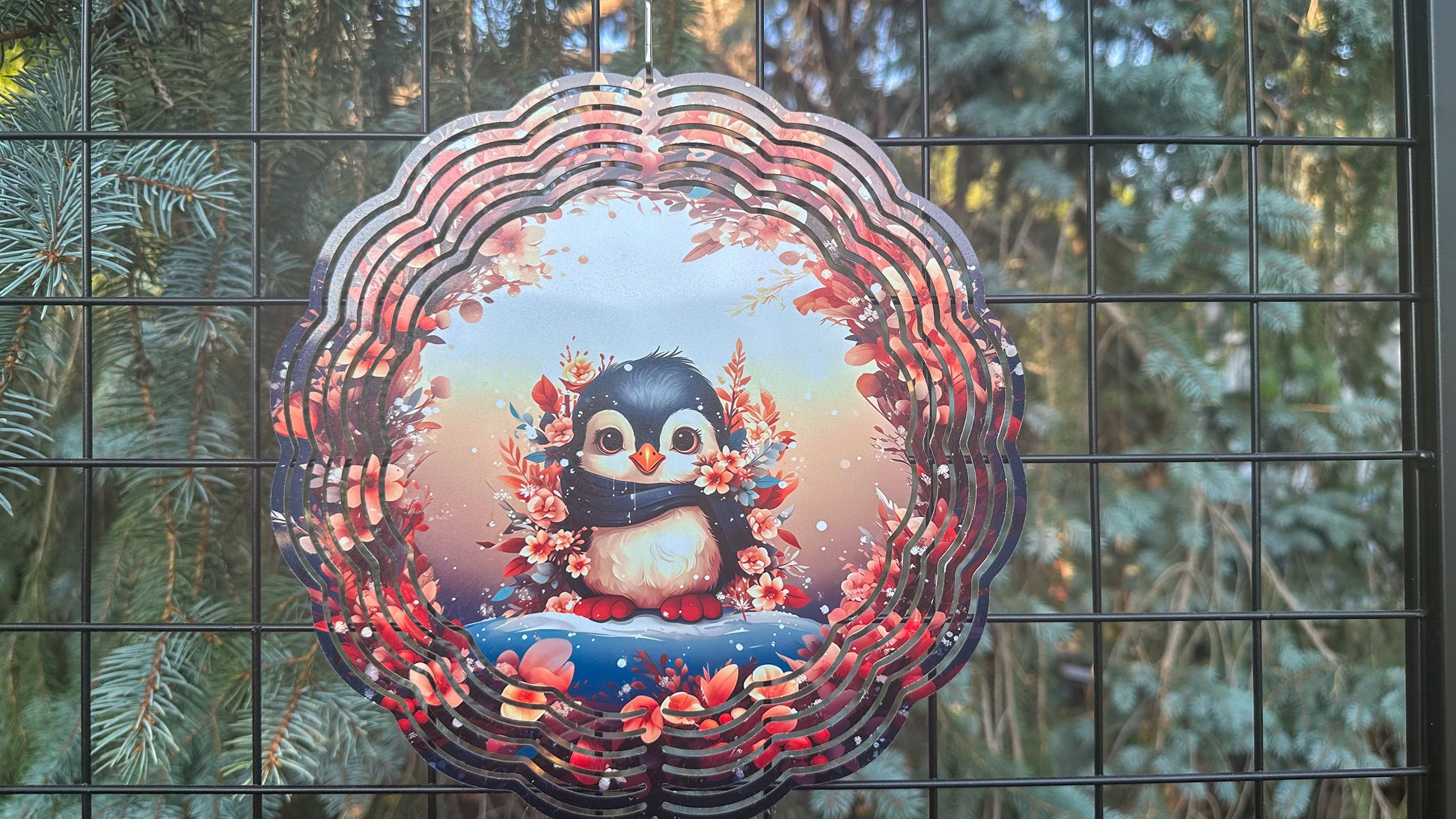 Introducing the charming Baby Penguin Wind Spinner, a delightful addition to your yard décor. Measuring 10 inches by 10 inches and crafted from durable aluminum, this spinner features an adorable 3D baby penguin design that is sure to bring a smile to your face.