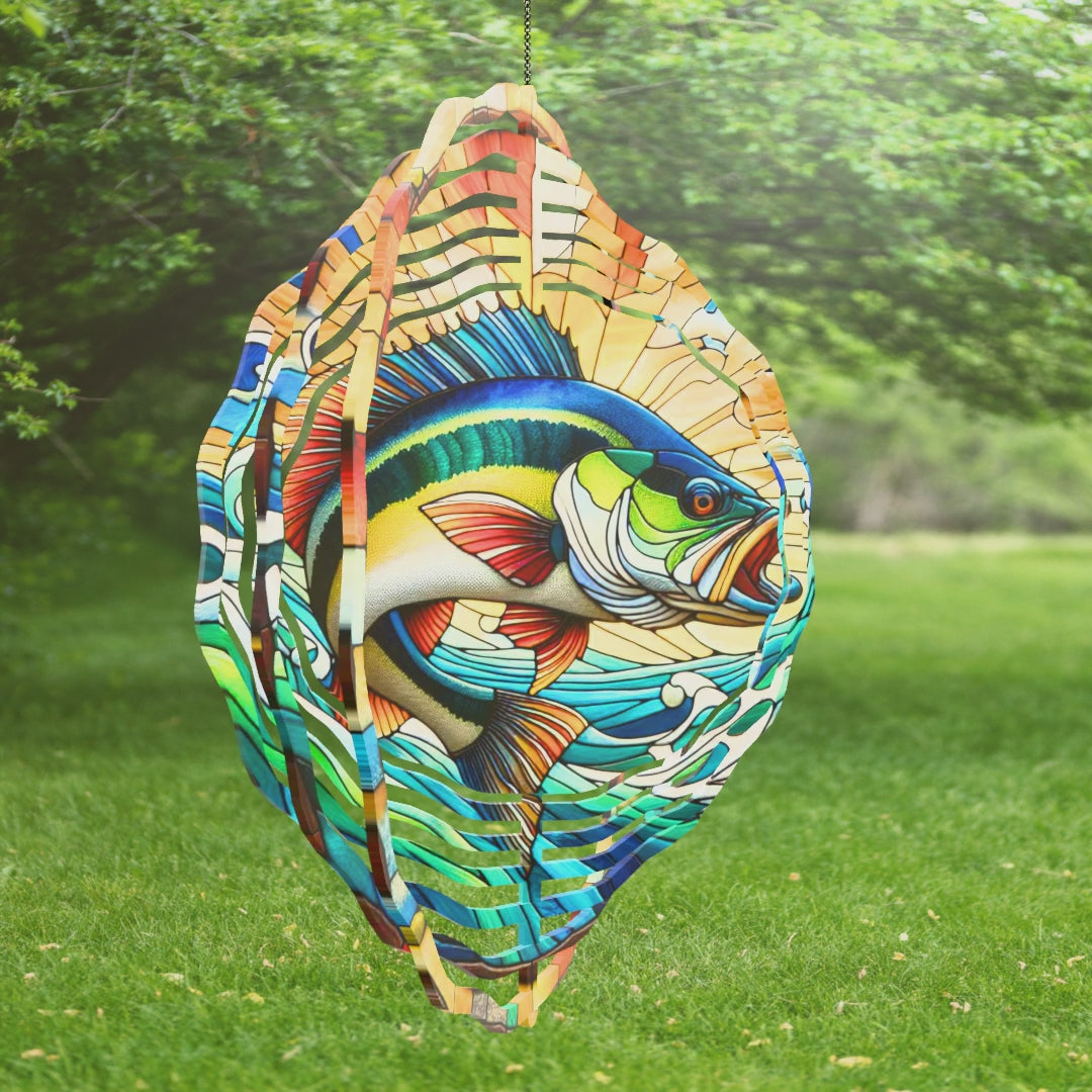 Bass Fish Wind Spinner, Stained Glass Wind Spinner, Unique Gift for Fathers Day, Hanging Wind Spinner for Porch, 3D Metal Garden Spinner
