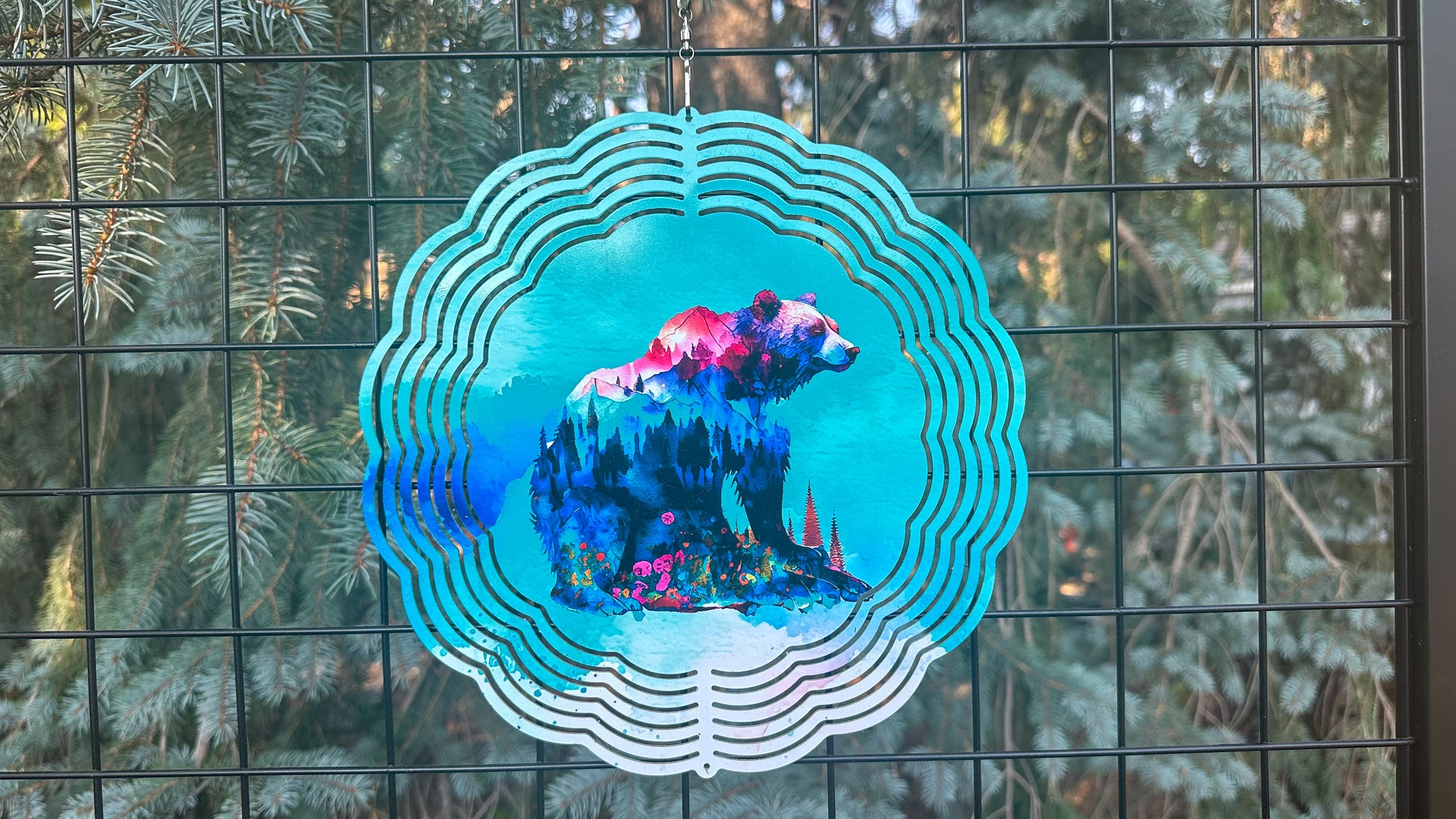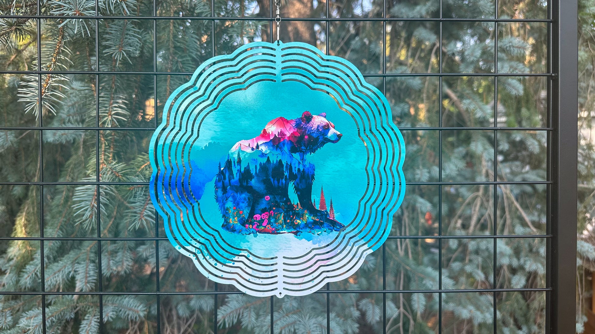 Introducing our vibrant 10-inch 3D Wind Spinner featuring a charming bear design set against a backdrop of majestic mountains—an ideal gift for any bear enthusiast.