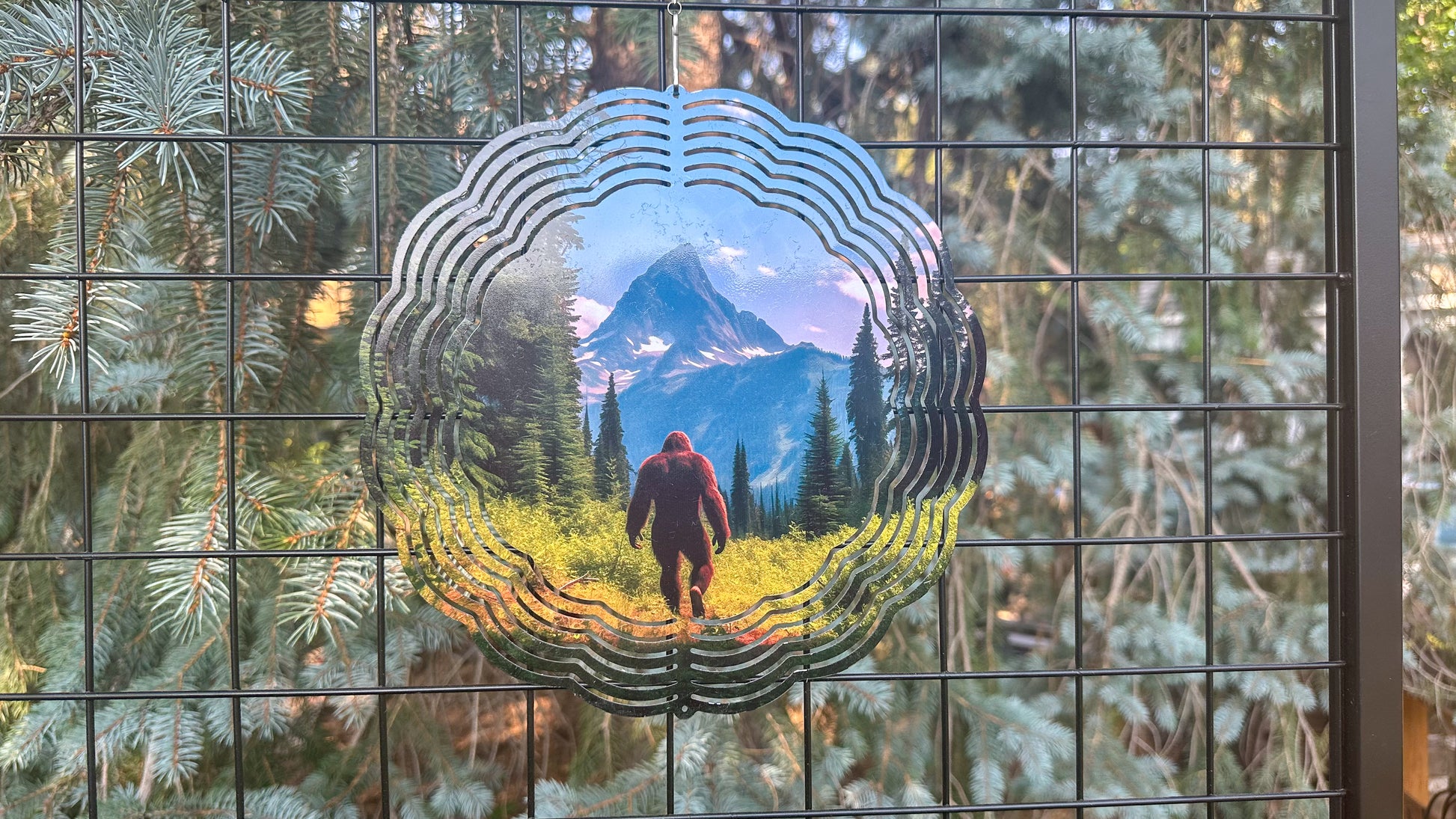 Transform your outdoor space with this charming 10-inch Bigfoot wind spinner, perfect for adding a touch of whimsy to your garden or patio. Crafted from durable aluminum, this unique decor piece features a delightful design of Bigfoot wandering through the forest, printed on both sides for a captivating view from any angle.
