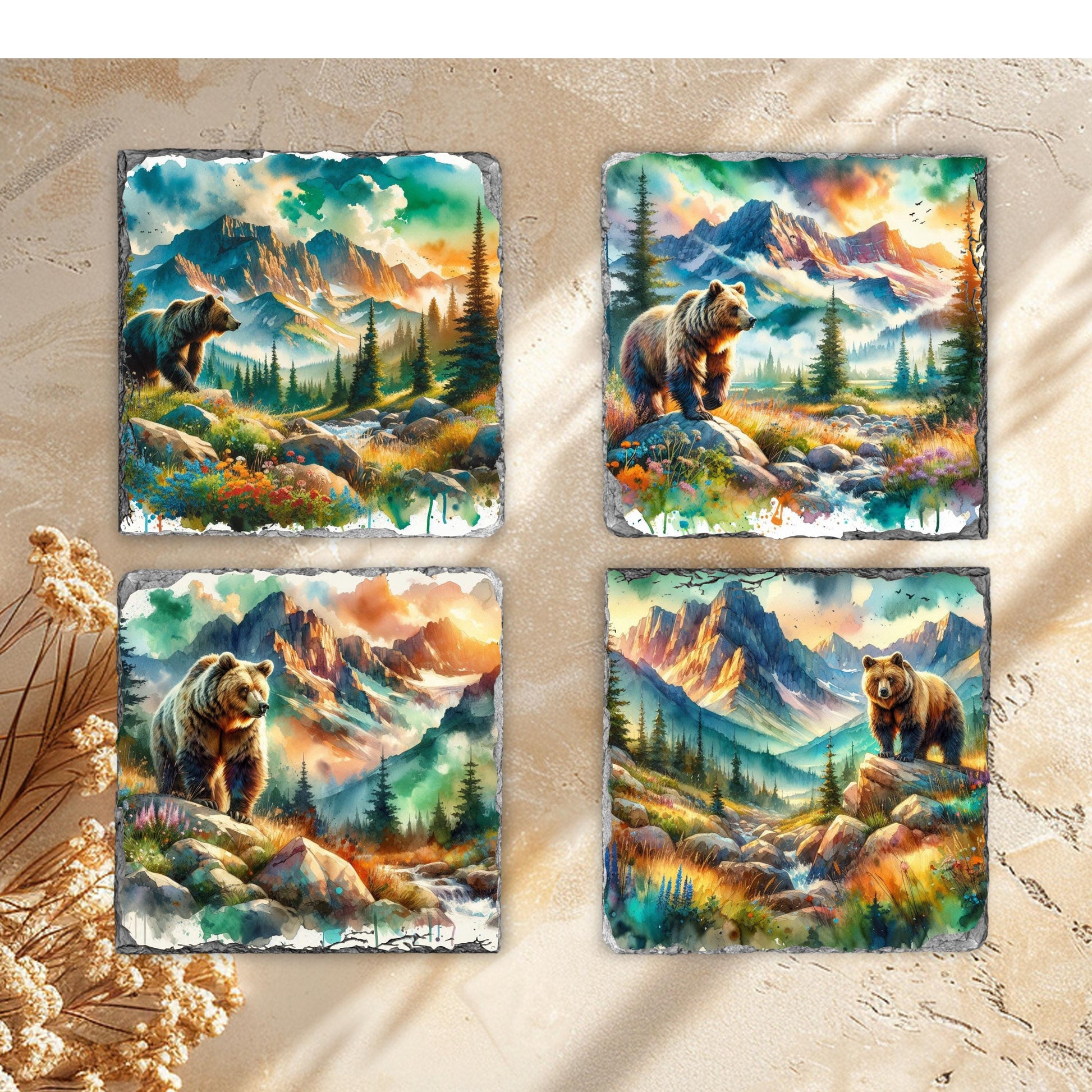Discover the beauty of nature with this handcrafted slate coaster set, featuring four unique images of a majestic brown bear in a mountain setting, rendered with a beautiful watercolor effect. Each coaster measures 3.5 by 3.5 inches with fractured edges, giving them a natural, rustic look that highlights their handcrafted quality. The sublimation printing process ensures vibrant, detailed images that are durable and resistant to fading, making these coasters both functional and artistic.