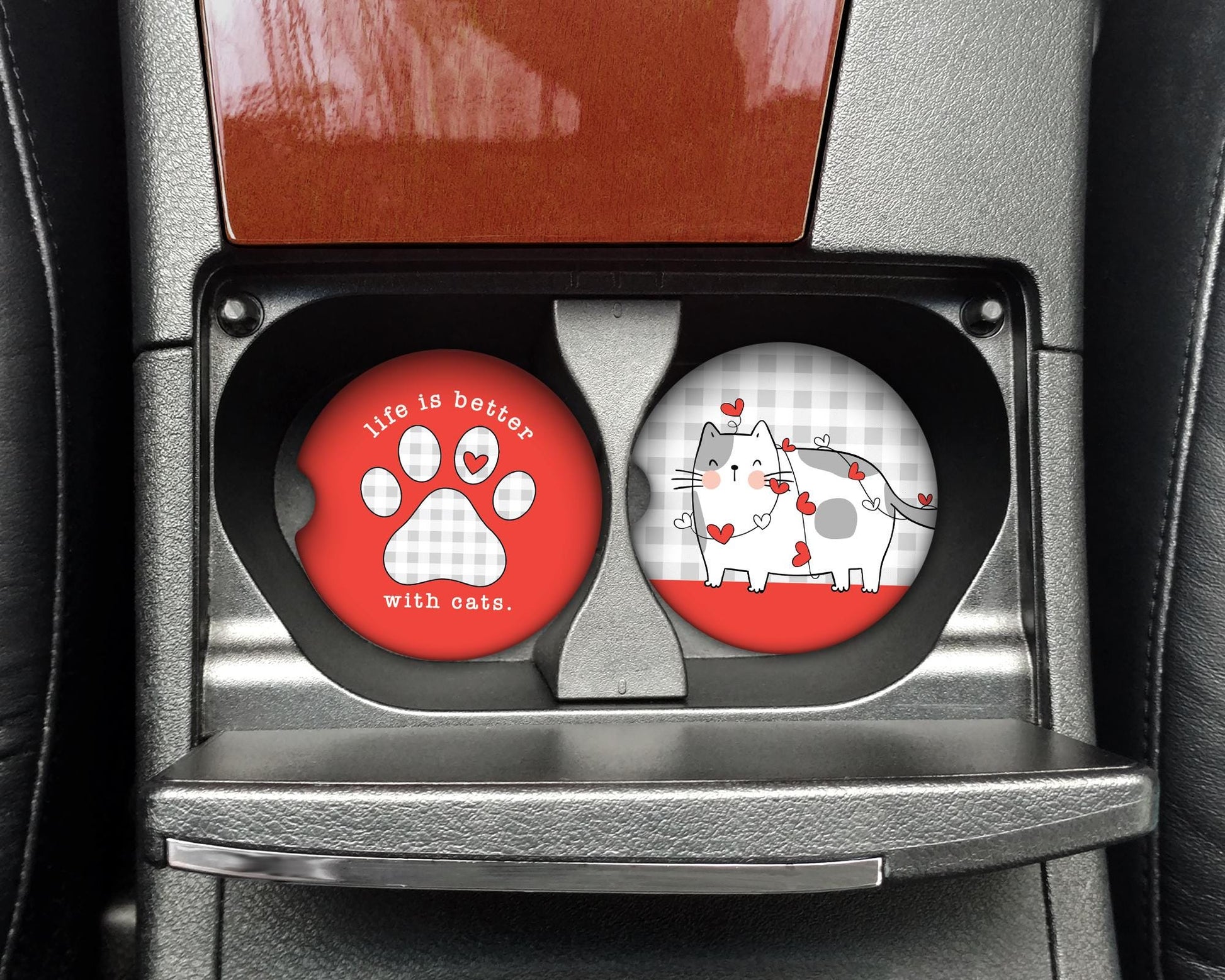 Add a touch of feline charm to your car with this adorable set of 2 ceramic car coasters! One coaster showcases a paw print and the sweet sentiment Life is better with cats, while the other features a cute cat surrounded by a string of red and white hearts. Keep your cup holders stylish and protected with these charming coasters!