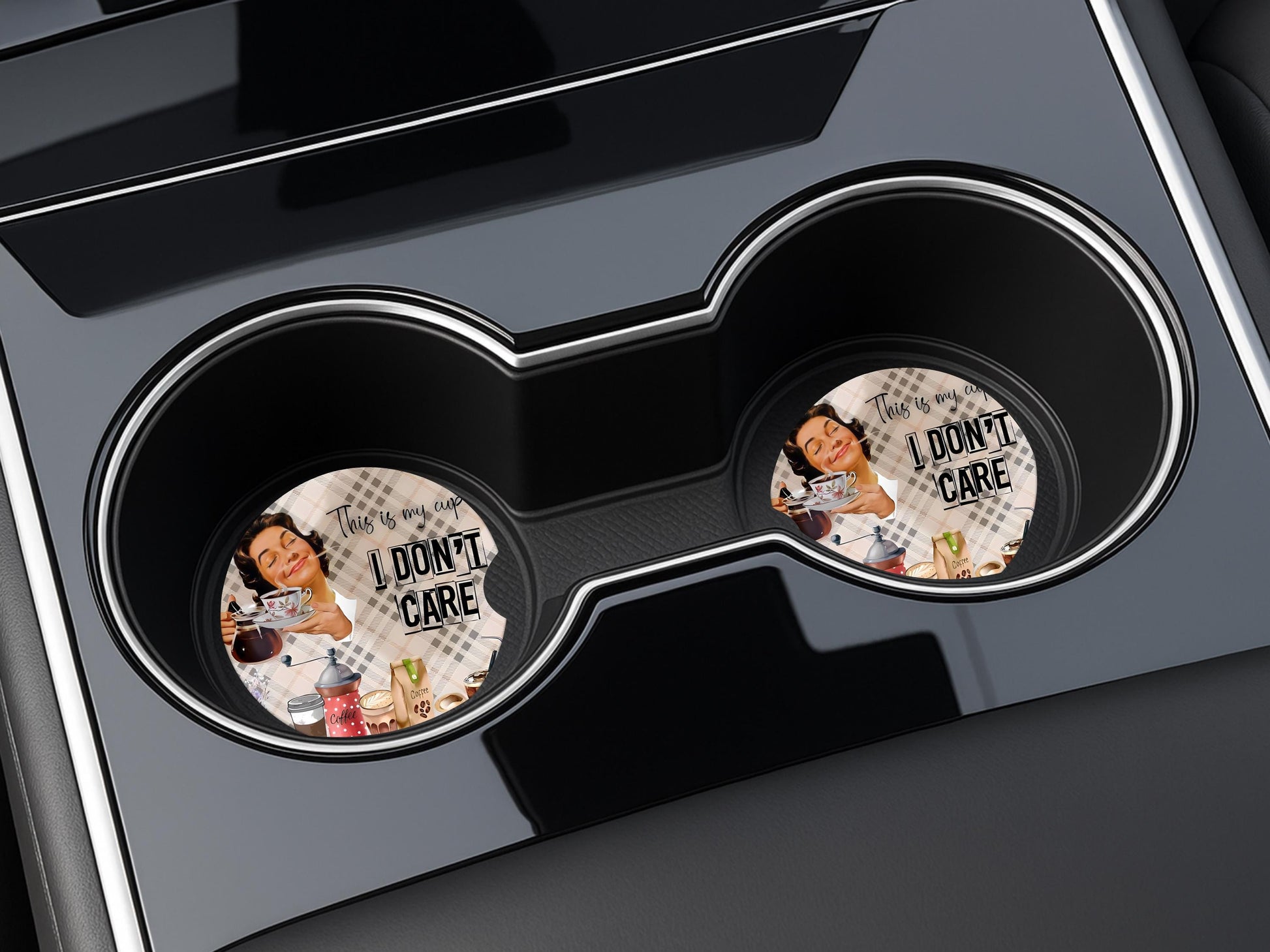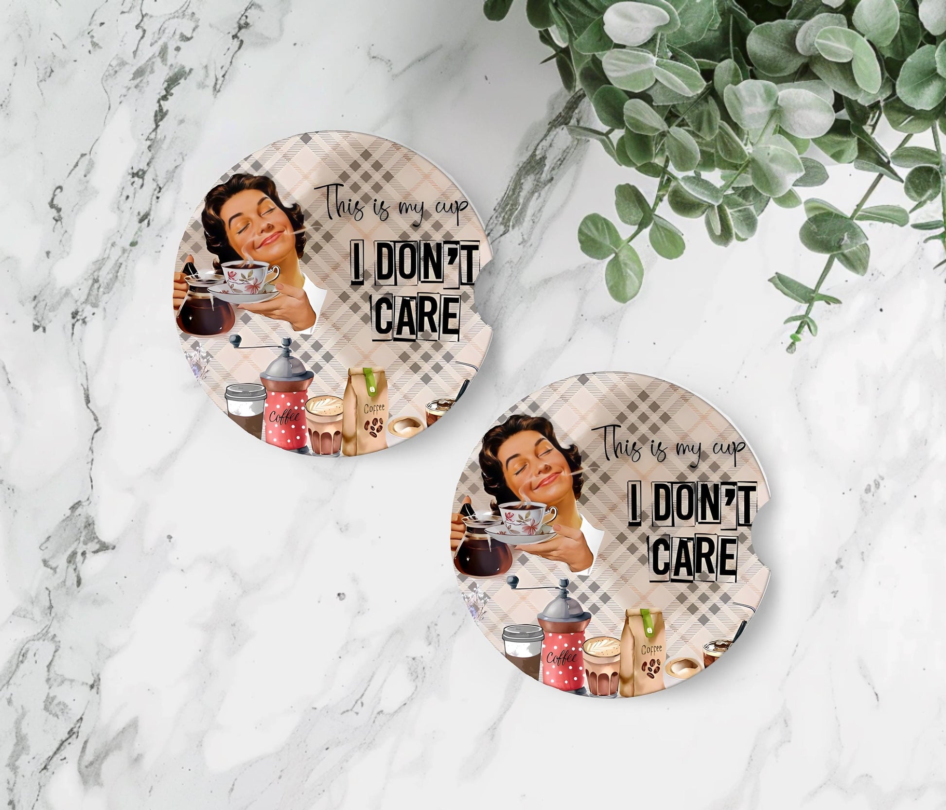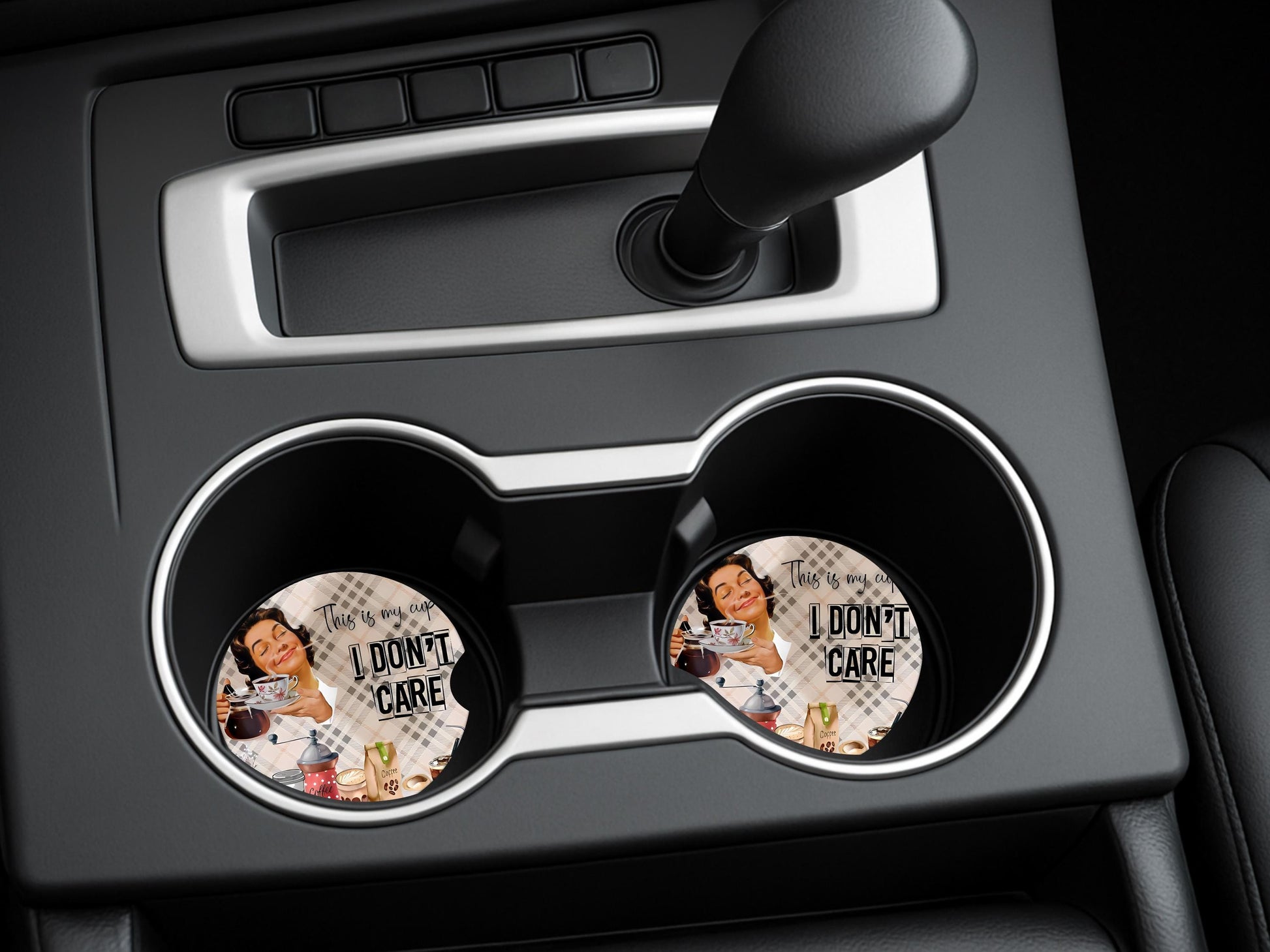 Add a touch of vintage charm to your car with these Ceramic Car Coasters! Each coaster showcases a sassy 50's housewife holding a coffee cup with the quote This is my cup, I Don't Care. Available as a single coaster or a set of two, these coasters are perfect for keeping your cup holders clean and stylish. Make a statement with your morning commute!