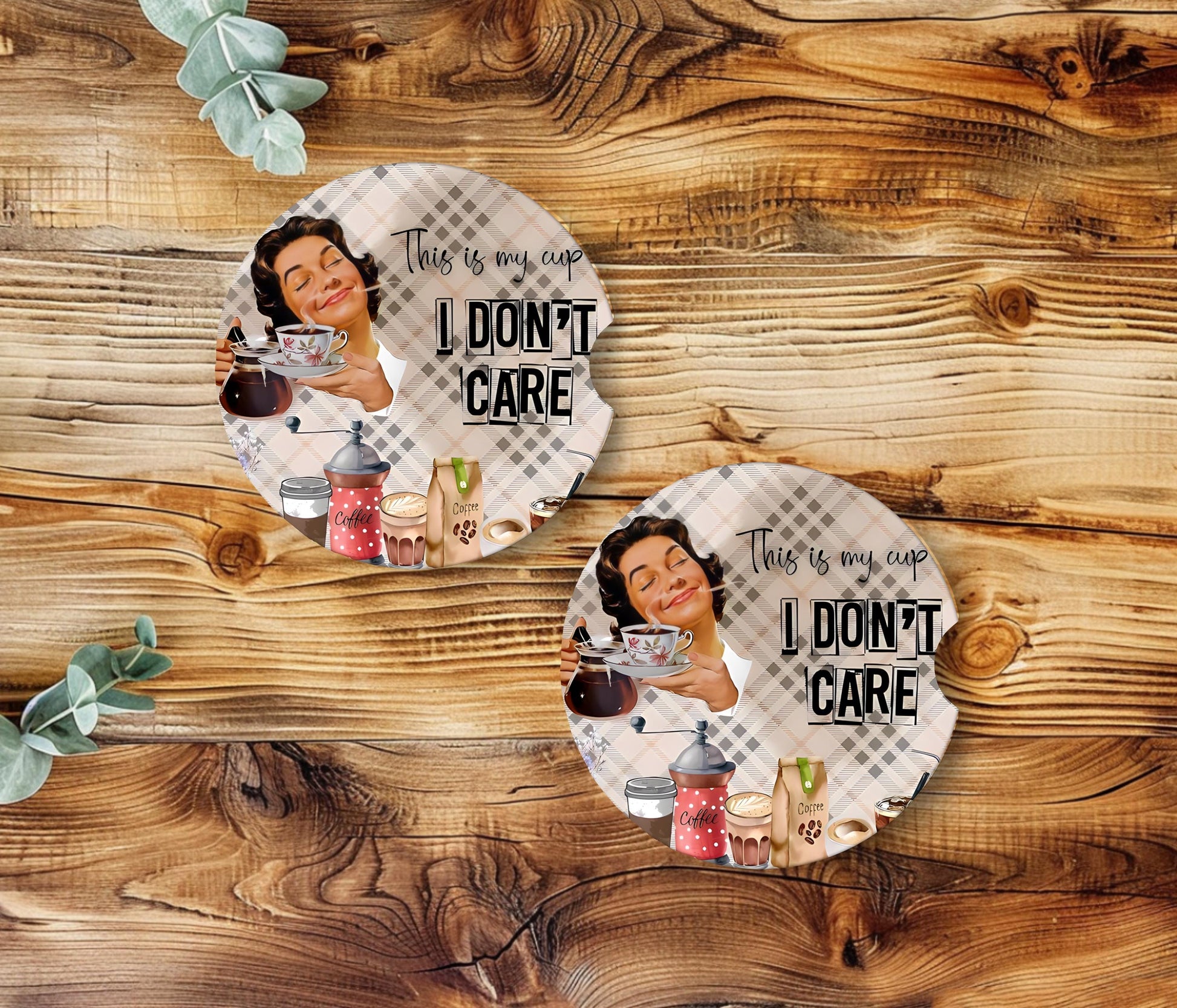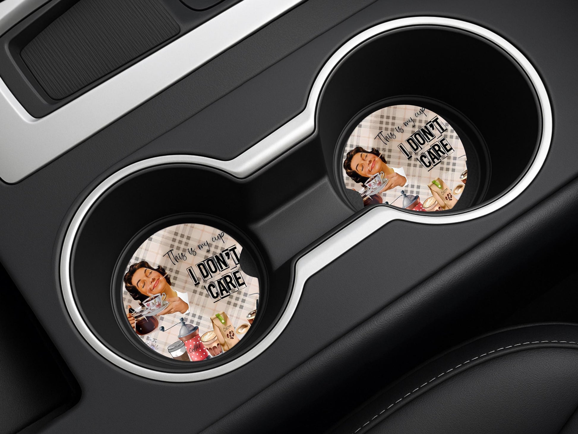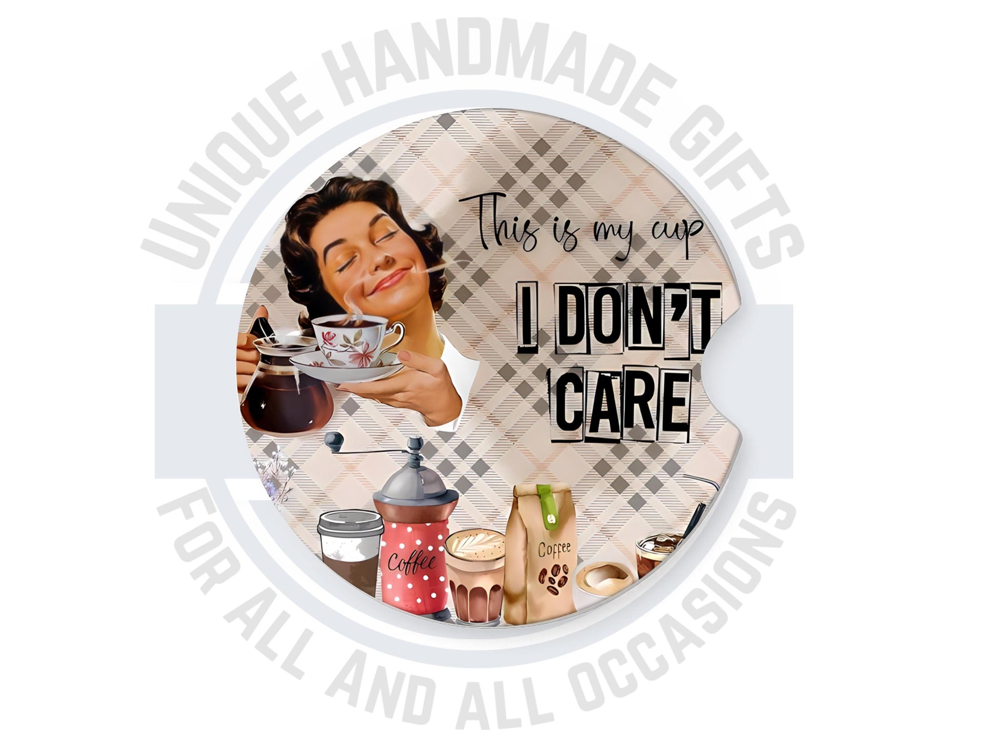 Add a touch of vintage charm to your car with these Ceramic Car Coasters! Each coaster showcases a sassy 50's housewife holding a coffee cup with the quote This is my cup, I Don't Care. Available as a single coaster or a set of two, these coasters are perfect for keeping your cup holders clean and stylish. Make a statement with your morning commute!