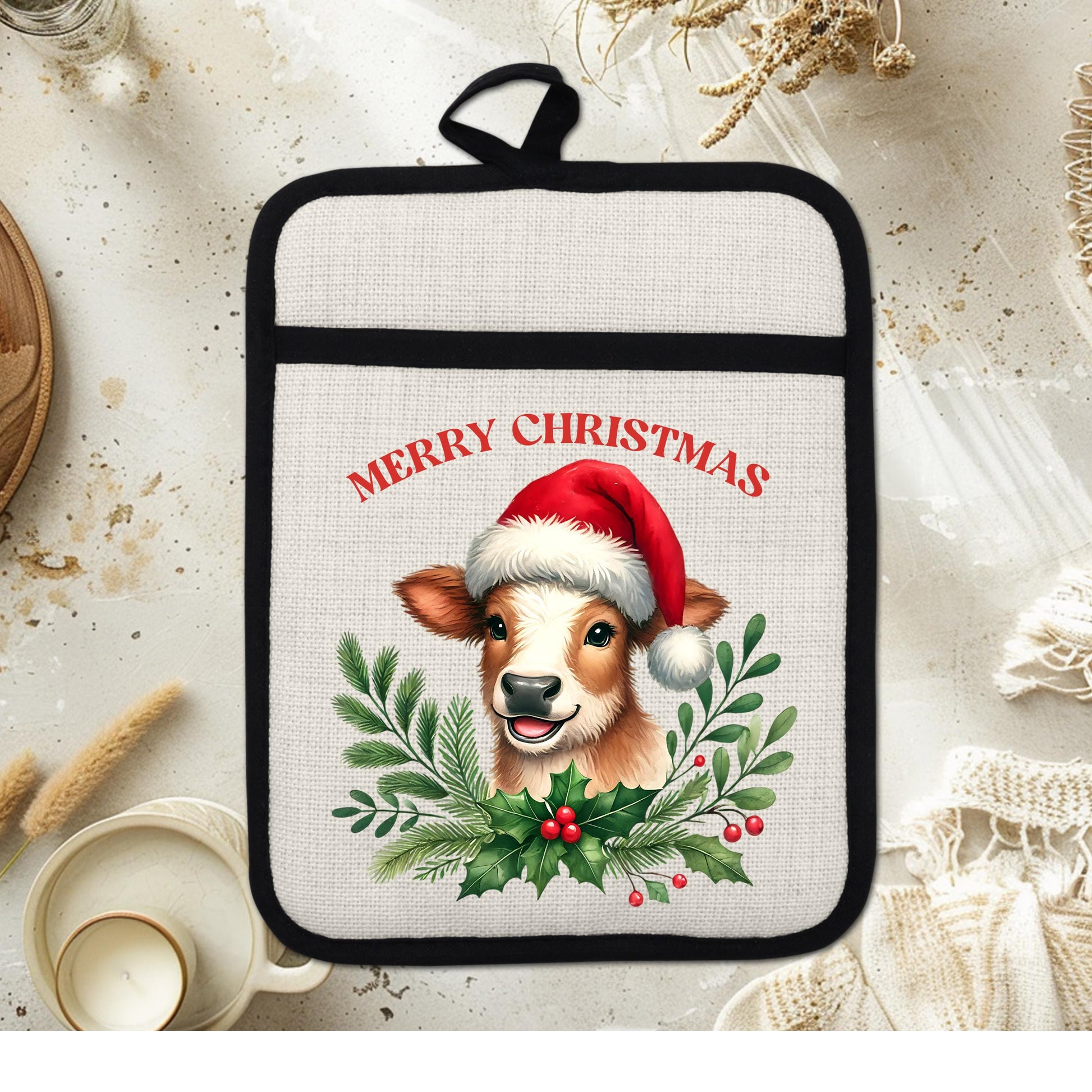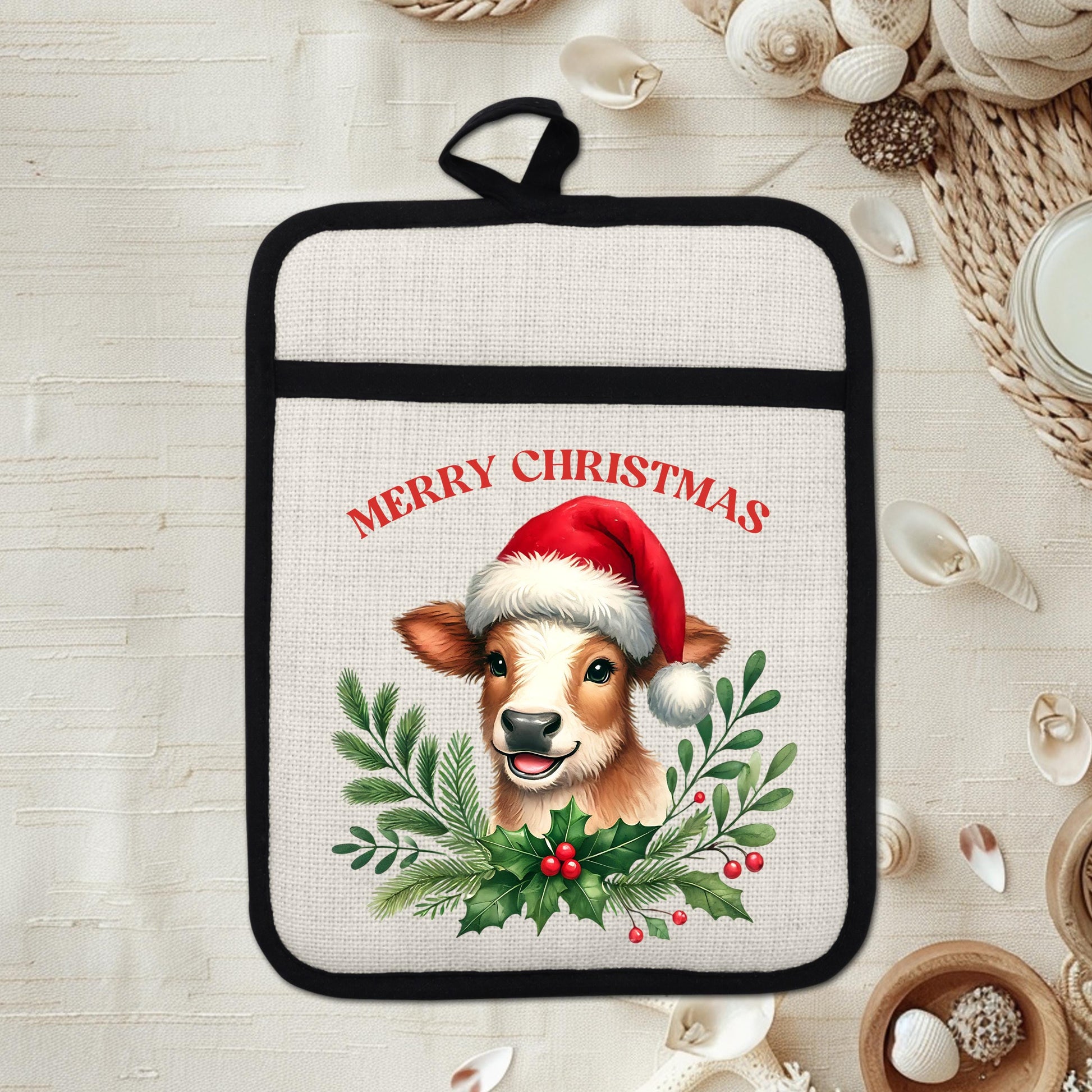 Add a festive touch to your kitchen with this charming pot holder featuring a delightful brown and white calf adorned with a Santa hat. Surrounded by holly and Christmas greenery, the design is complemented by the cheerful message “Merry Christmas,” making it an ideal accessory for your holiday cooking or a thoughtful gift for friends and family.
