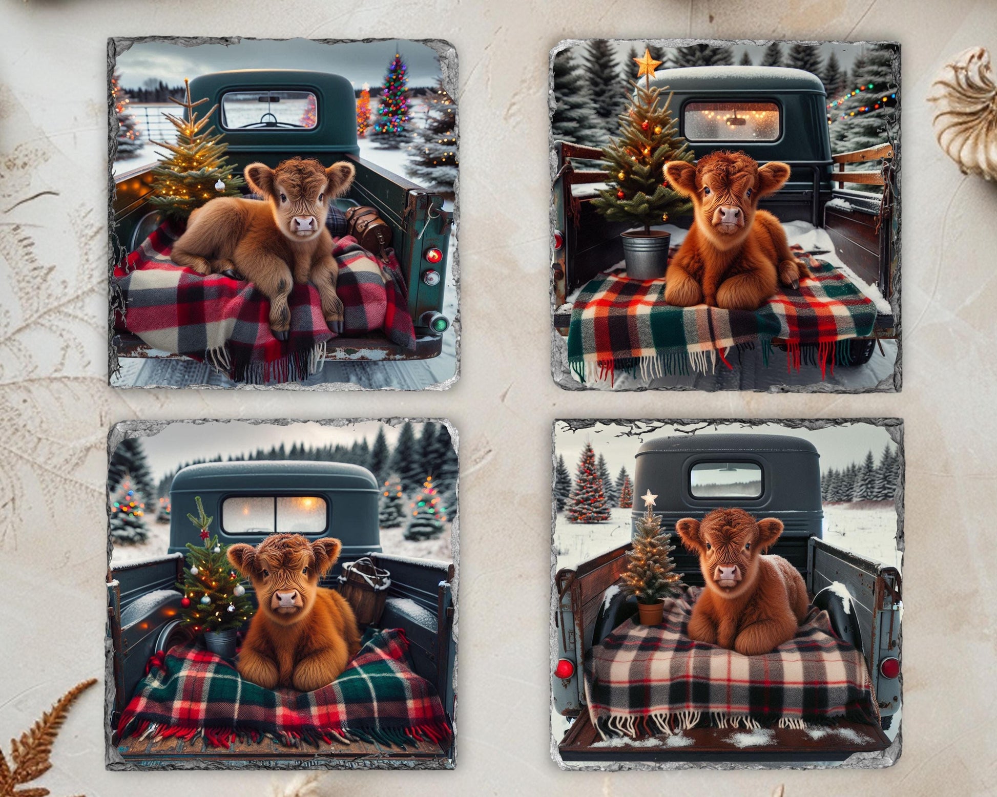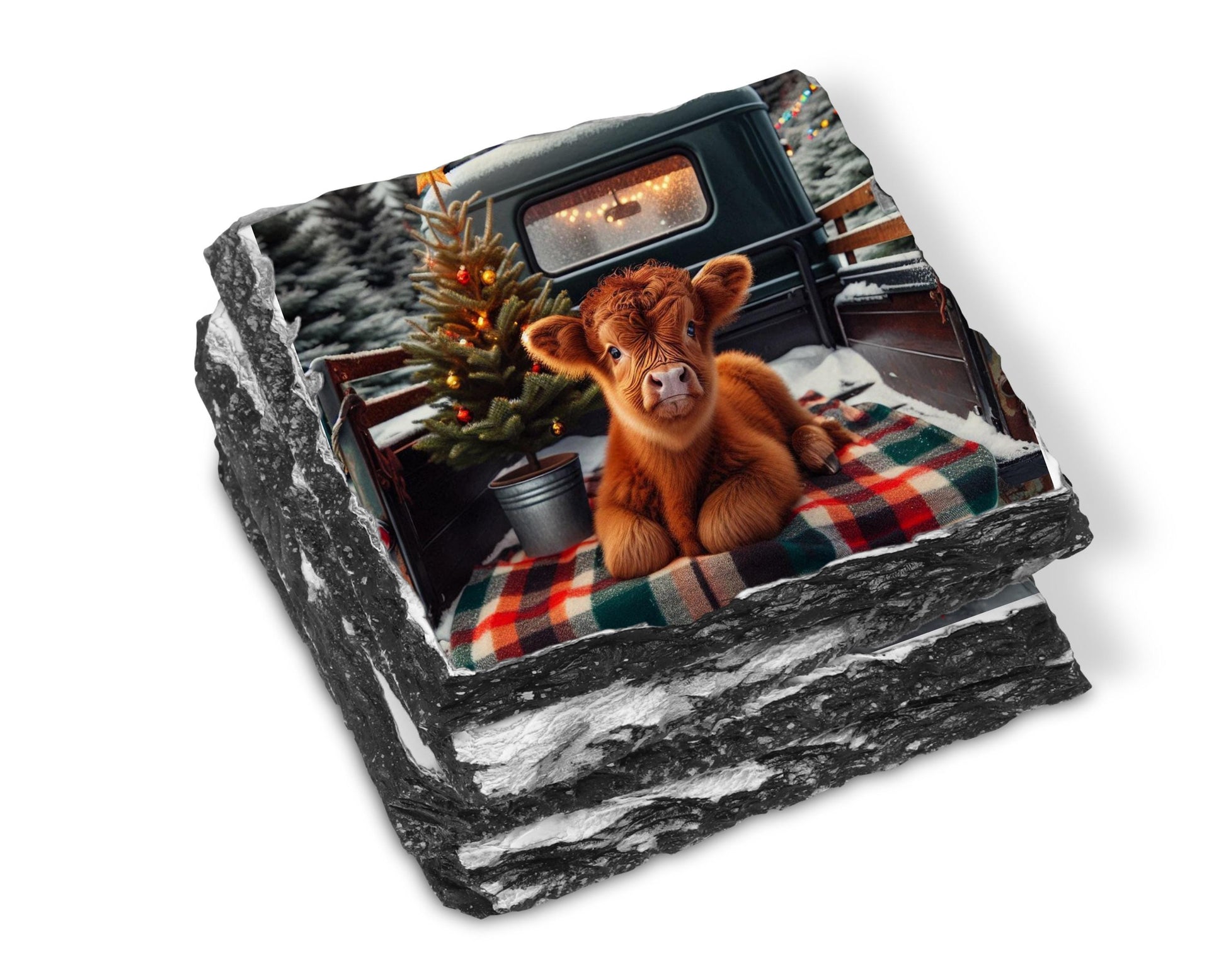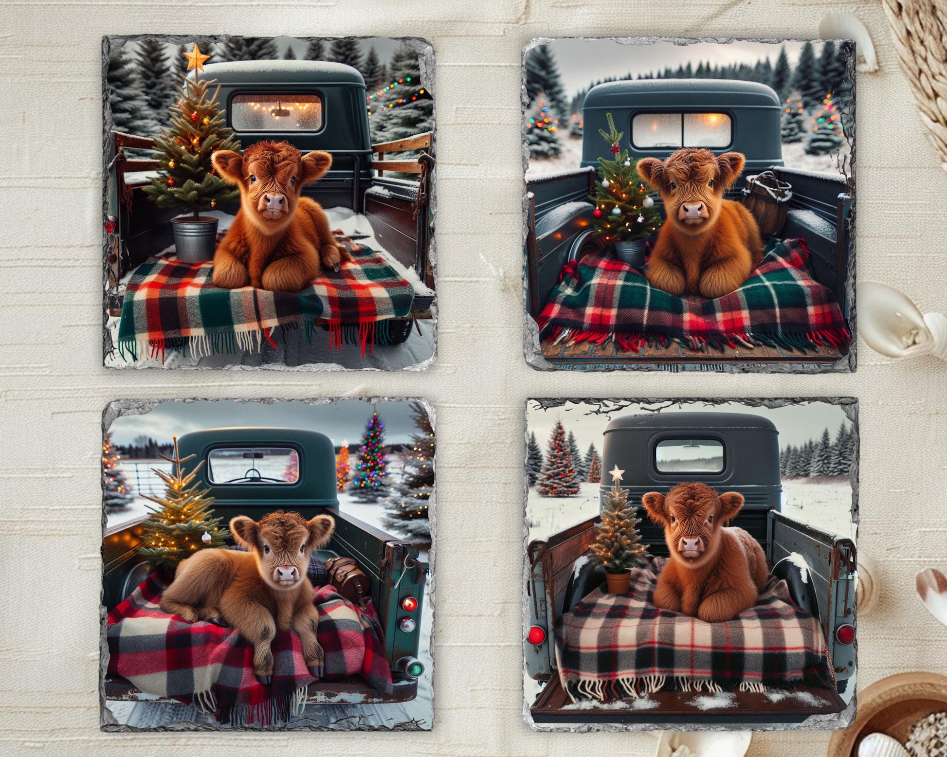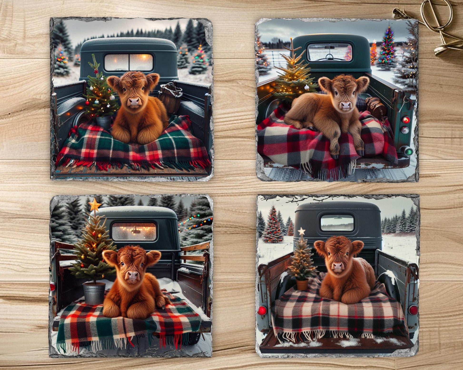 Highland Cow Christmas Coaster Set with Rack - Rustic Slate Coasters Featuring Baby Cow in Truck Perfect for Farmhouse Decor