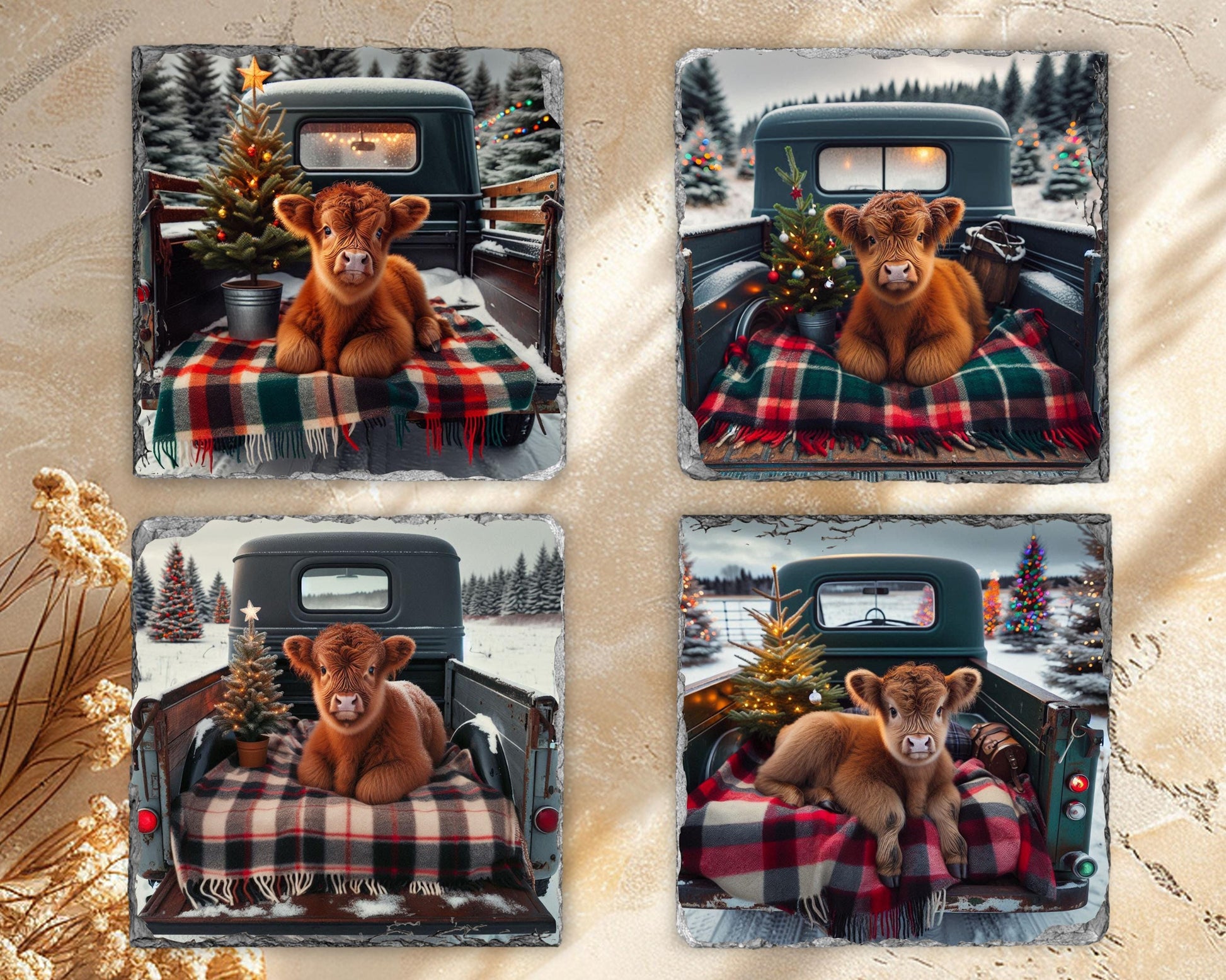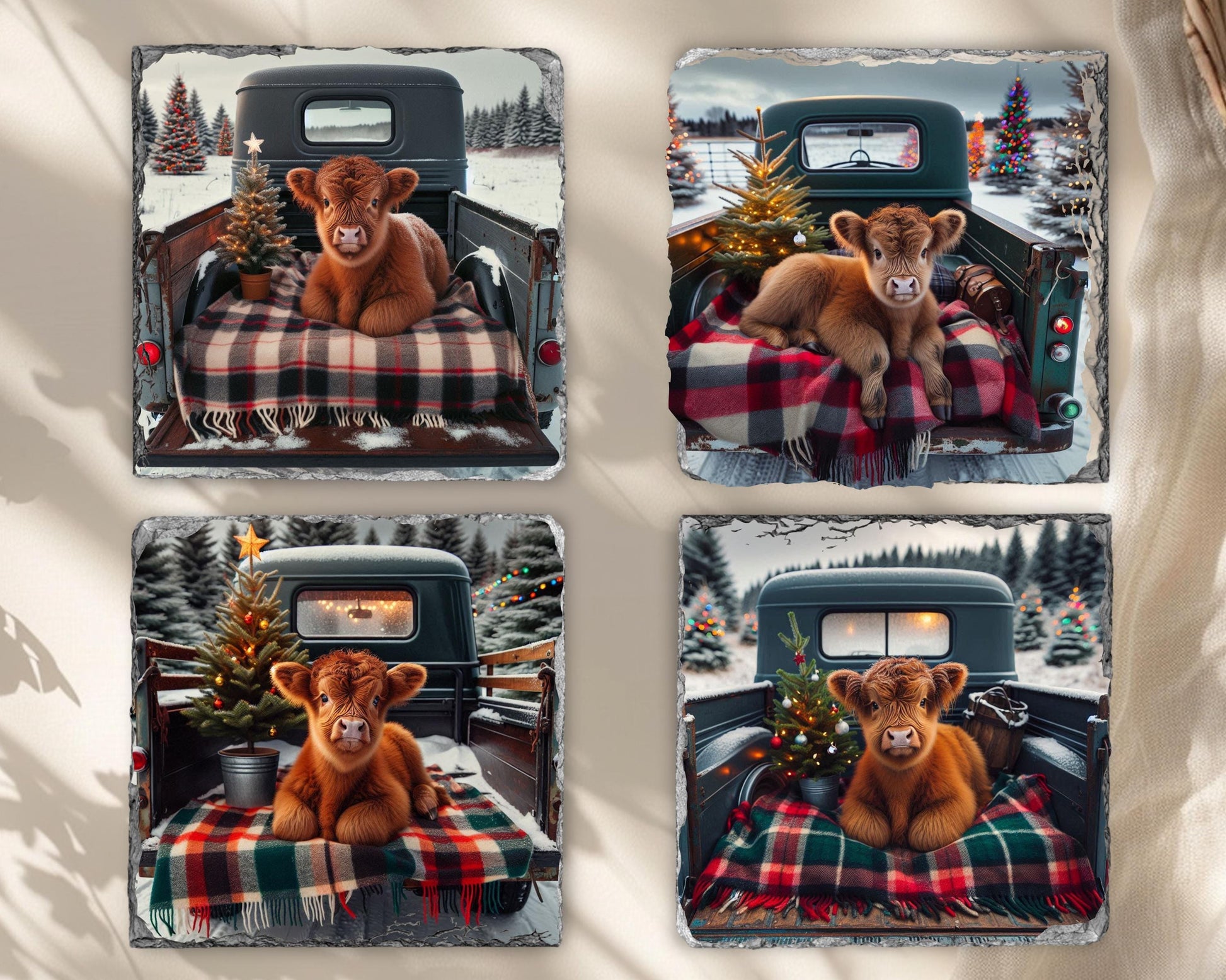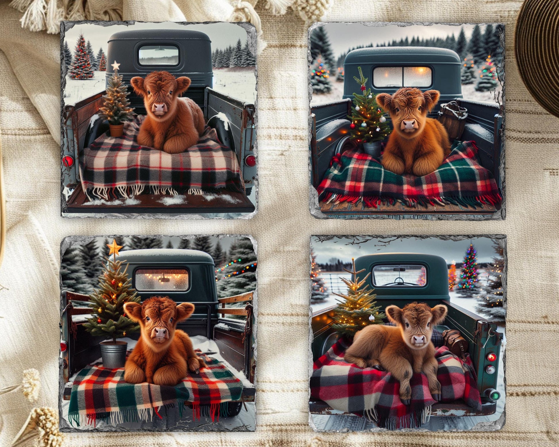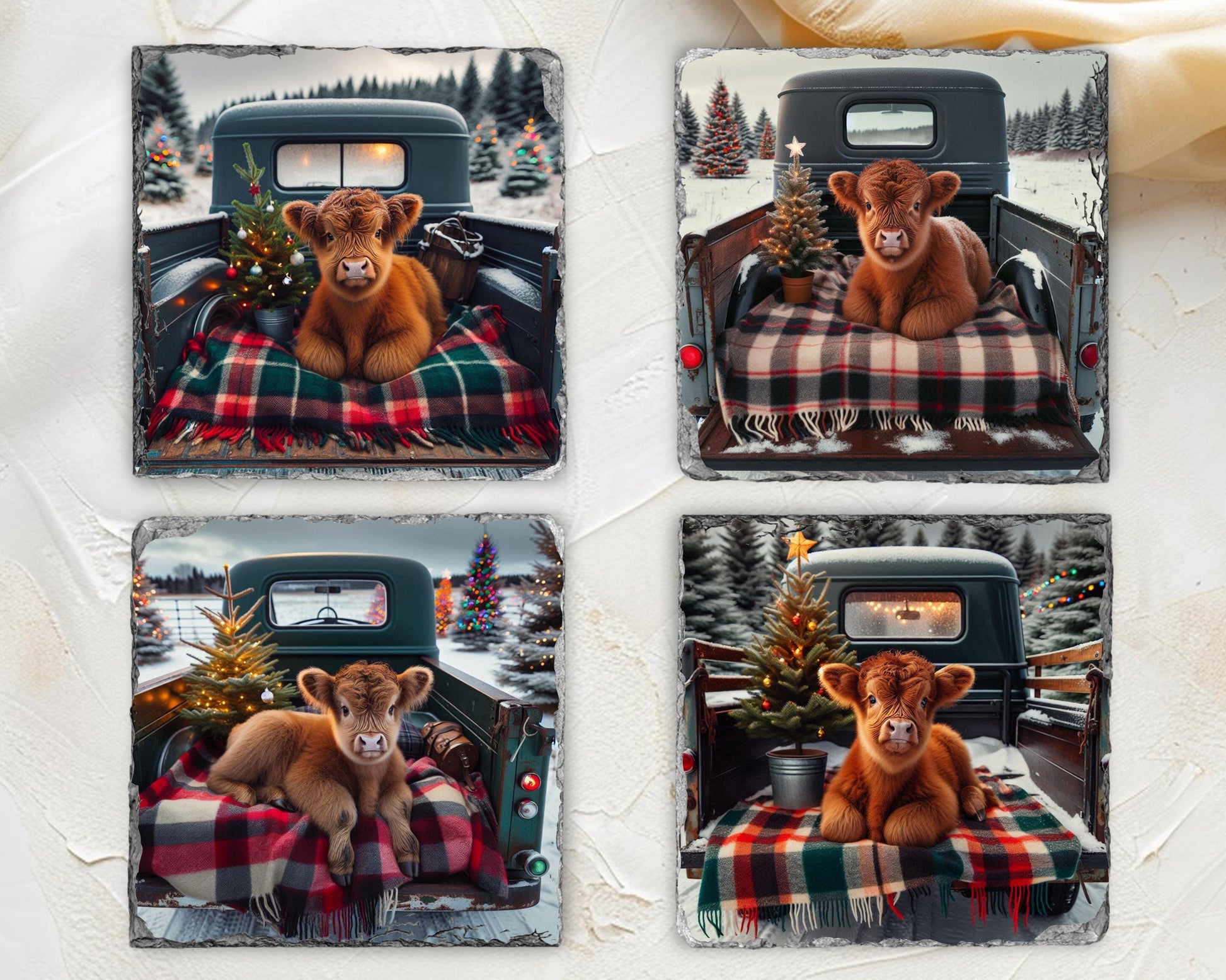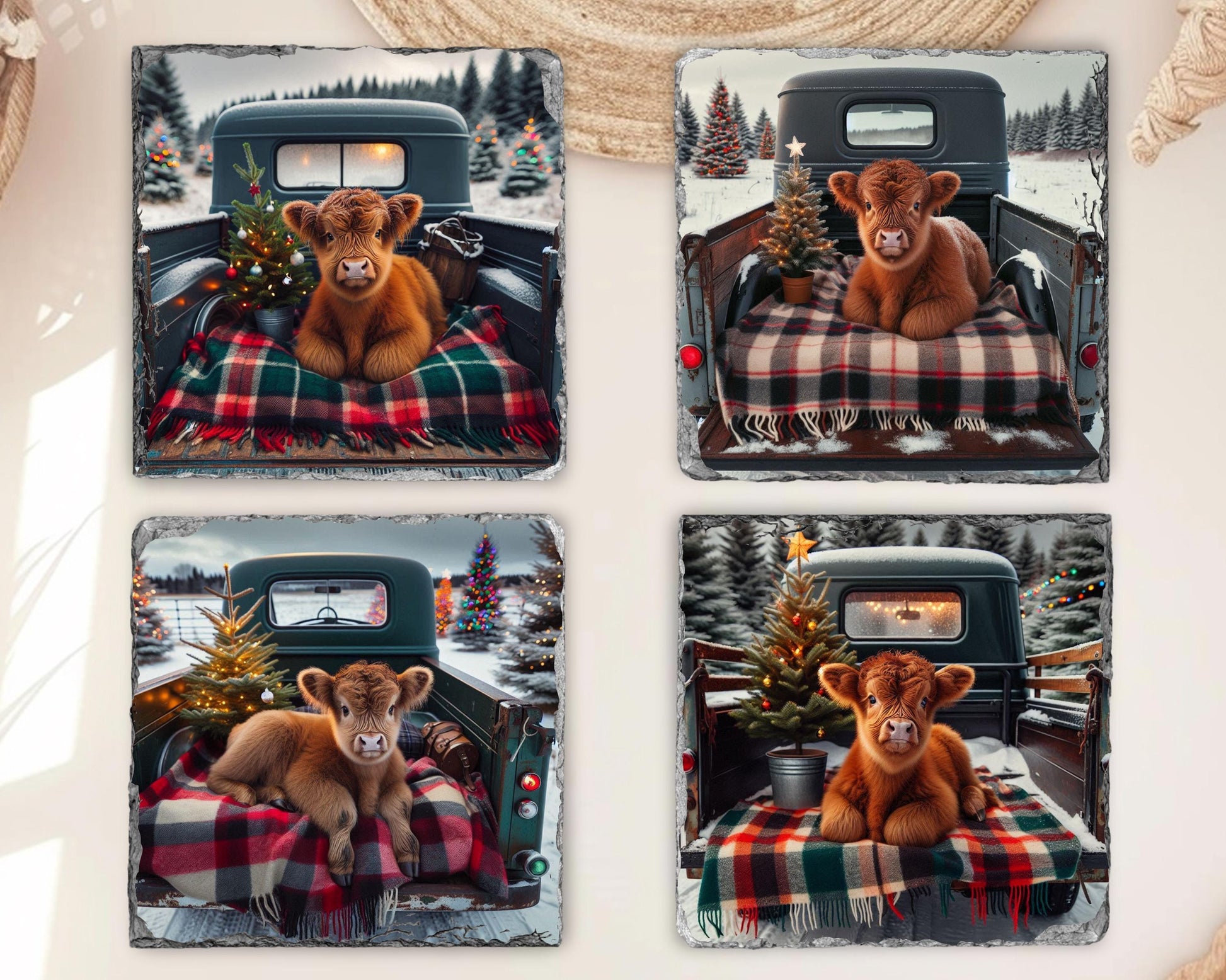 Highland Cow Christmas Coaster Set with Rack - Rustic Slate Coasters Featuring Baby Cow in Truck Perfect for Farmhouse Decor
