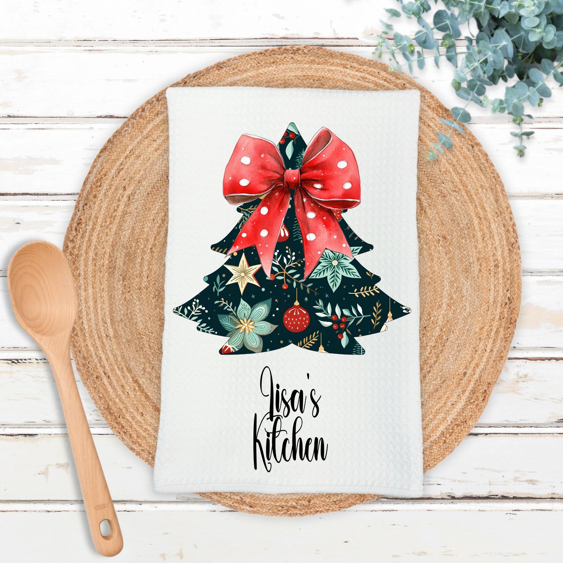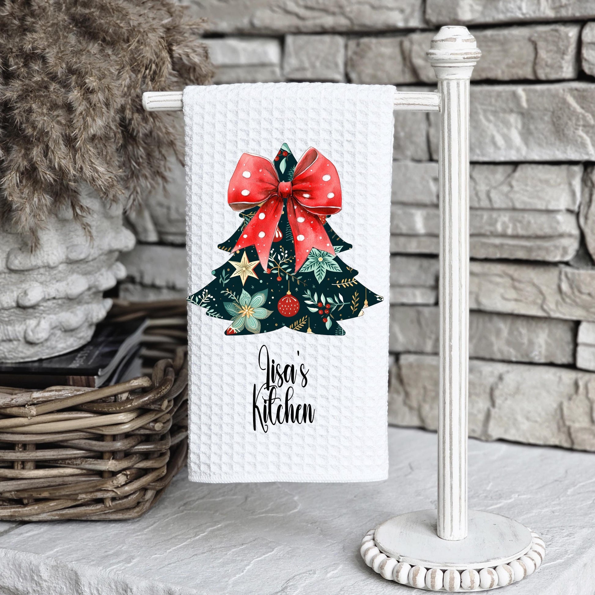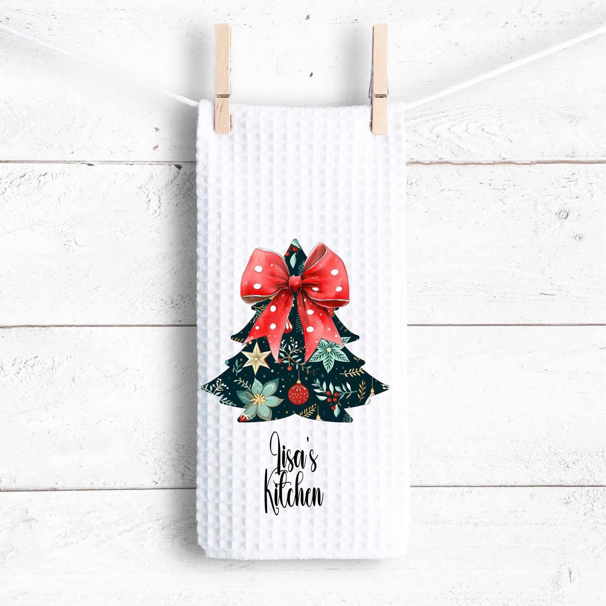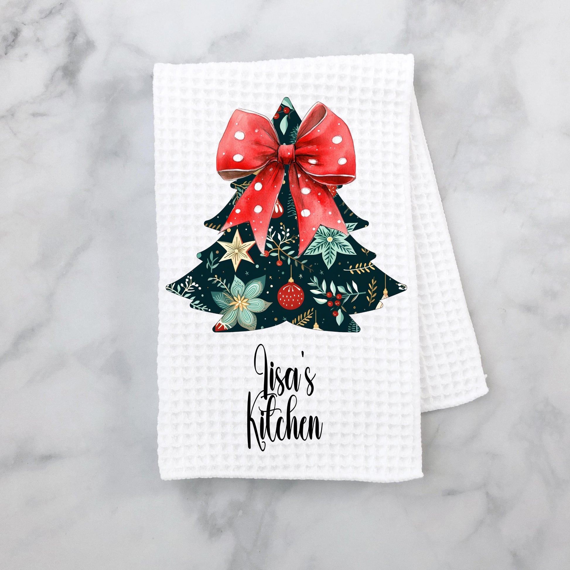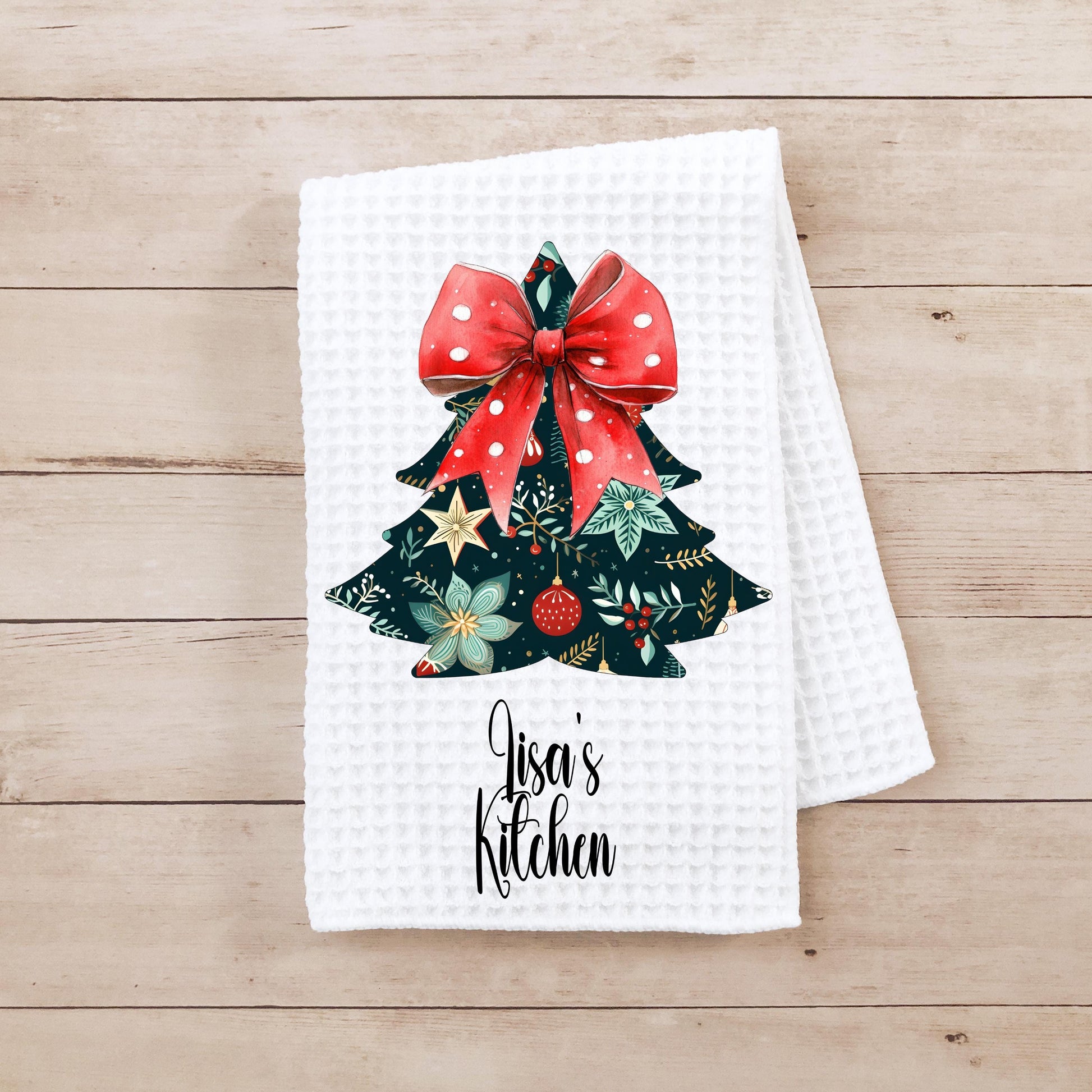 Add a touch of festive charm to your kitchen with our personalized waffle weave microfiber towel, measuring 16"x24". Adorned with a delightful floral Christmas tree design and a playful red and white polka dot bow, this towel seamlessly combines practicality with whimsy. It’s an ideal choice for enhancing your holiday decor or as a thoughtful gift for friends and family.