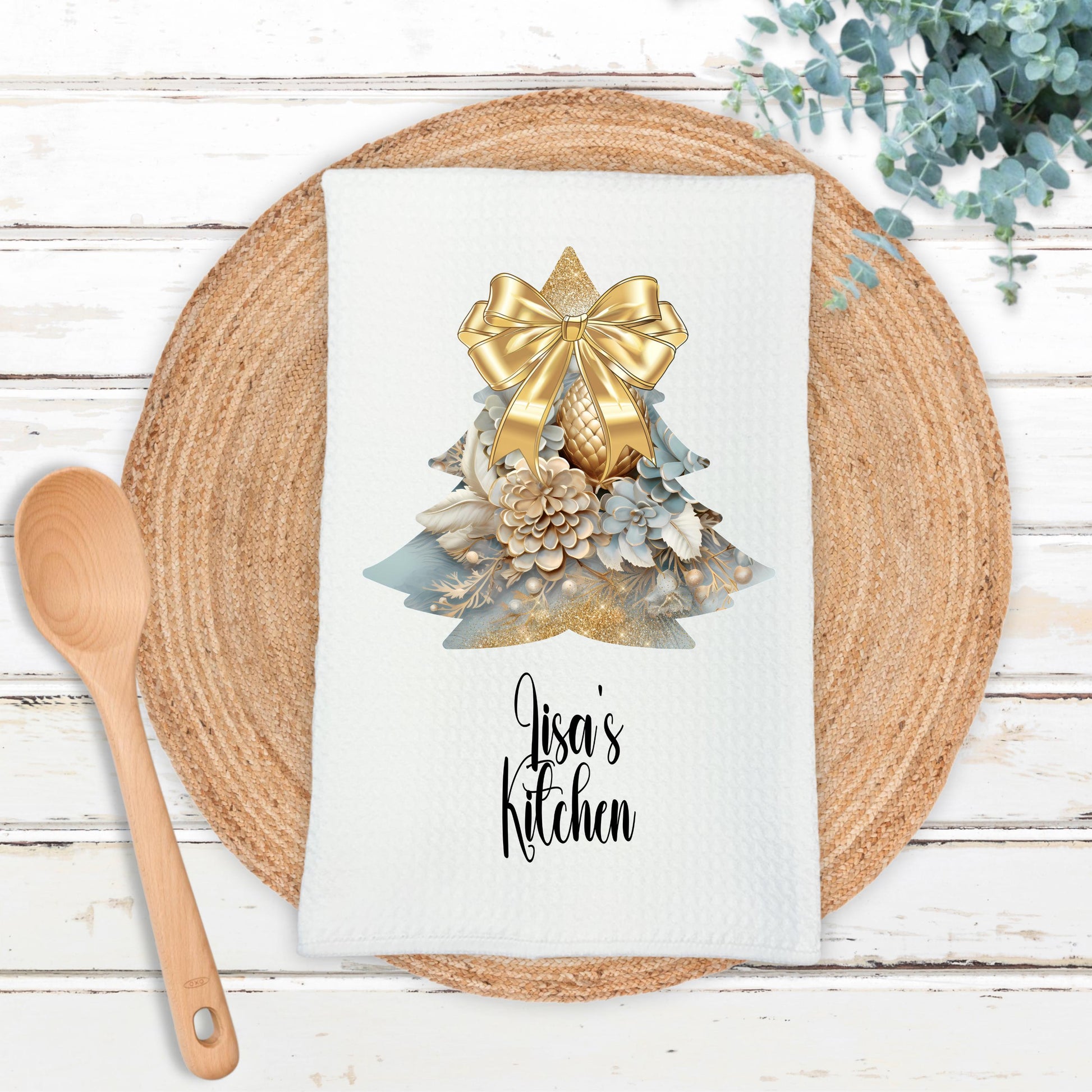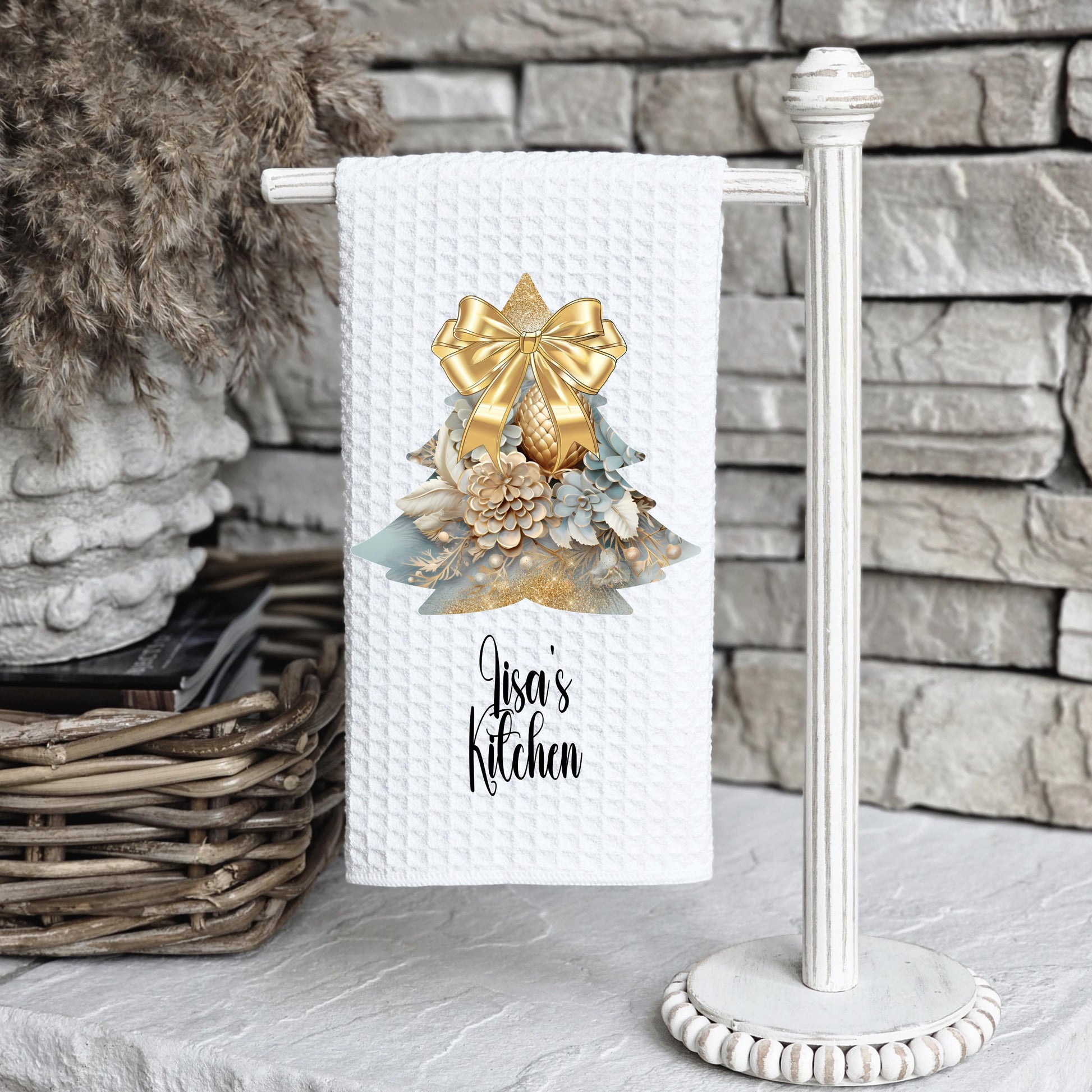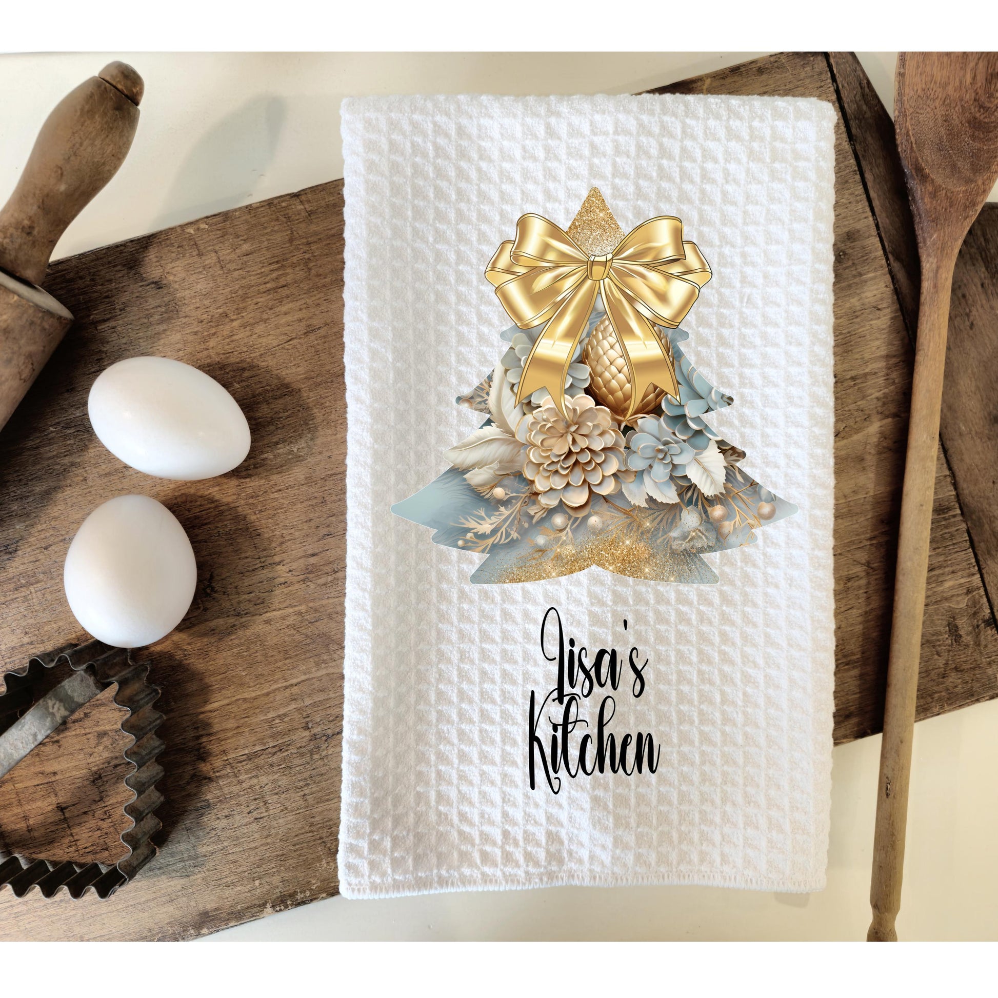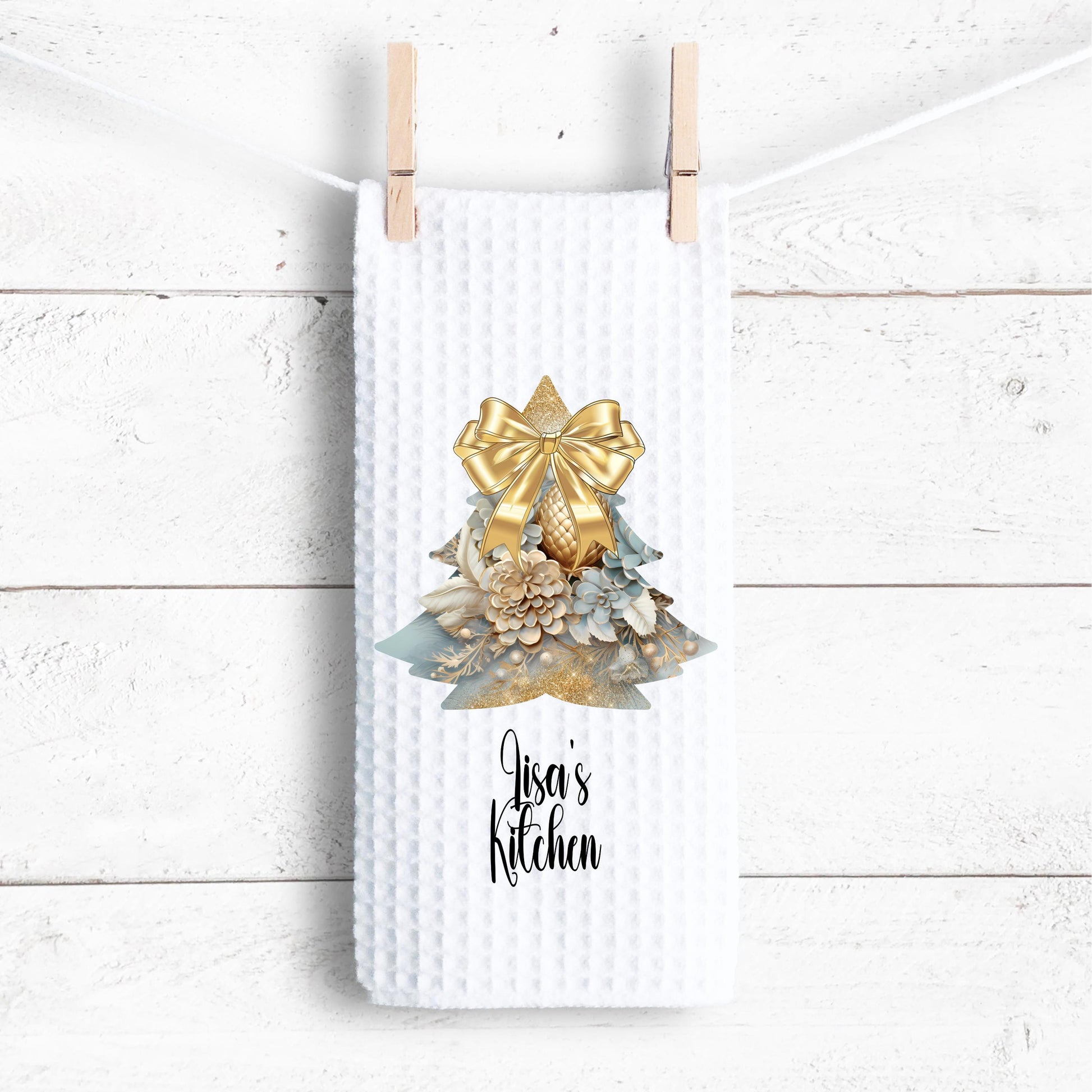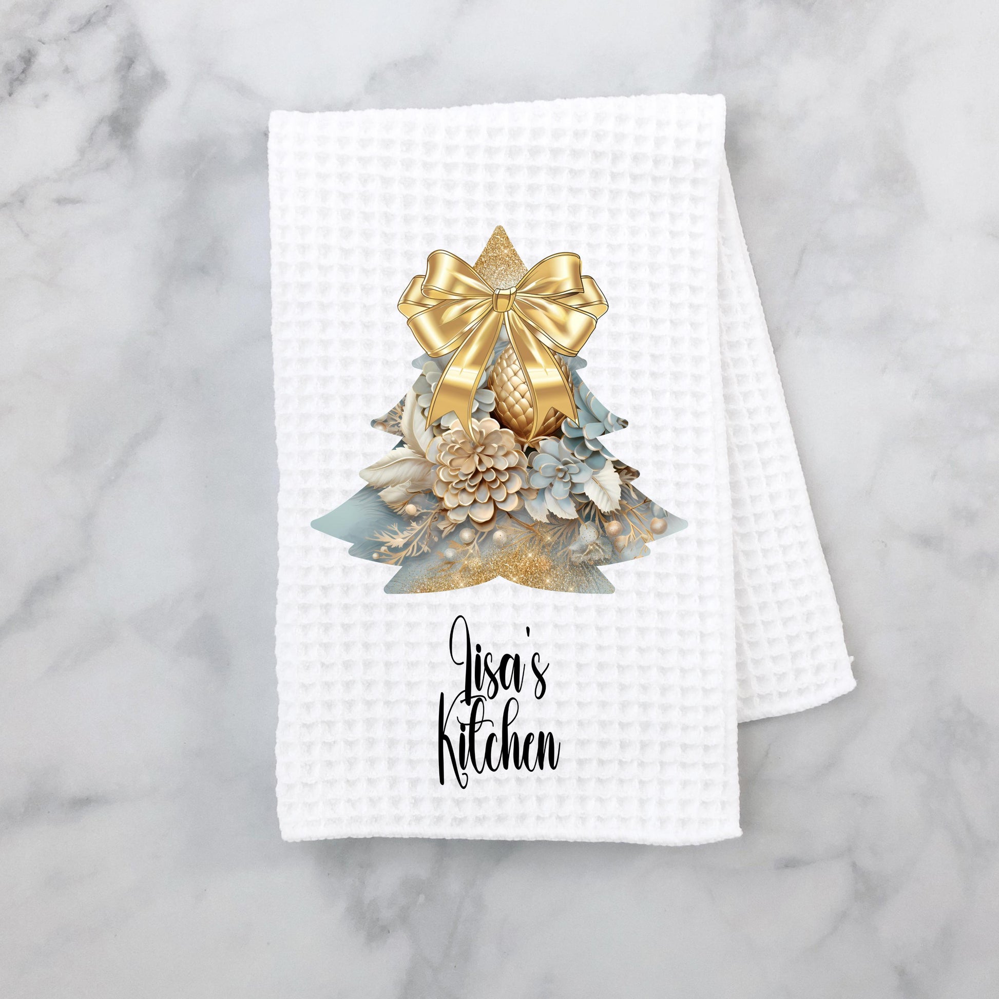 Enhance your kitchen's holiday ambiance with our personalized 16x24 waffle weave microfiber towel. This towel features a beautiful Gold Christmas Bow on a Rustic Light Blue Christmas Tree design, making it both a practical accessory and a stylish addition to your festive home decor. Ideal for gifting or bringing a touch of holiday cheer to your own space.