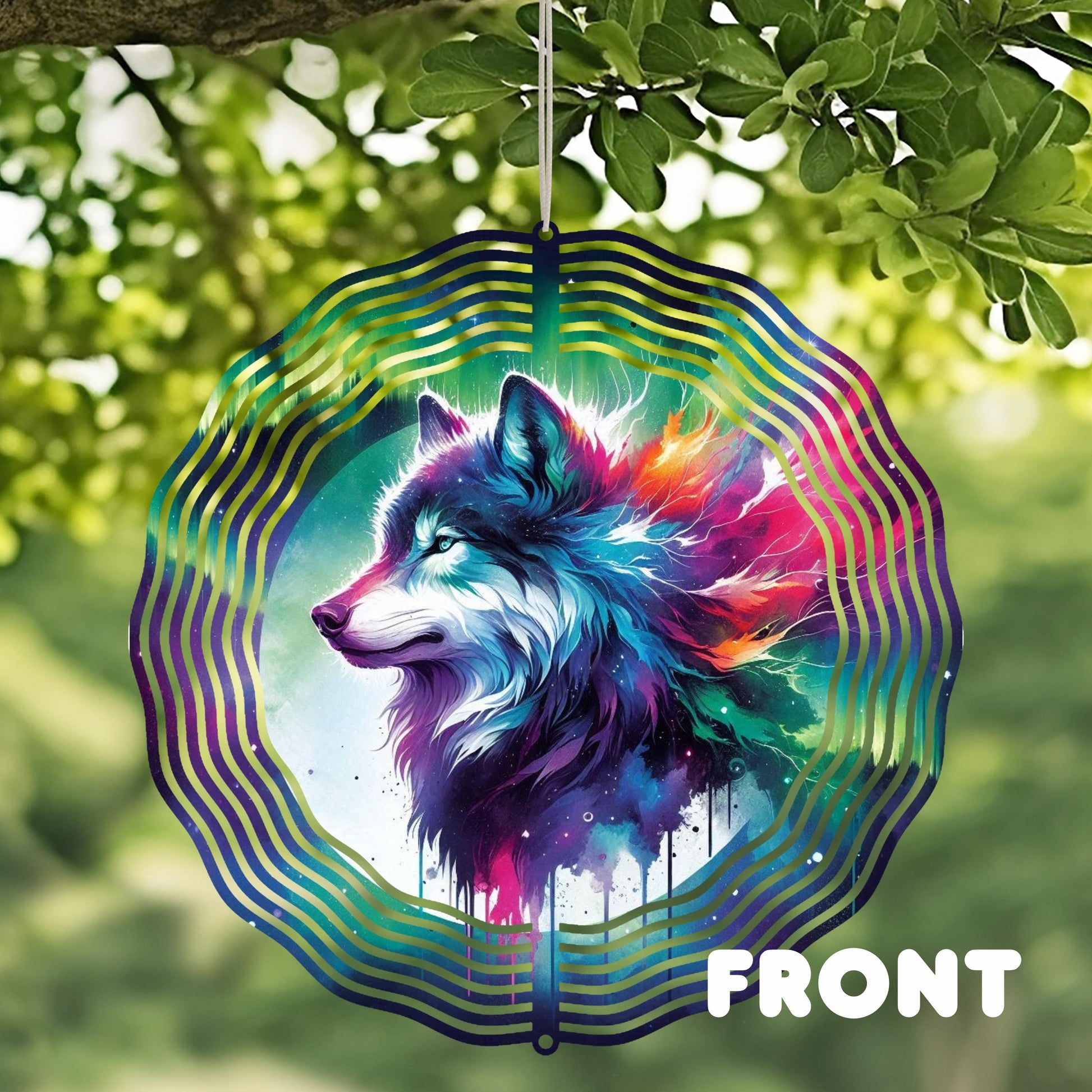 Immerse yourself in the enchanting beauty of nature with this double-sided wind spinner, measuring 10x10 inches. It features a striking profile view of a wolf head, beautifully painted in watercolor hues reminiscent of the northern lights. The design is set against a breathtaking mountain backdrop and a luminous night sky, creating a captivating visual experience that brings color, depth, and movement to any outdoor space.
