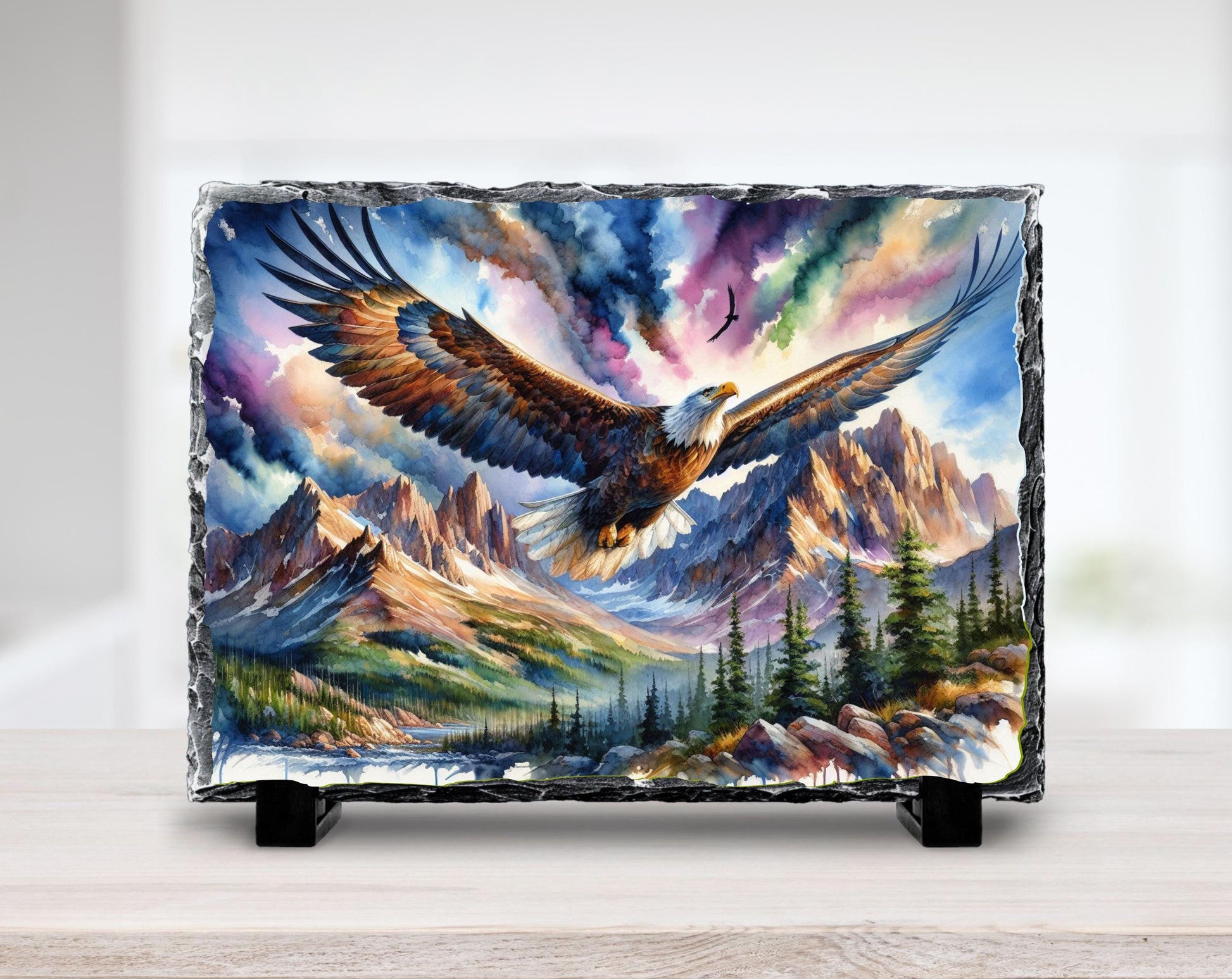 Experience the beauty of nature with this handcrafted slate plaque, showcasing a stunning watercolor depiction of an eagle soaring gracefully over a majestic mountain valley. With its expansive wings and powerful presence, the eagle symbolizes freedom, strength, and the raw splendor of the wilderness, gliding effortlessly above vibrant greenery and rugged peaks.