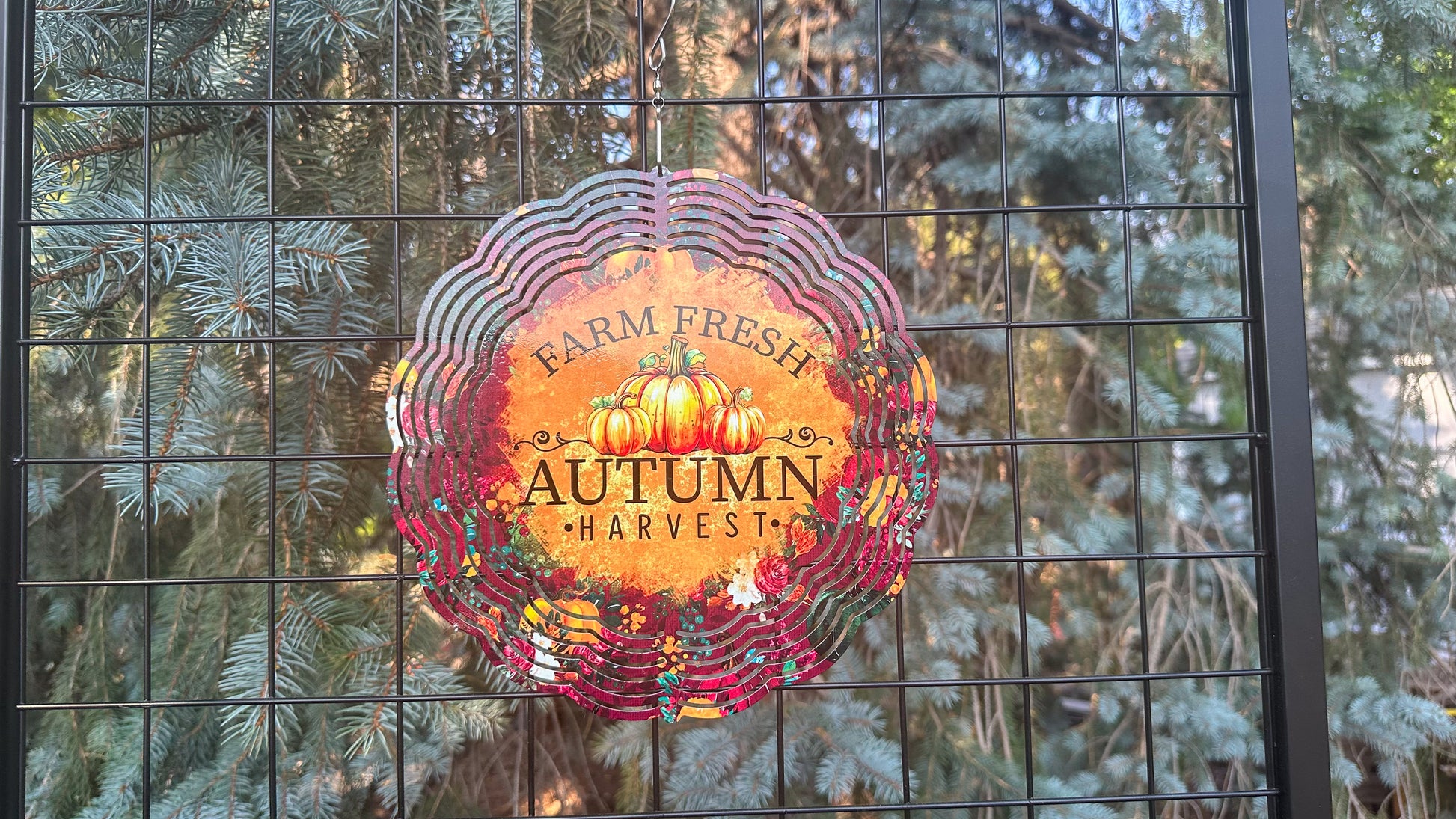 Enhance your outdoor space with this charming fall-themed wind spinner, measuring 10 inches in diameter and 0.25 inches thick. Crafted from durable aluminum, this decorative piece features a beautifully printed design on both sides, treated with a UV protector to ensure it withstands the elements throughout the seasons.