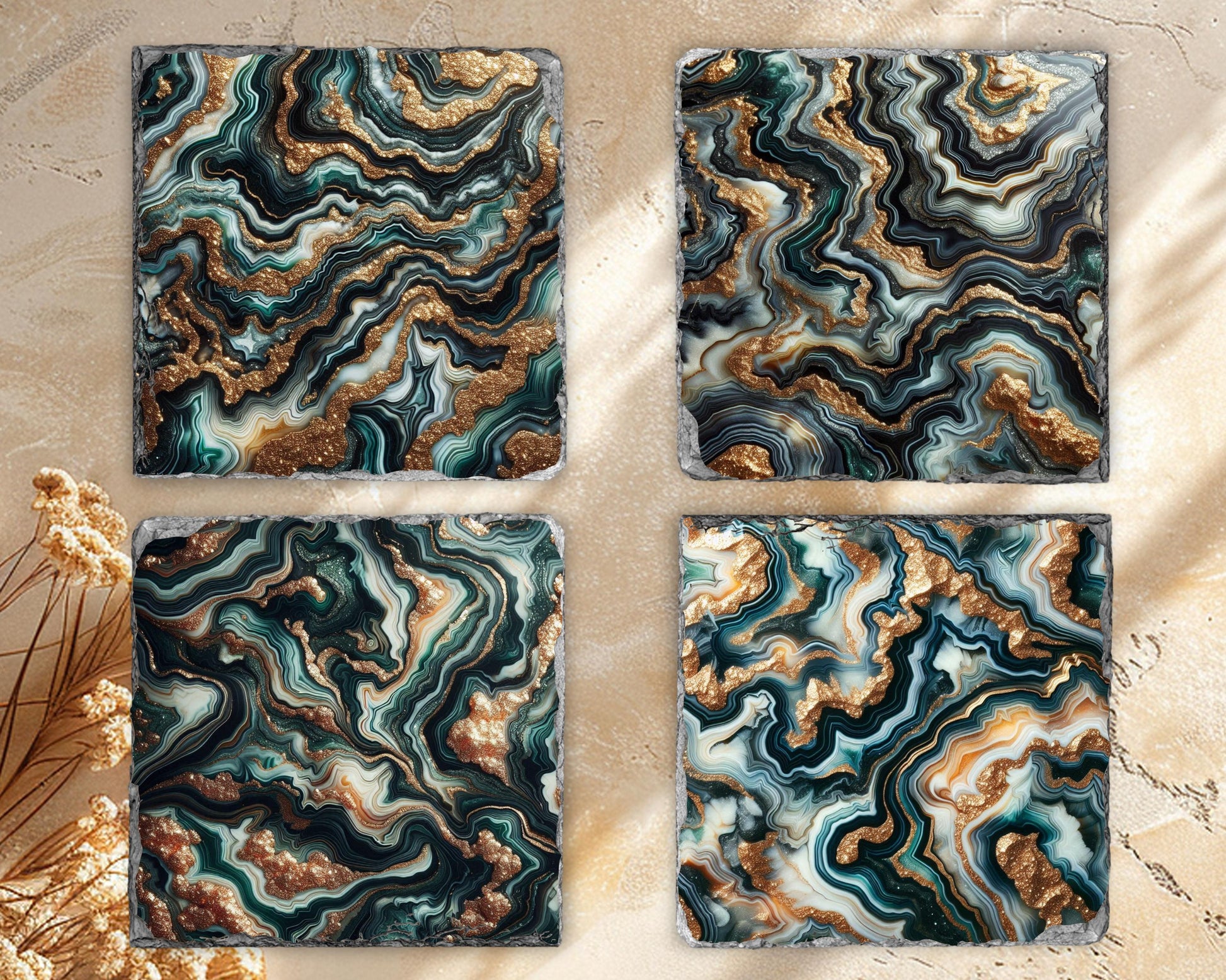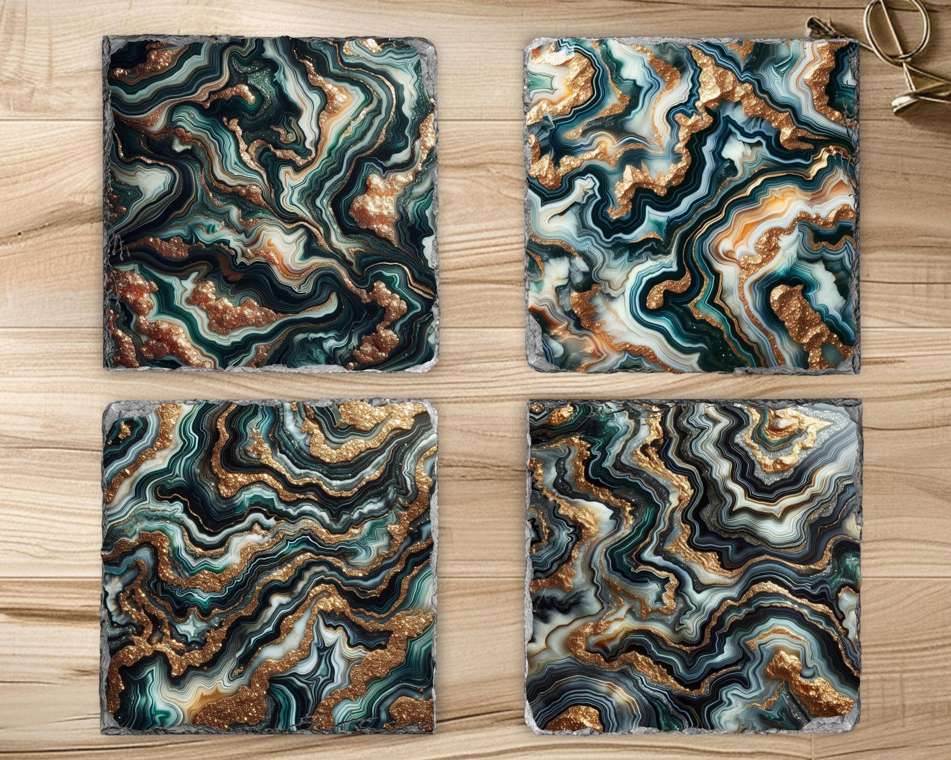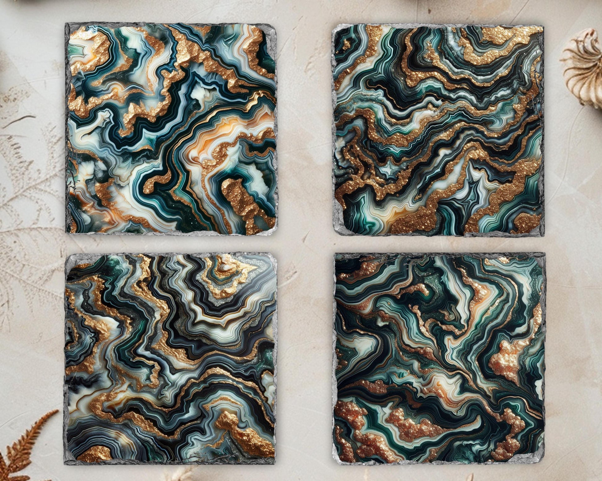 Fractured Edge Slate Coaster Set of 4 with Green Agate Pattern Gold Faux Glitter - Unique Housewarming Gift Elegant Home Décor