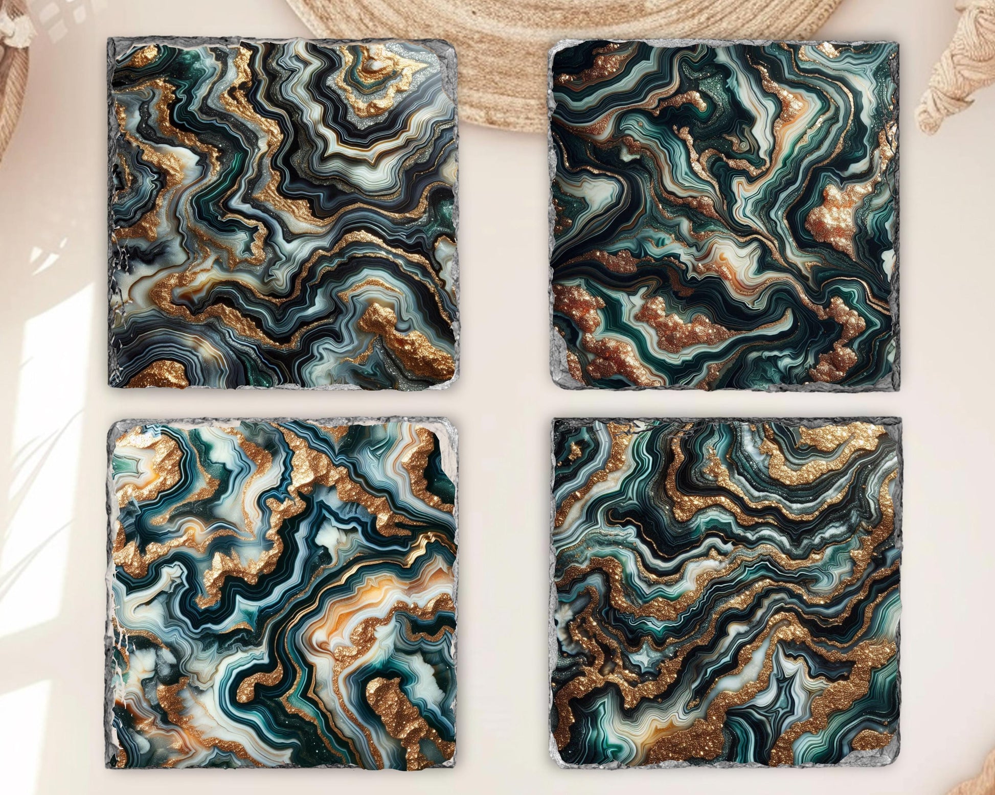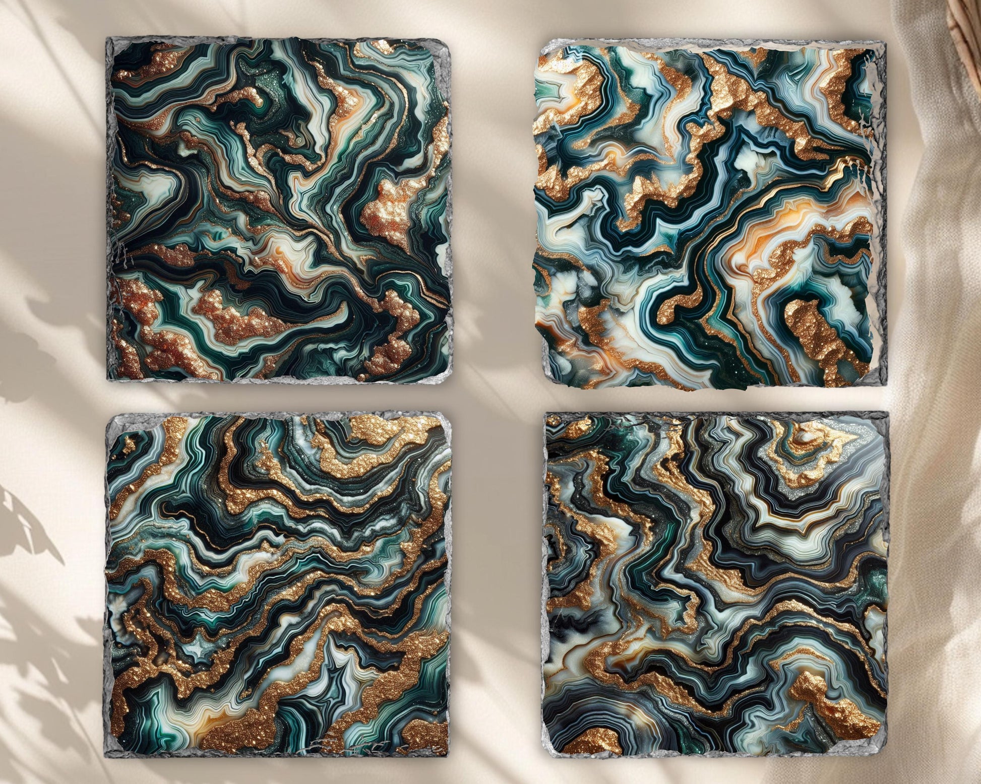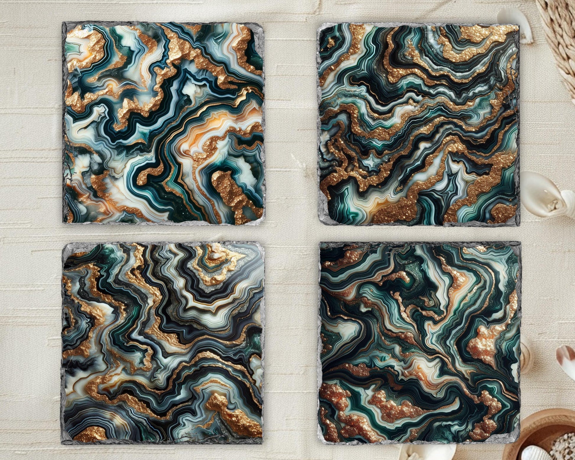Fractured Edge Slate Coaster Set of 4 with Green Agate Pattern Gold Faux Glitter - Unique Housewarming Gift Elegant Home Décor