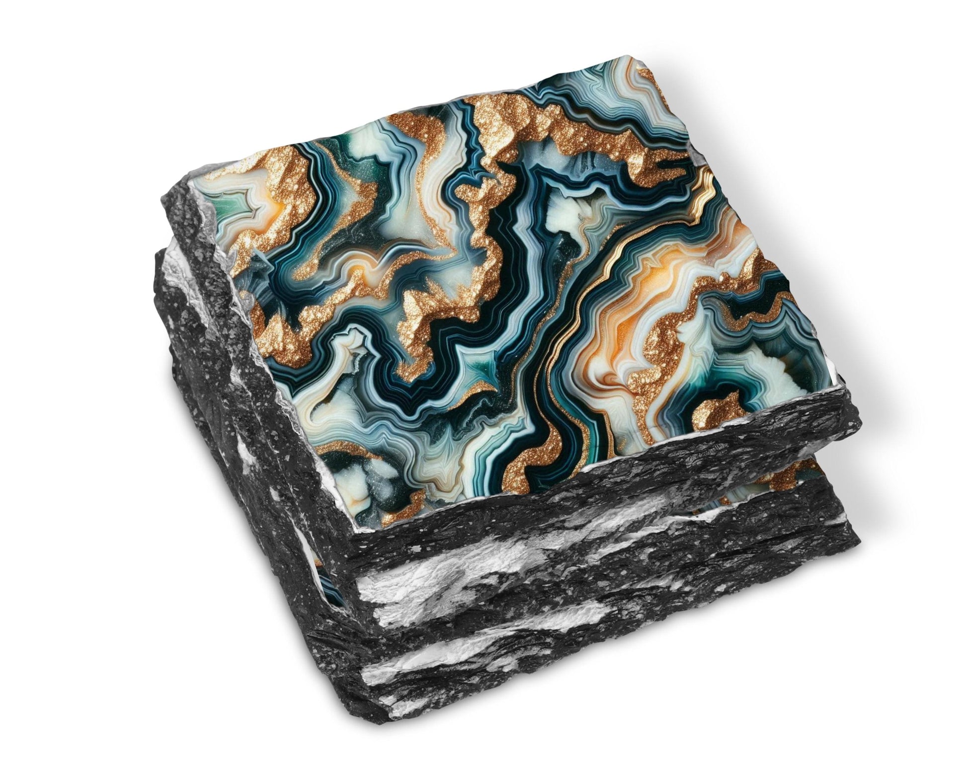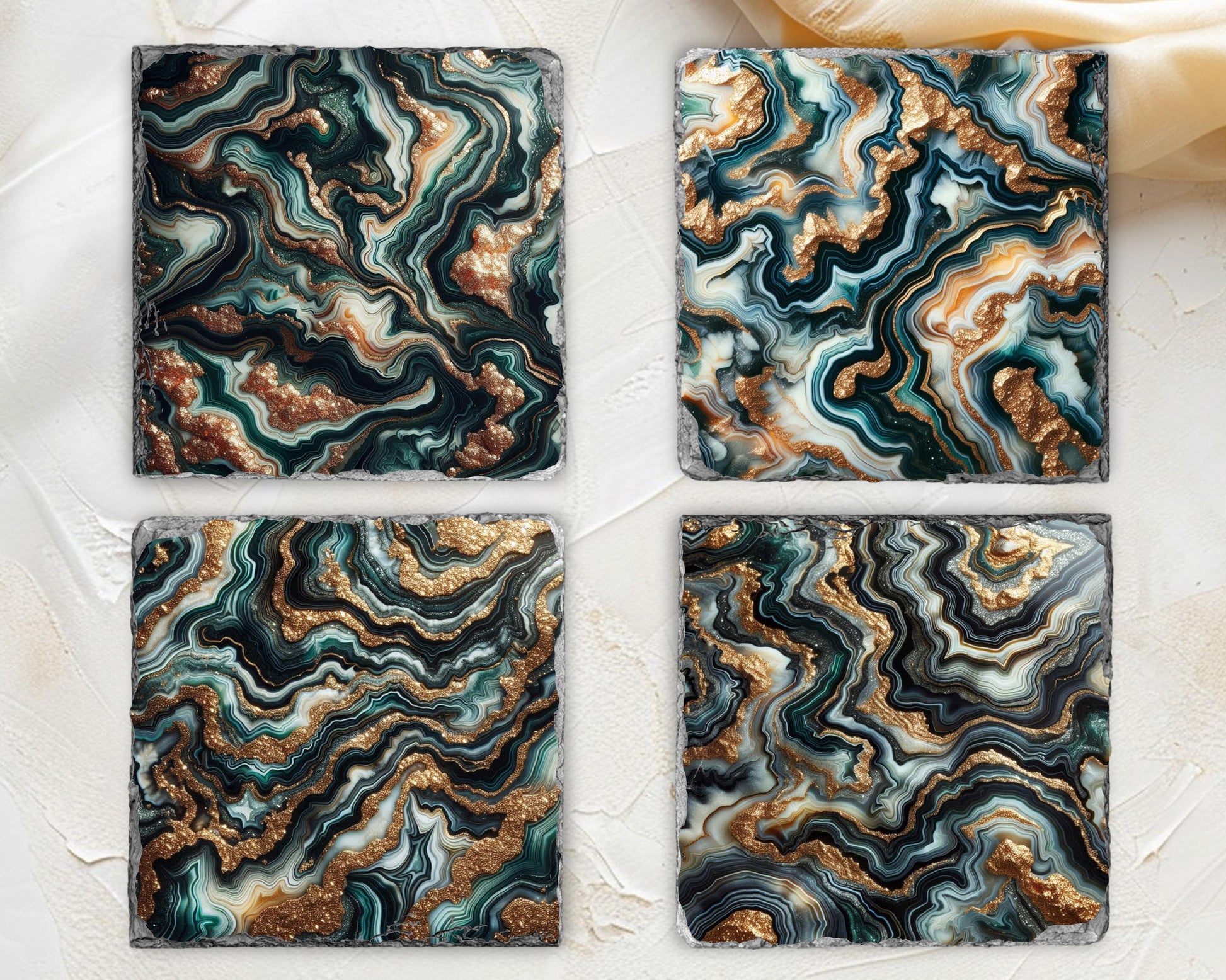 Enhance your living space with this unique set of four fractured edge slate coasters, each measuring 3.5 x 3.5 inches. Featuring striking green, gold, and faux silver glitter agate patterns, these coasters add an elegant touch to any decor while effectively protecting your surfaces. Made from natural slate, each coaster showcases distinctive fractured edges that contribute to their rustic charm.