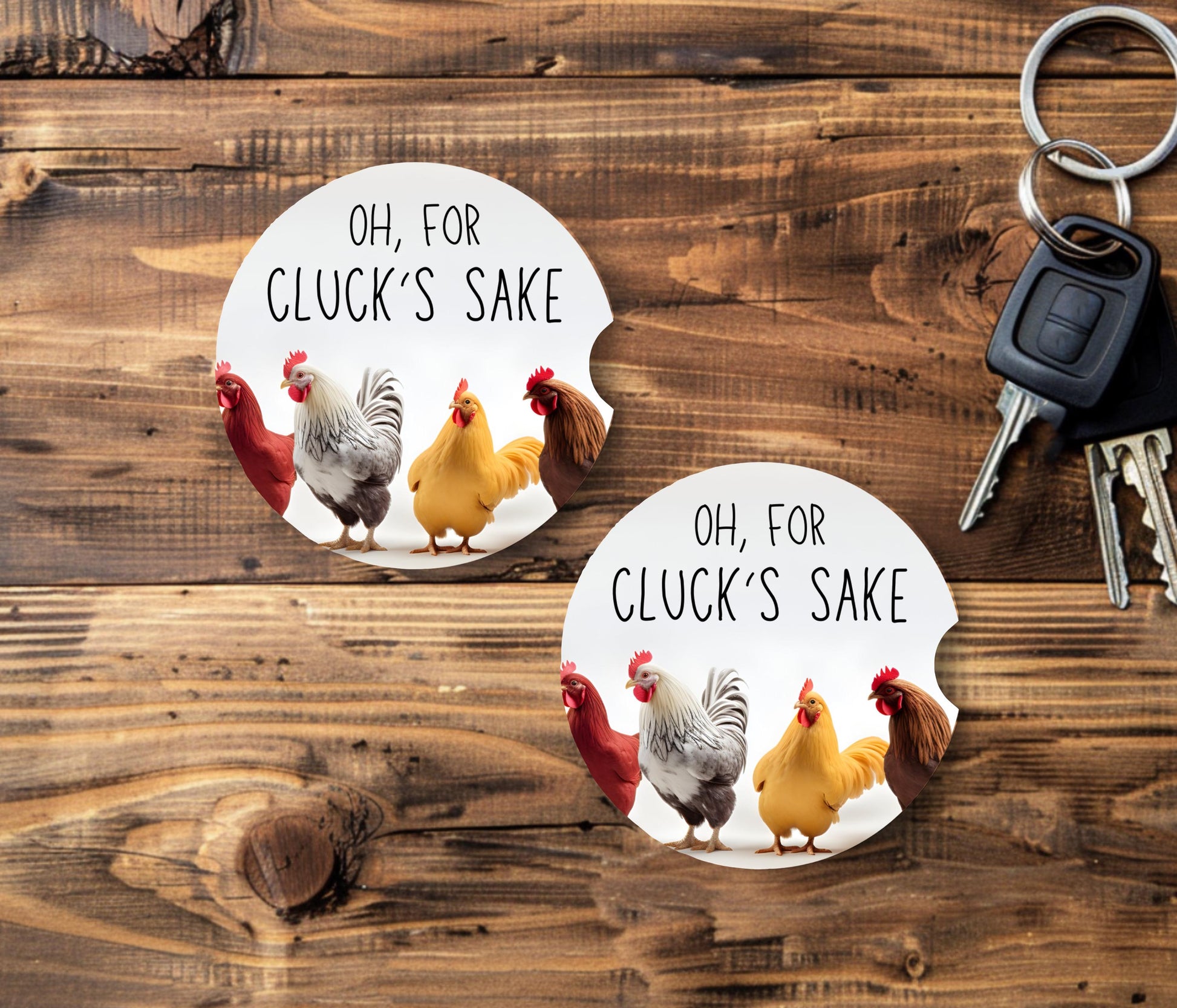 Add a whimsical touch to your vehicle with these delightful sandstone car coasters! Each coaster measures 2.56 inches in diameter and 0.30 inches thick, featuring charming illustrations of chickens alongside the amusing phrase, "Oh, For Cluck's Sake." You can choose between a single coaster or a set of two, making it easy to keep your cup holders both stylish and clean during all your drives.
