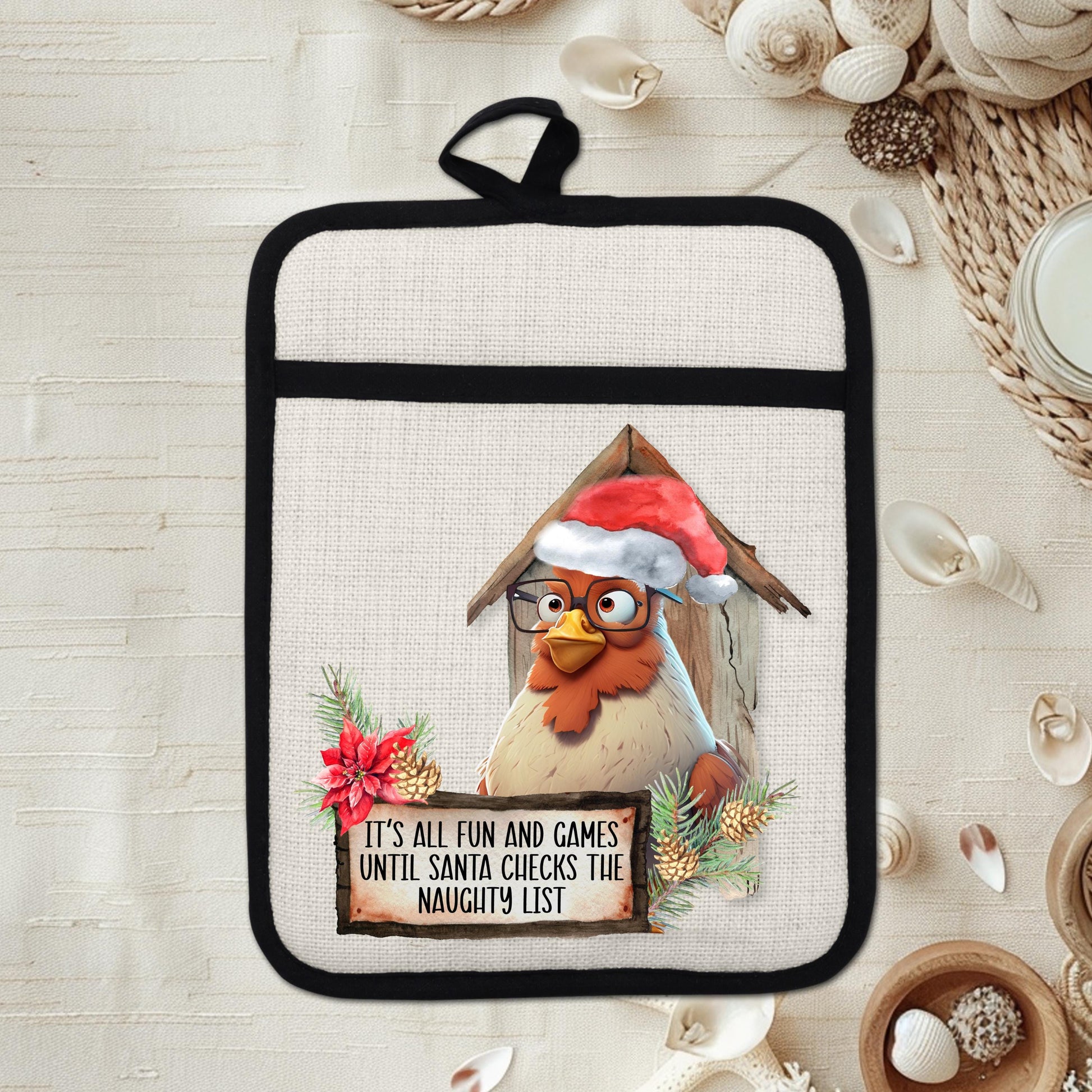 Funny Chicken Christmas Pot Holder with Naughty List Quote Santa Hat - Rustic Linen Hot Pad for Festive Kitchen Decor