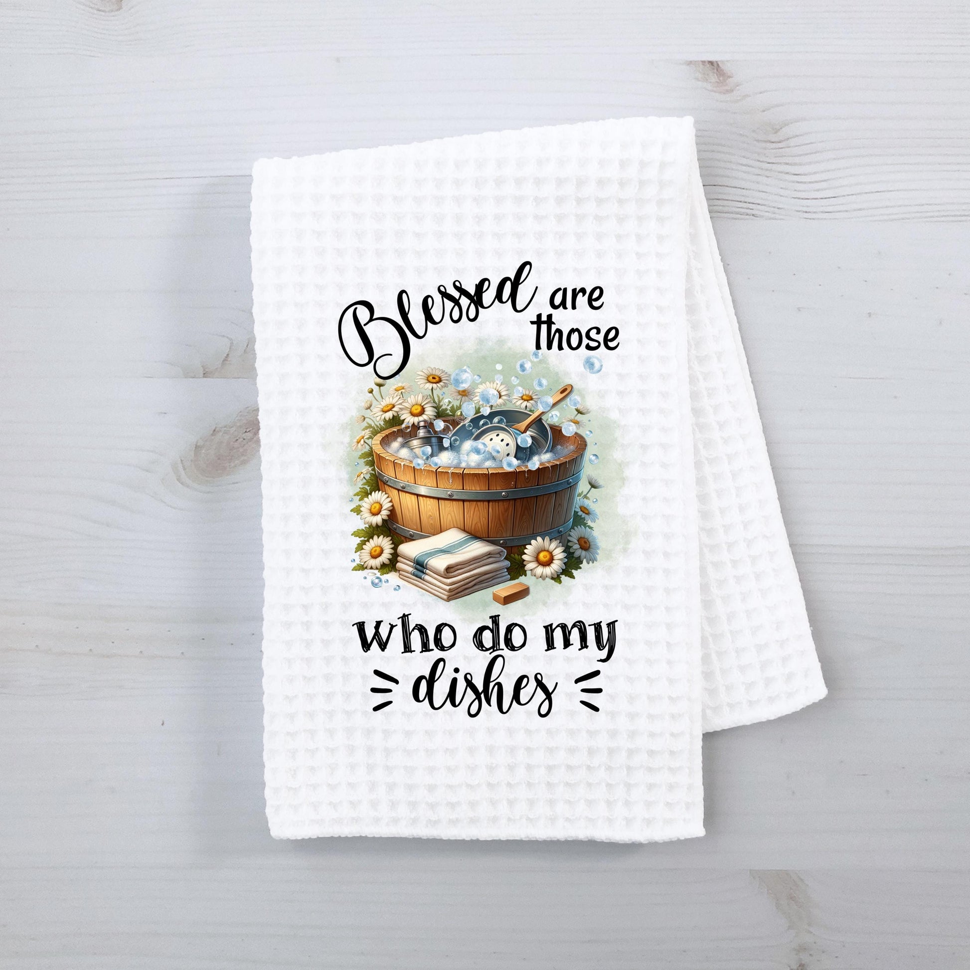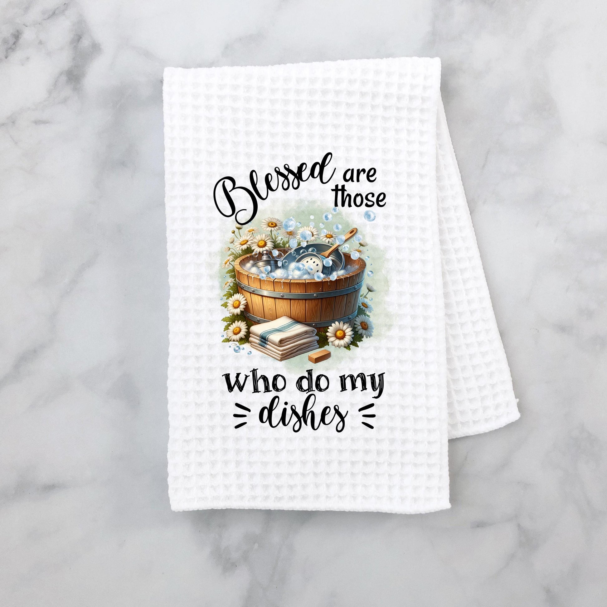 Bring a touch of charm and cheer to your kitchen with our delightful 16"x24" Waffle Weave Towel. Featuring a whimsical wash bucket brimming with dishes and daisies, this towel showcases the playful saying, "Blessed are those who do my dishes." It beautifully combines style and functionality, making it an essential addition to your daily routine.