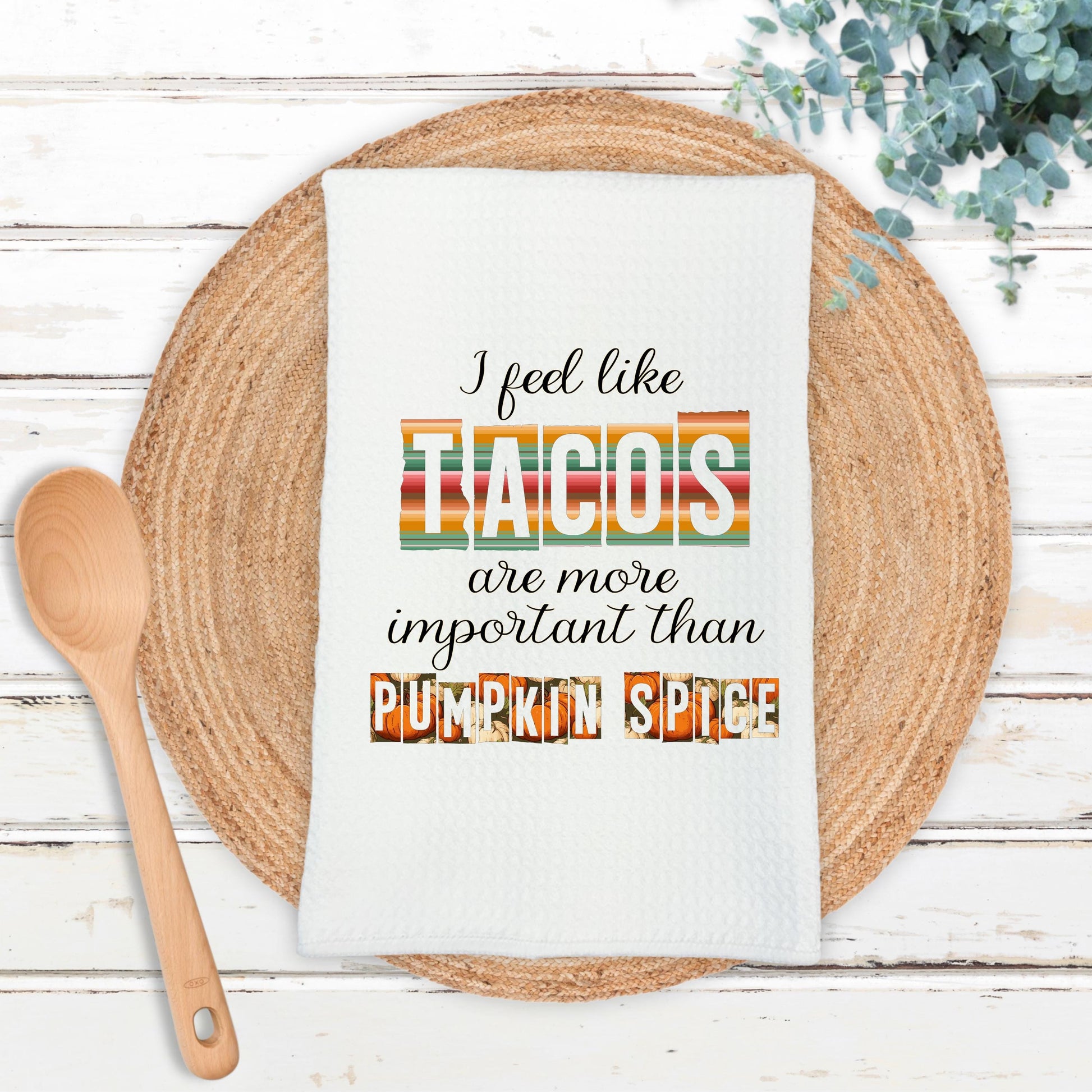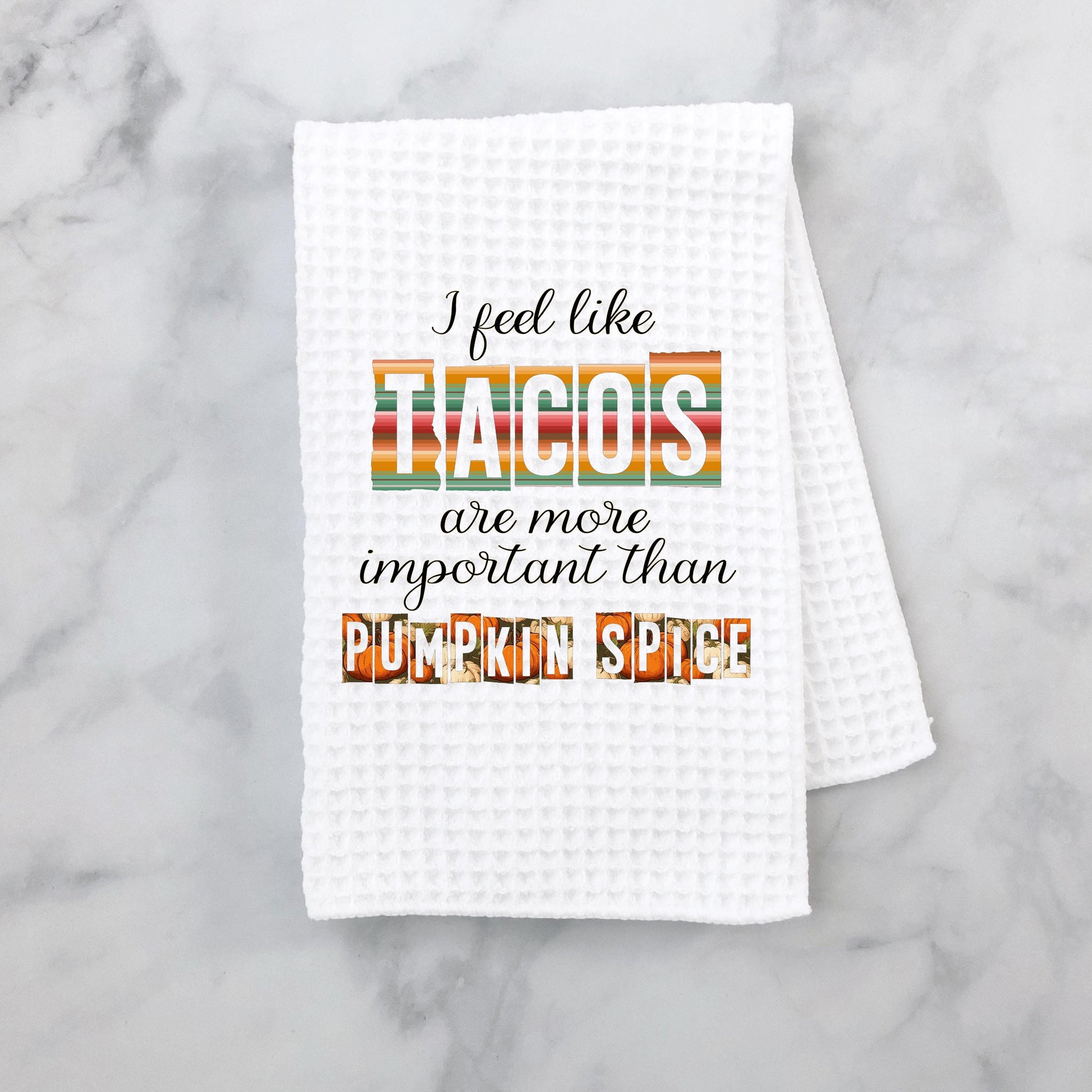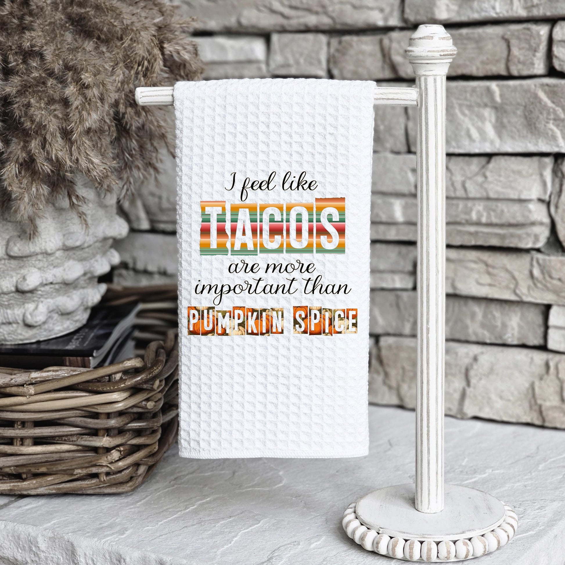 Add a playful touch to your kitchen decor with this 16x24 waffle weave microfiber towel. Adorned with the whimsical quote, "I Feel Like Tacos are more important than Pumpkin Spice," this towel combines practicality with a sense of humor. Its soft, absorbent texture makes it ideal for drying dishes or hands, while its vibrant design brings a pop of personality to your home. This kitchen towel also makes for a thoughtful and unique gift for any taco enthusiast in your life. Perfect for autumn decor, it’s a fun way to celebrate the season while expressing your love for tacos.