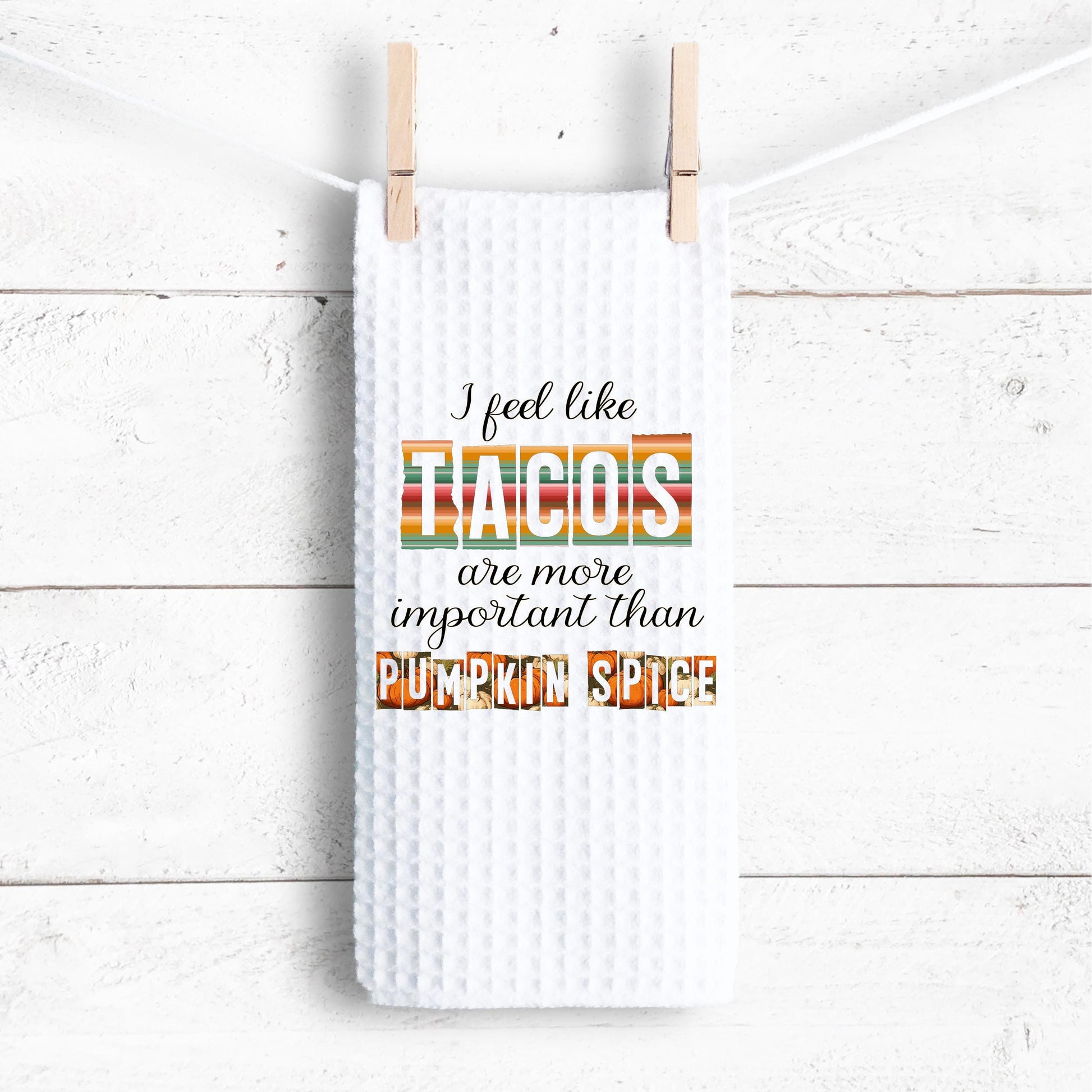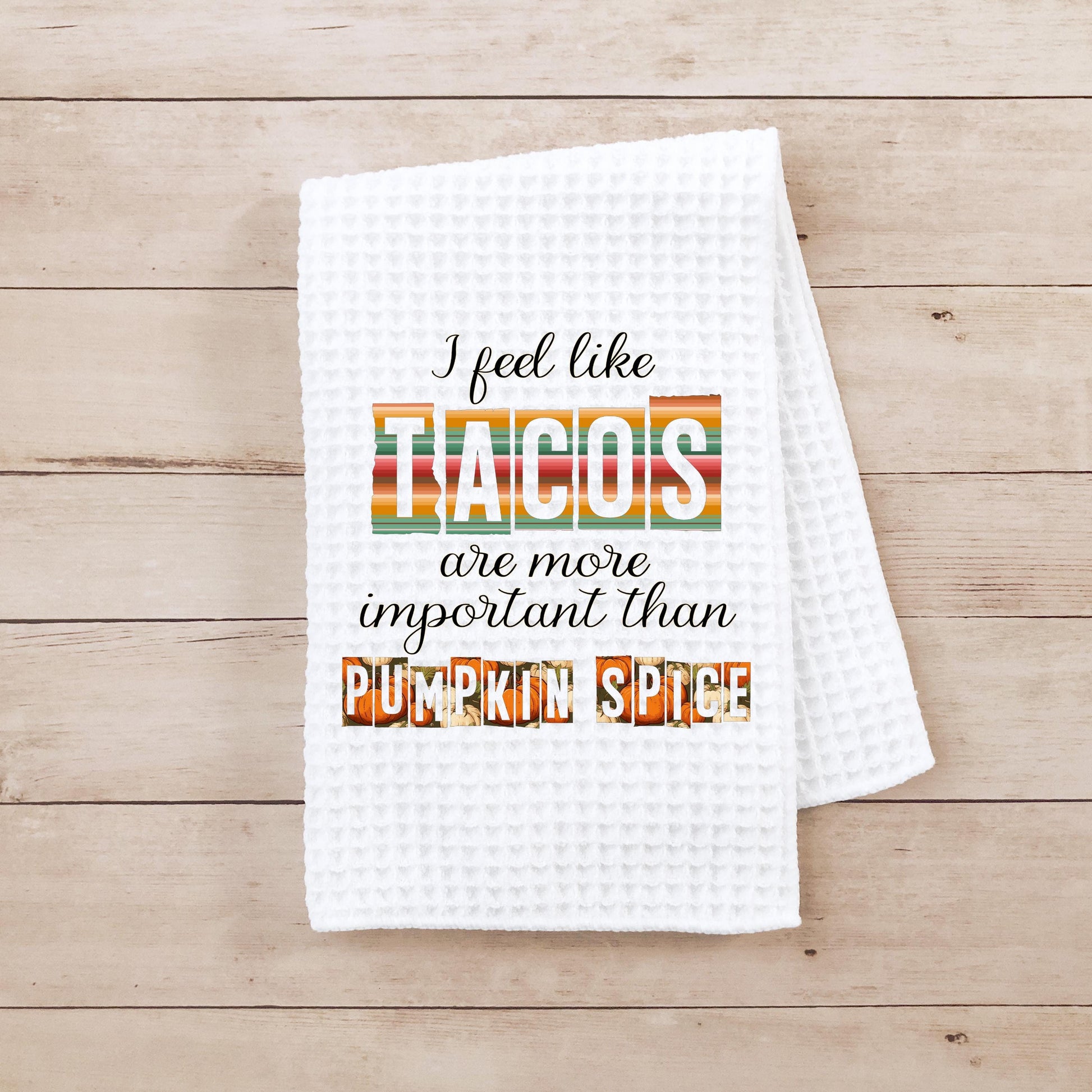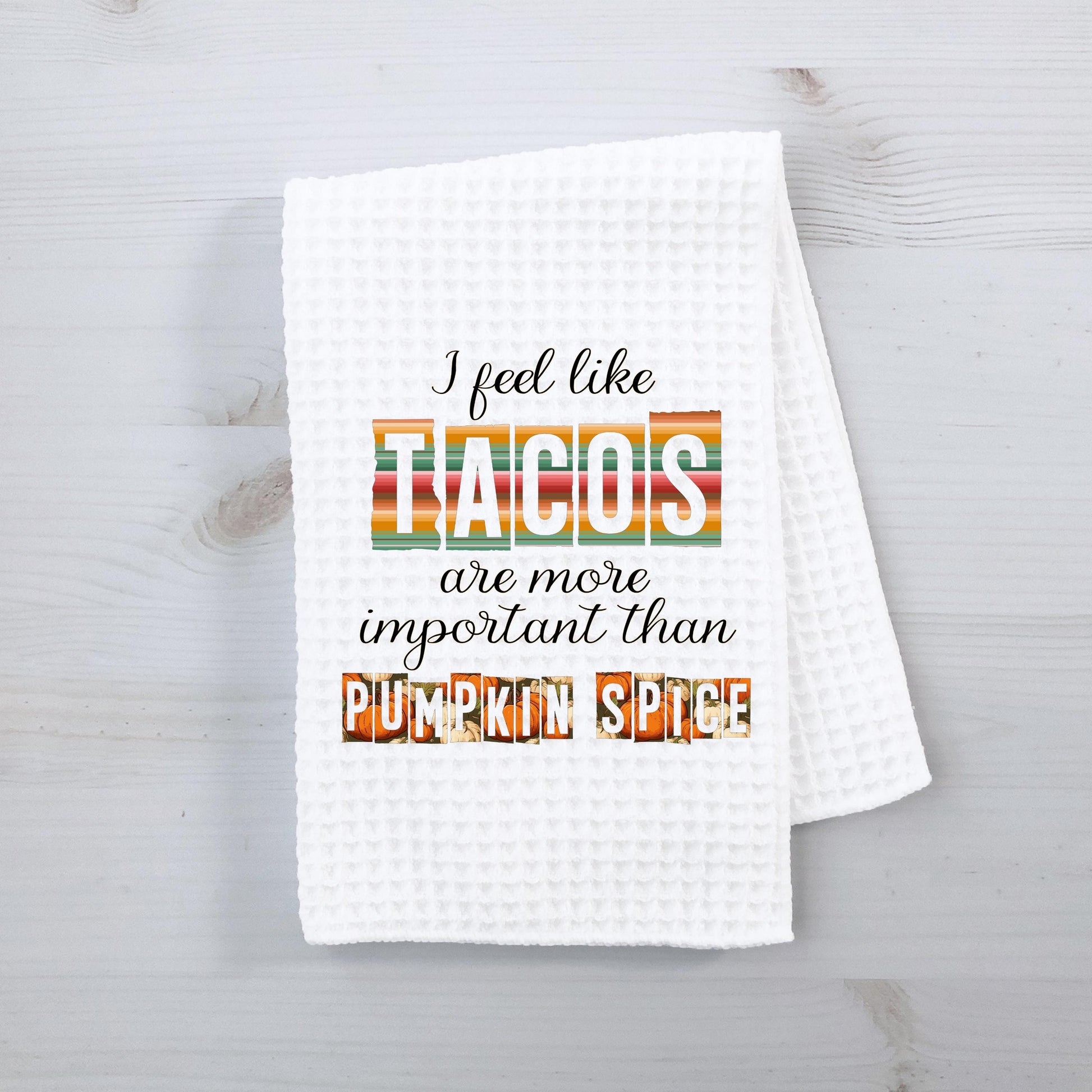 Add a playful touch to your kitchen decor with this 16x24 waffle weave microfiber towel. Adorned with the whimsical quote, "I Feel Like Tacos are more important than Pumpkin Spice," this towel combines practicality with a sense of humor. Its soft, absorbent texture makes it ideal for drying dishes or hands, while its vibrant design brings a pop of personality to your home. This kitchen towel also makes for a thoughtful and unique gift for any taco enthusiast in your life. Perfect for autumn decor, it’s a fun way to celebrate the season while expressing your love for tacos.