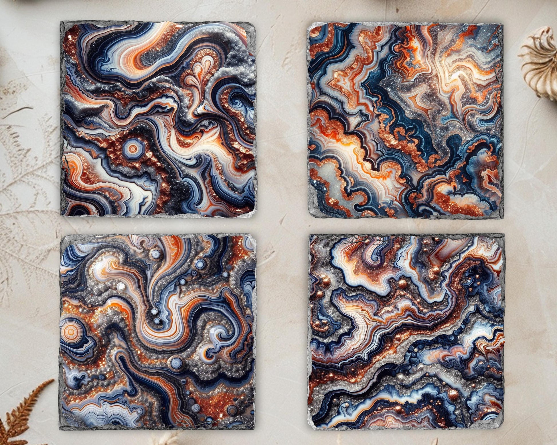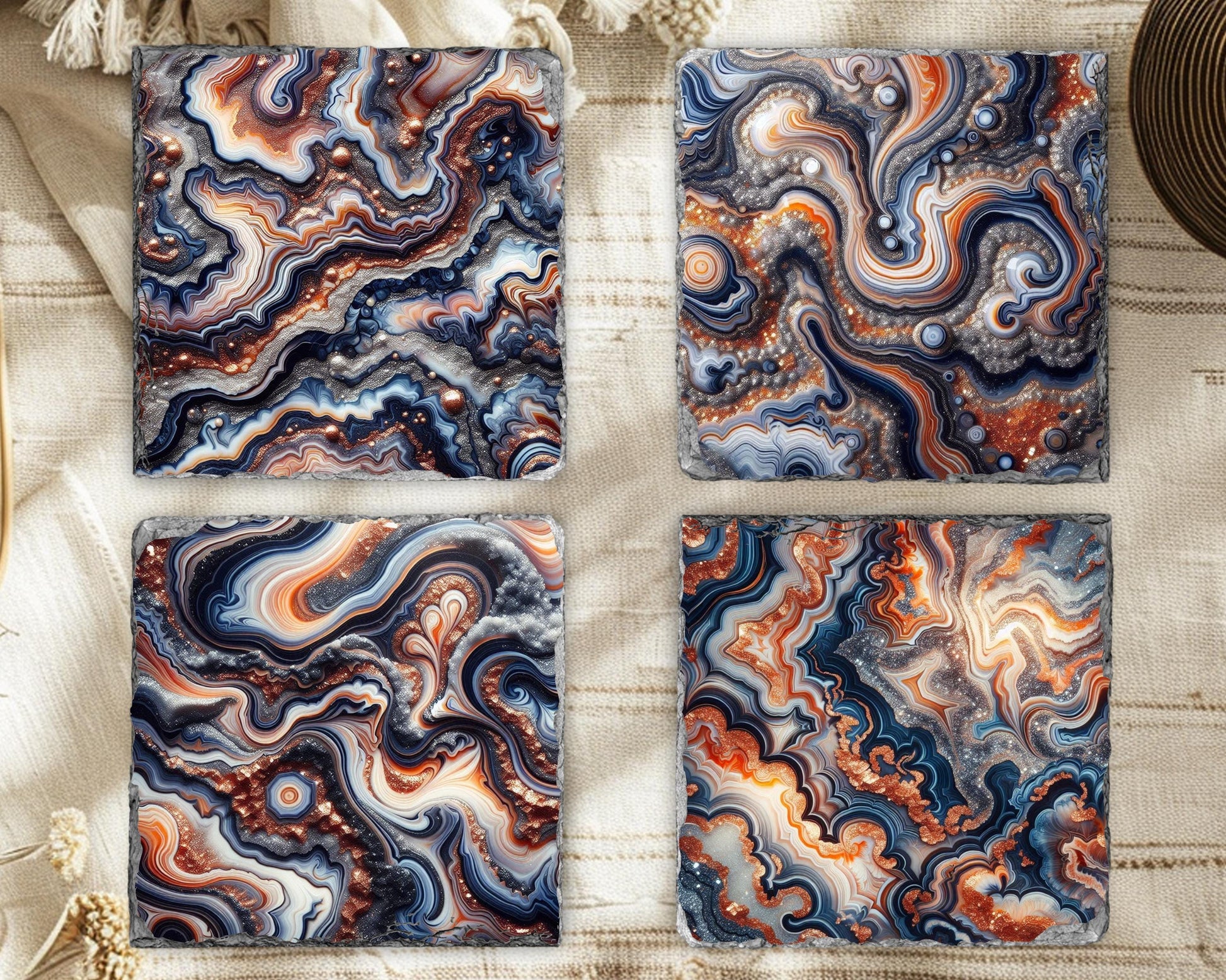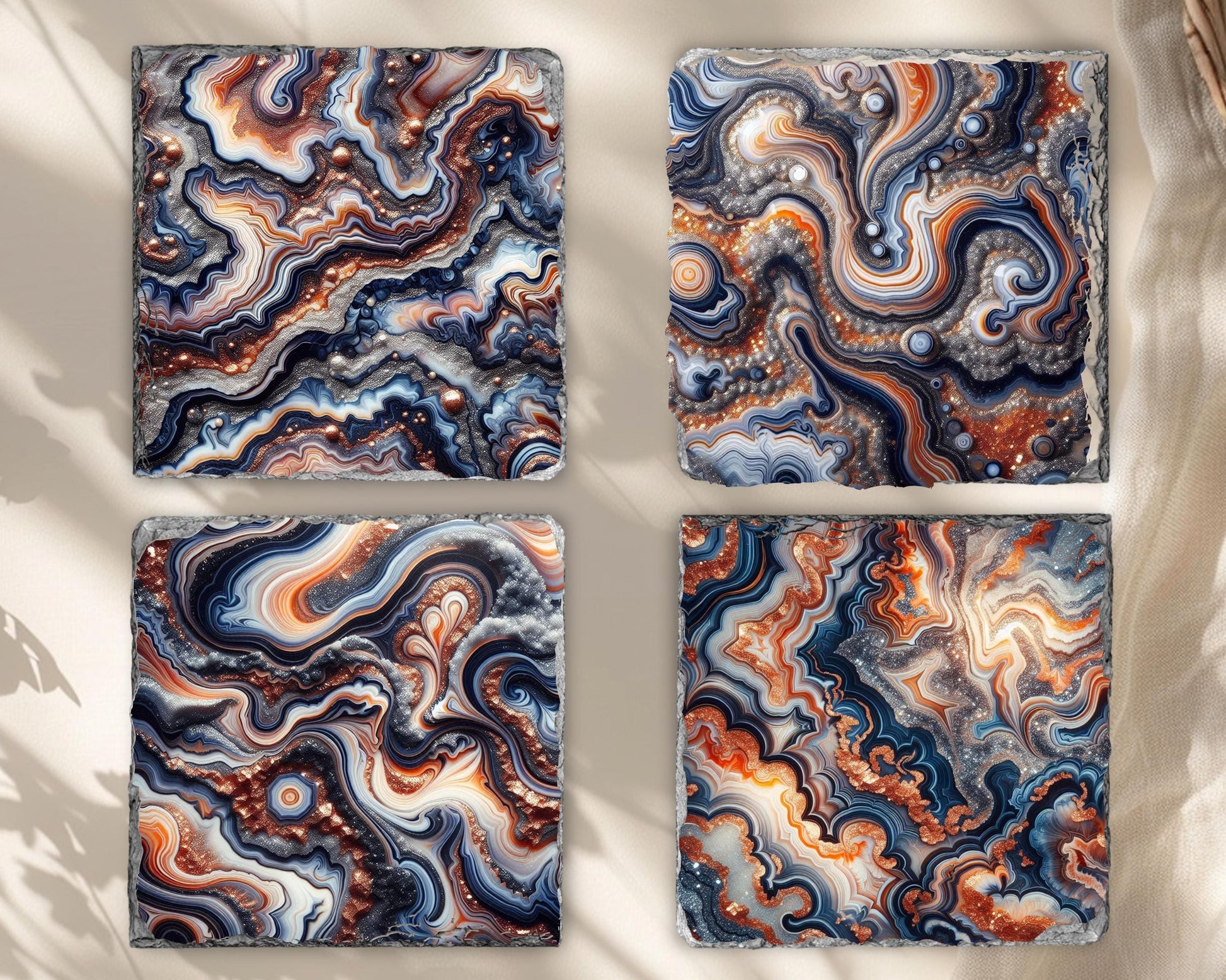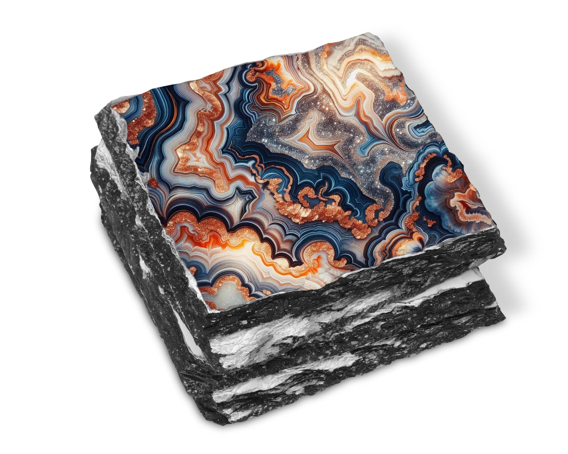 Enhance your home decor with this beautifully crafted set of four coasters, each measuring 3.5 x 3.5 inches. Showcasing captivating blue, orange, and faux silver glitter agate patterns, these coasters not only protect your surfaces but also add a stylish accent to any space. Made from natural slate, each piece features distinctive fractured edges that contribute to its unique, rugged charm.