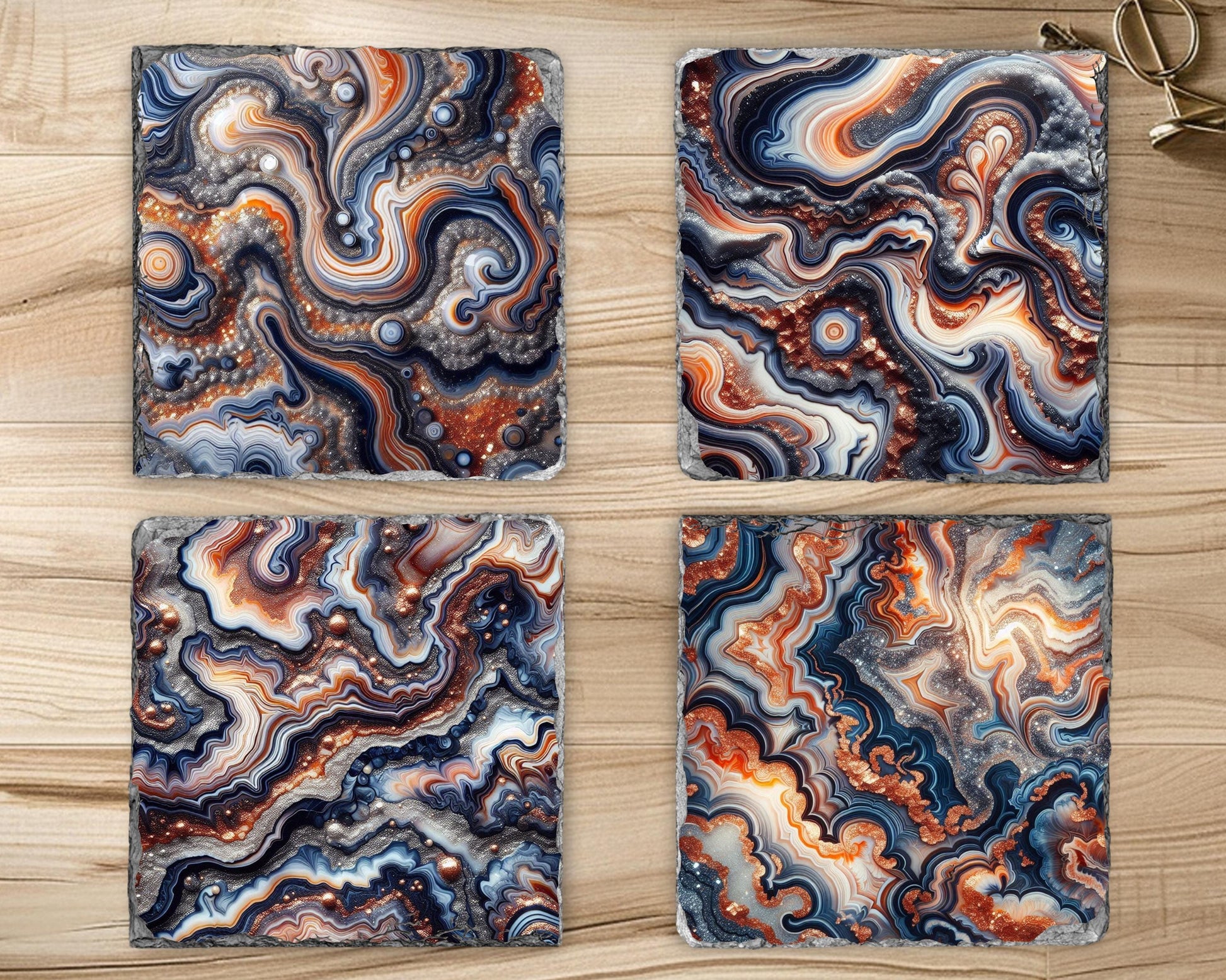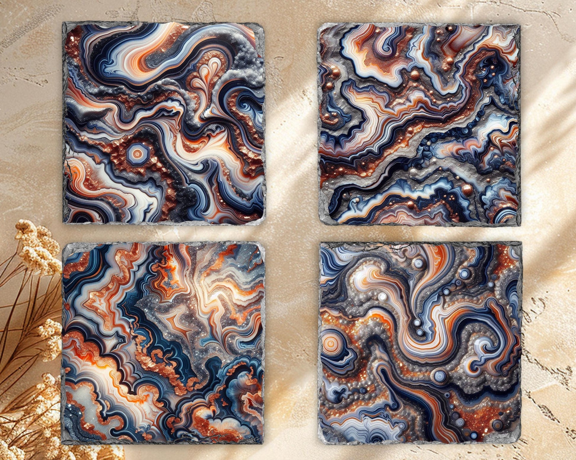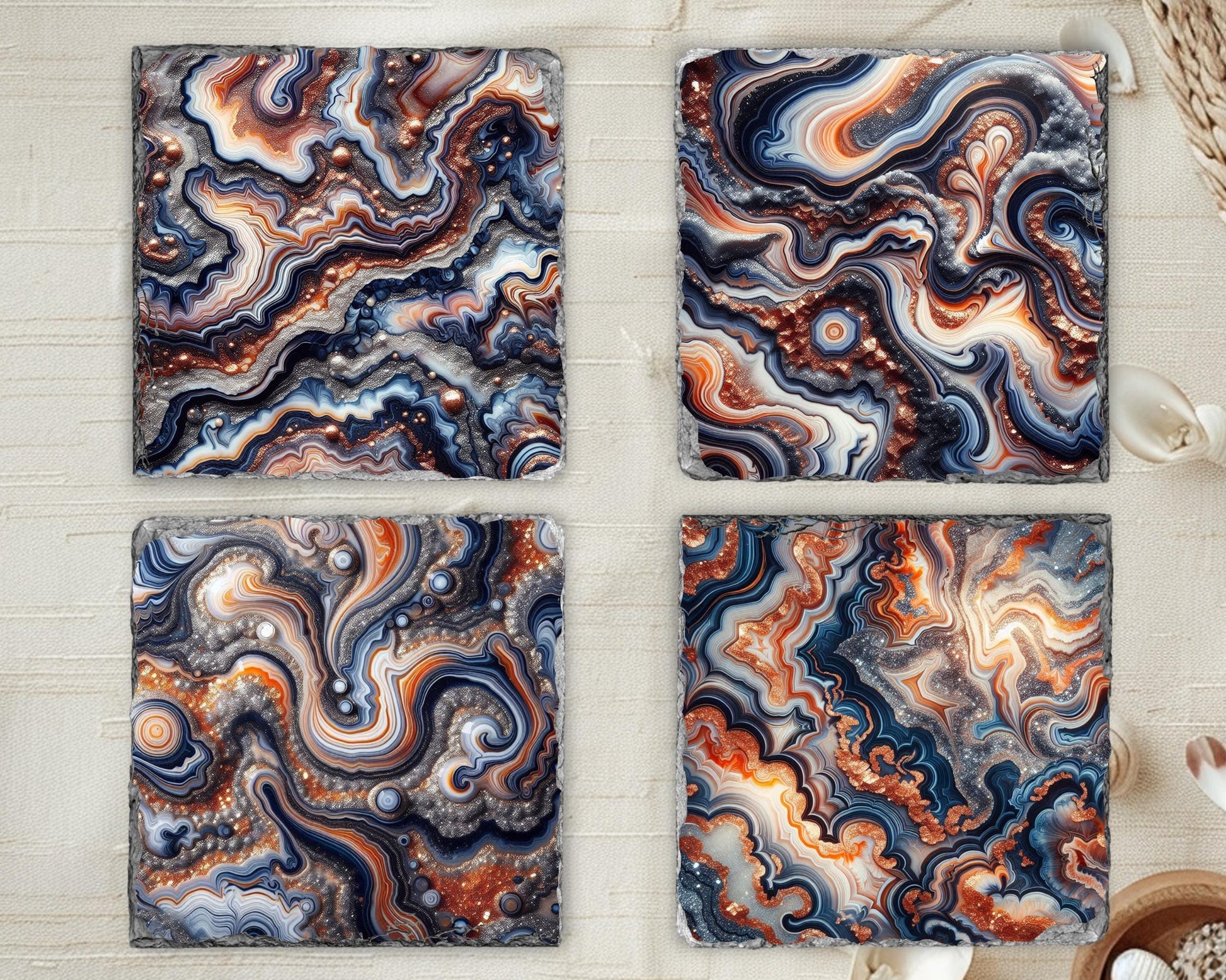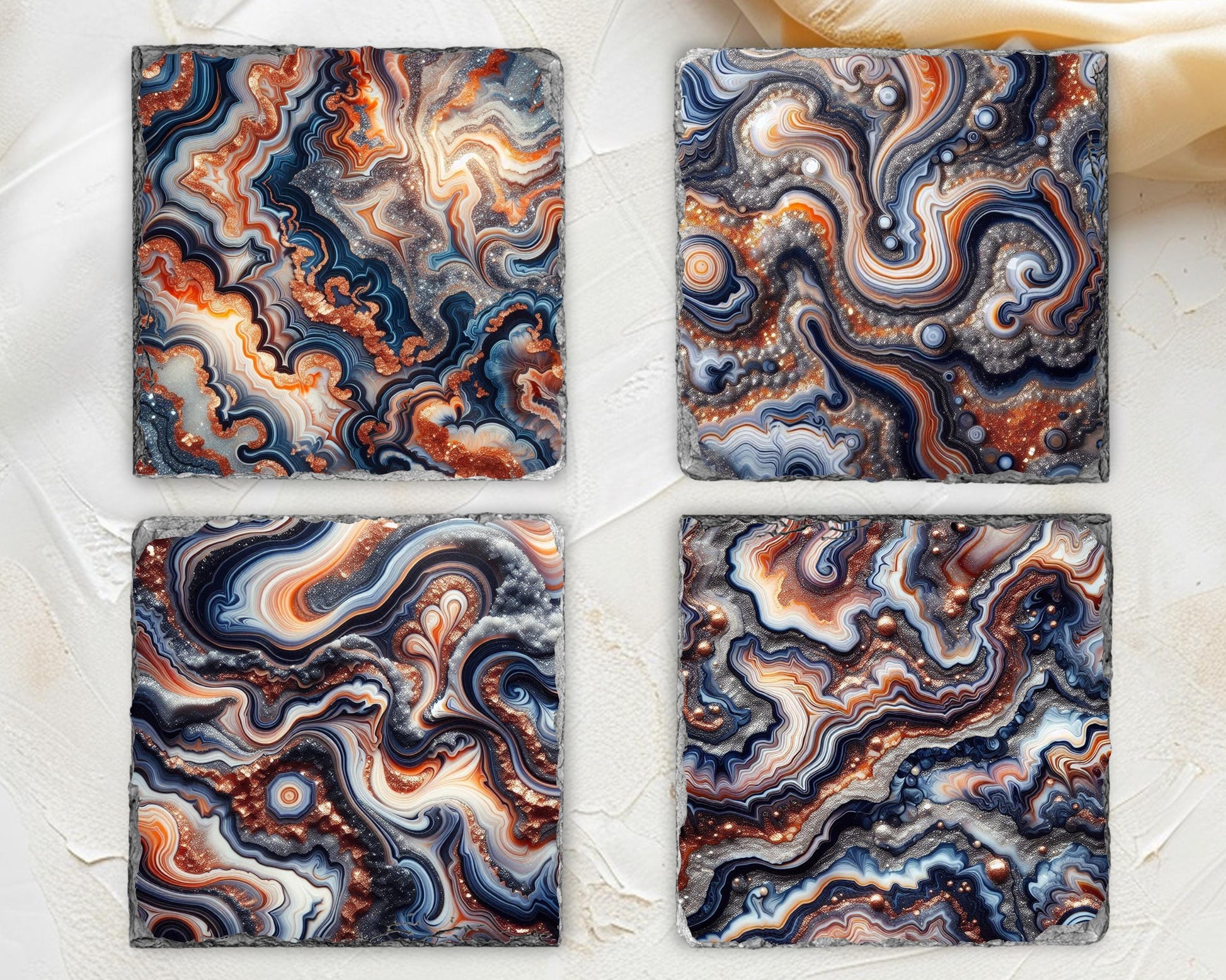 Enhance your home decor with this beautifully crafted set of four coasters, each measuring 3.5 x 3.5 inches. Showcasing captivating blue, orange, and faux silver glitter agate patterns, these coasters not only protect your surfaces but also add a stylish accent to any space. Made from natural slate, each piece features distinctive fractured edges that contribute to its unique, rugged charm.