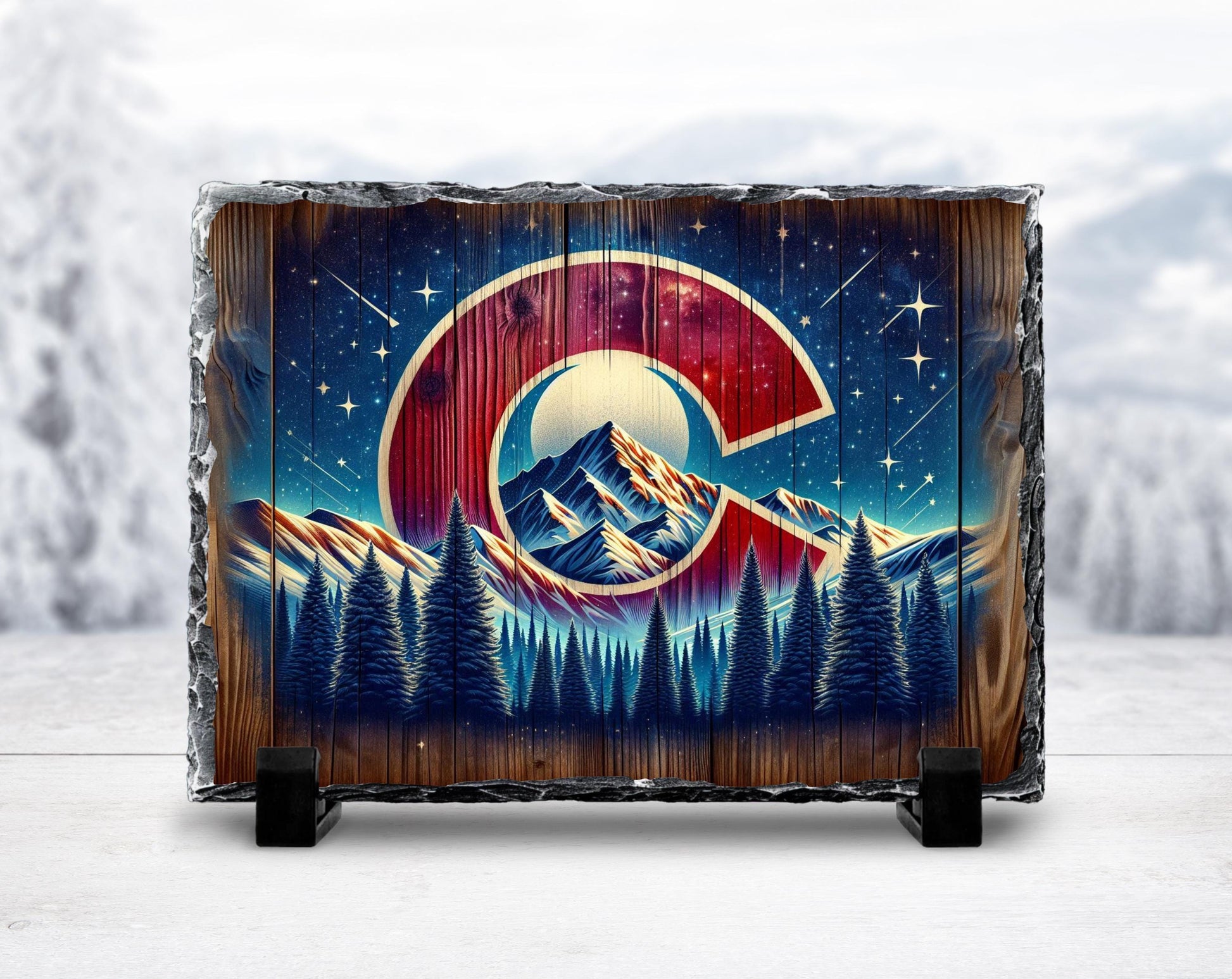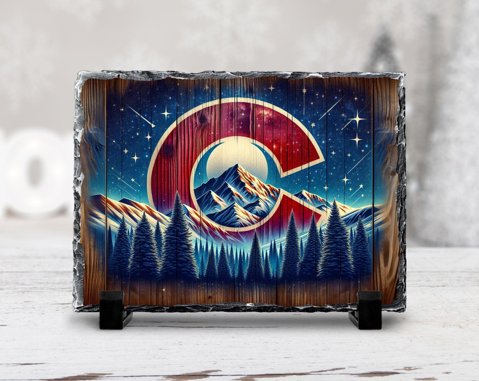 Bring the stunning beauty of Colorado into your home with this handcrafted slate art piece. Measuring 5.85 x 7.8 inches, this natural slate features beautifully fractured edges that enhance its rustic charm. Using a sublimation printing technique, the artwork vividly portrays Colorado’s iconic mountains beneath a starry night sky, complete with a glowing moon, shooting stars, and pine trees, along with the Red Wood C emblem at the center.