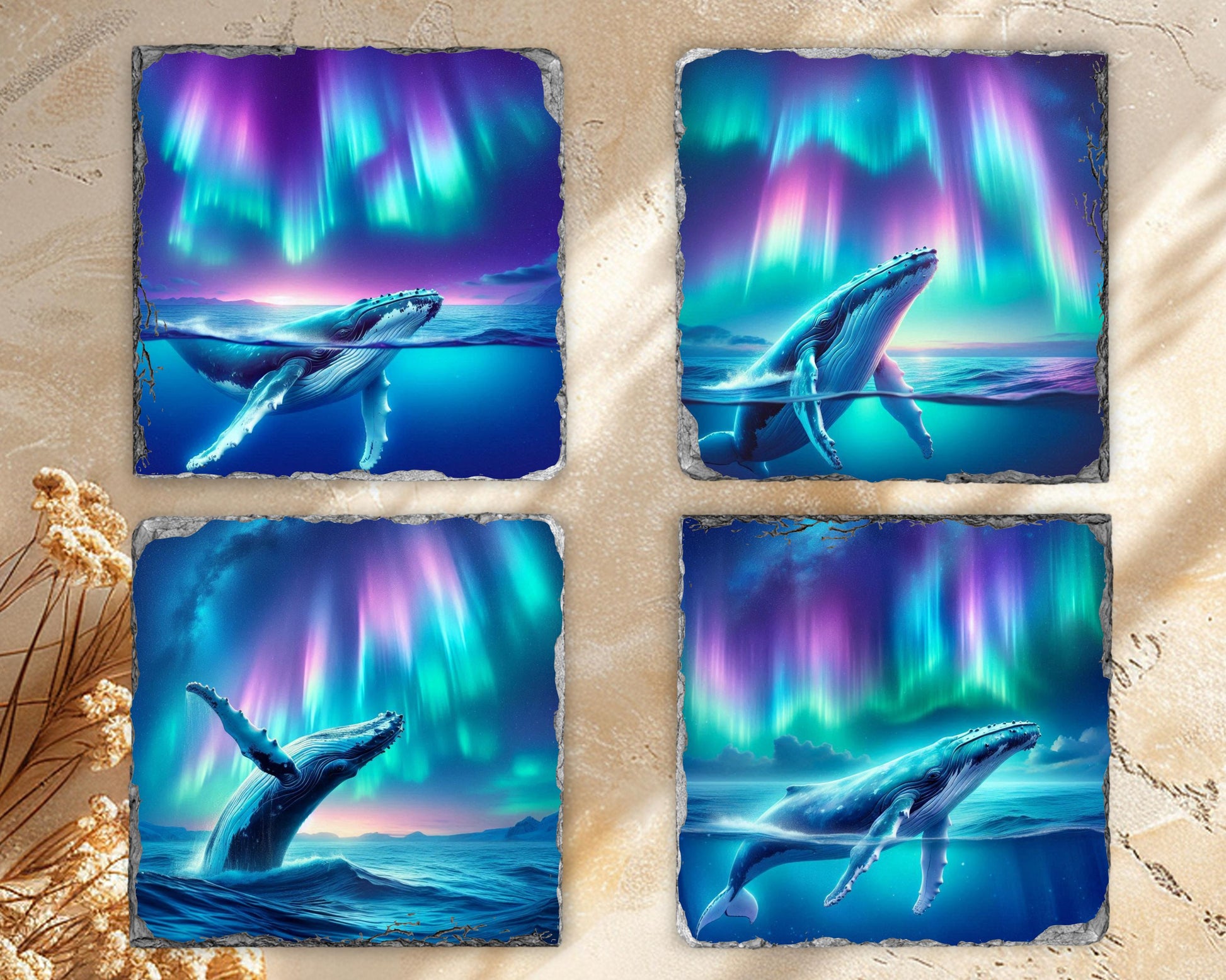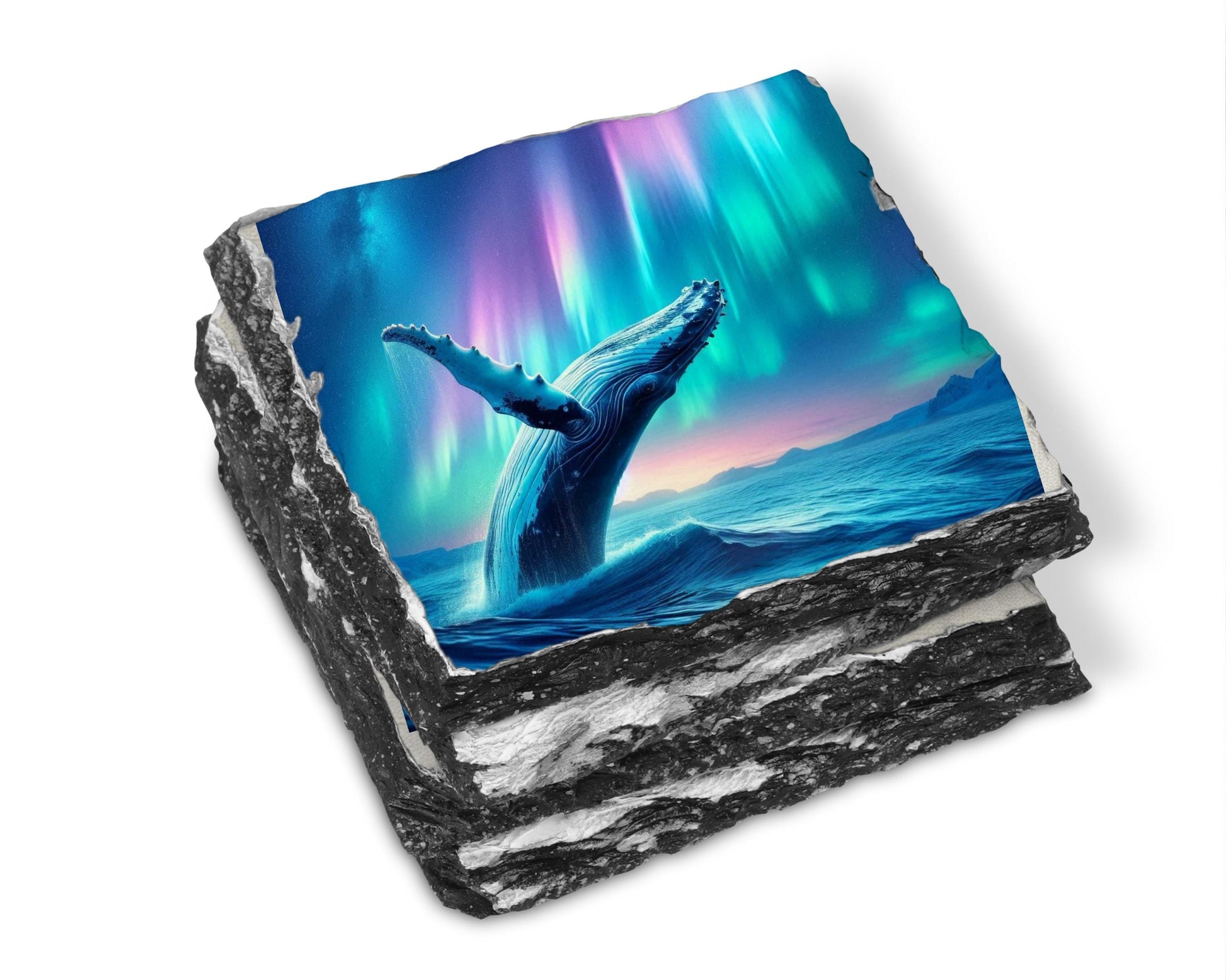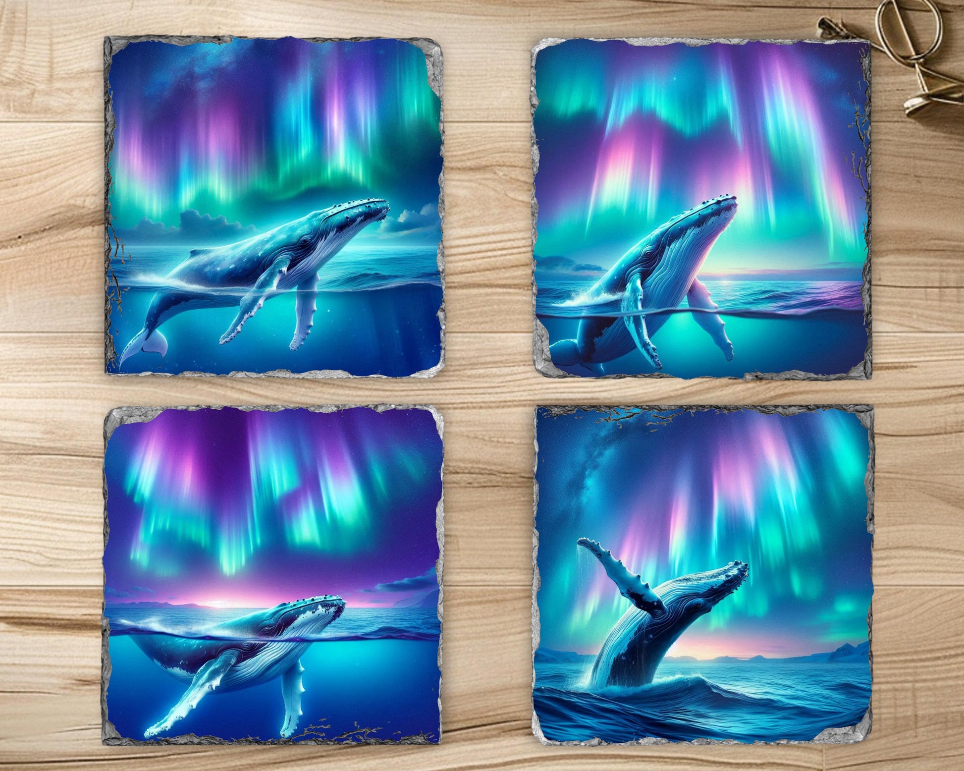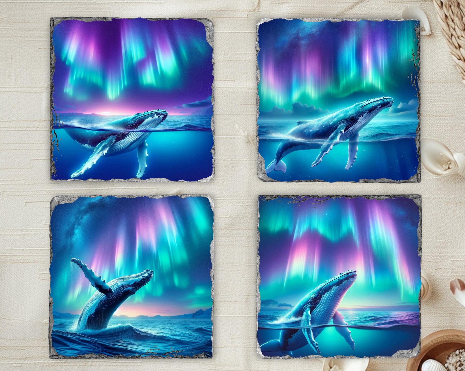 Humpback Whale Slate Coaster Set Ocean Art Gift for Whale Lovers Featuring Northern Lights Design