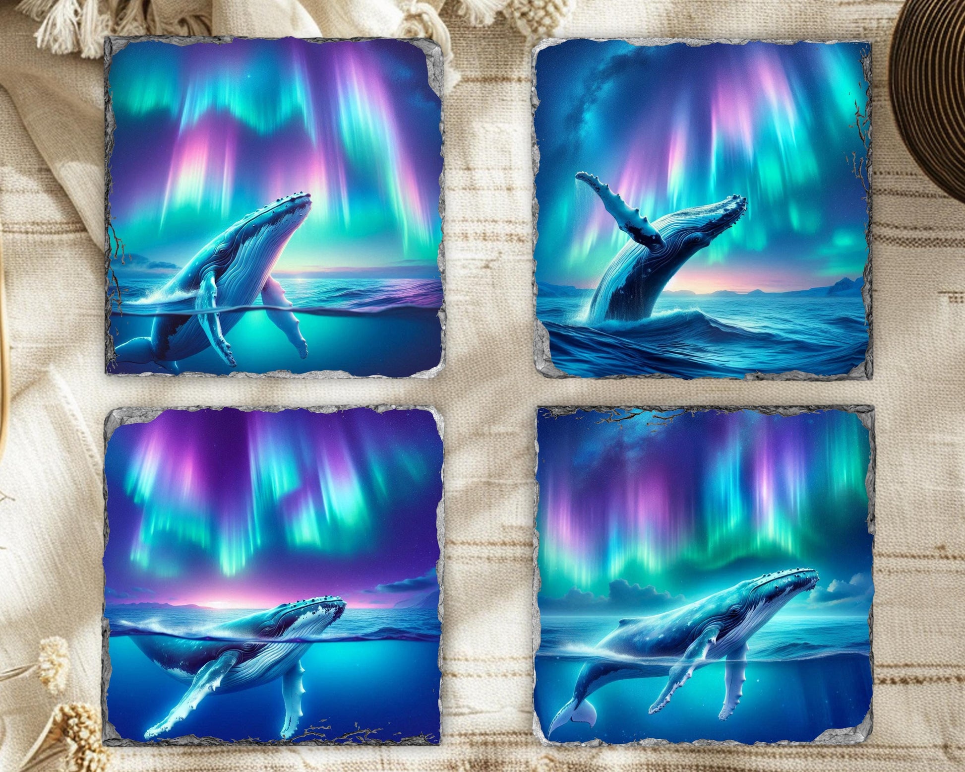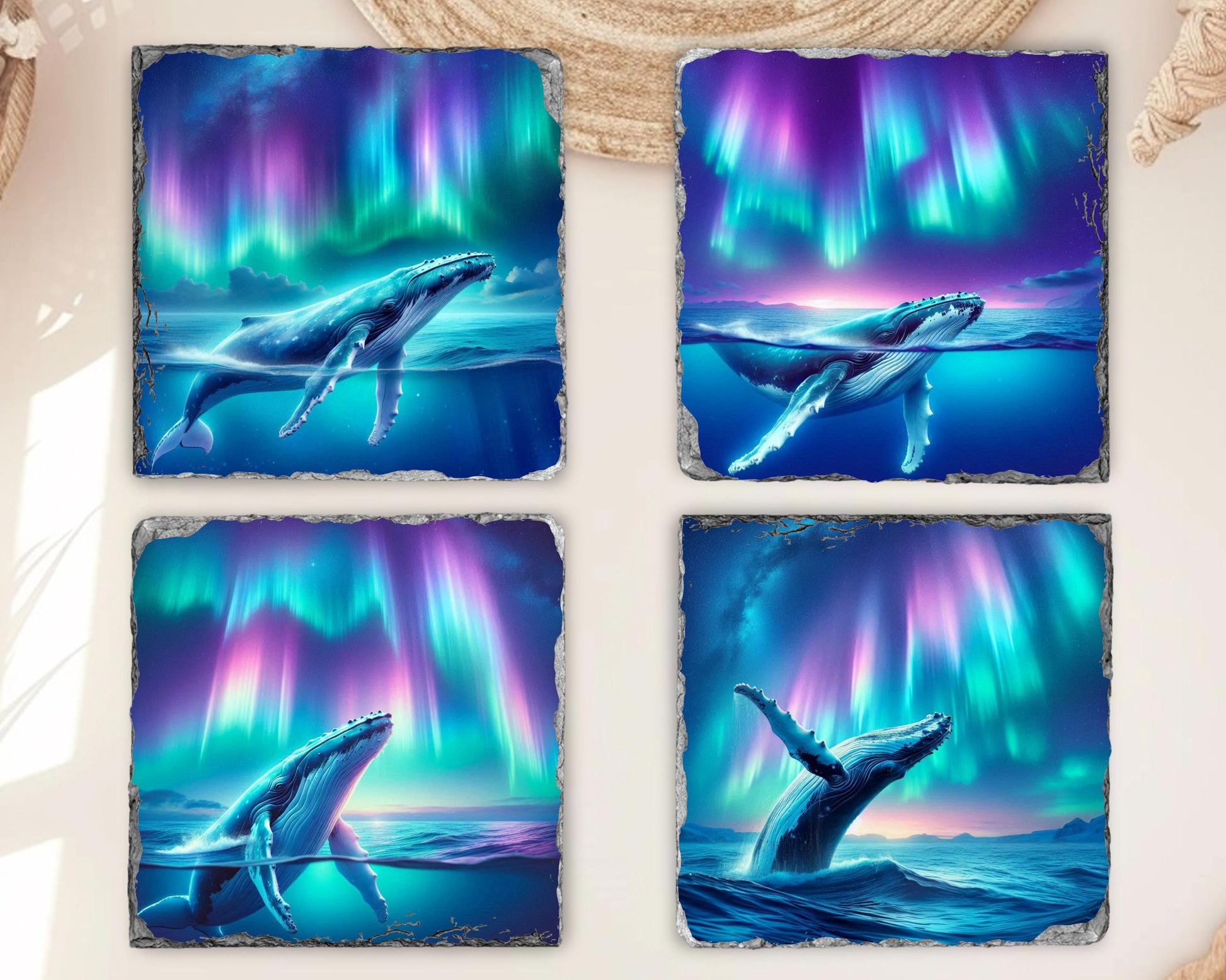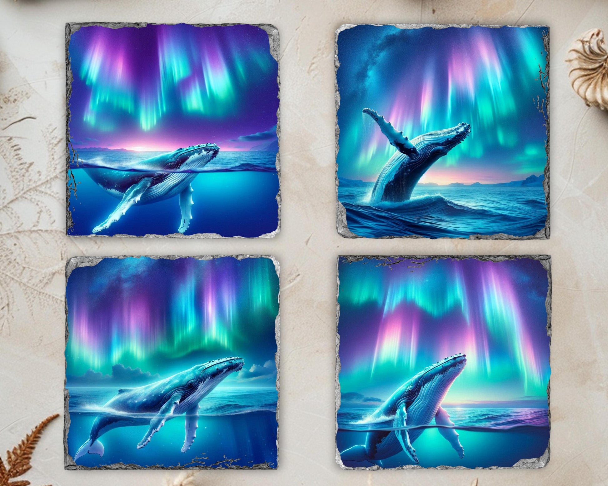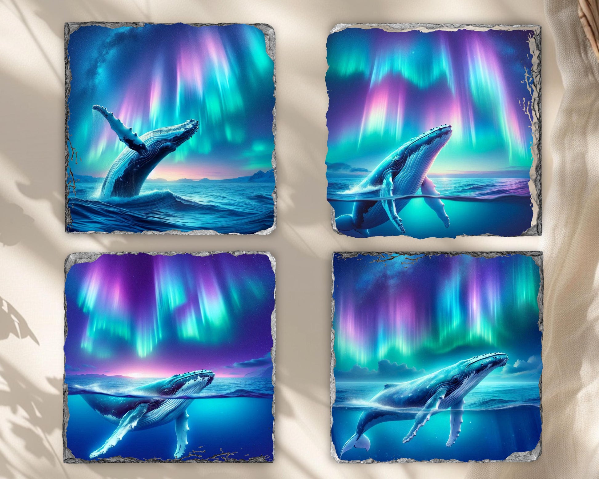 Humpback Whale Slate Coaster Set Ocean Art Gift for Whale Lovers Featuring Northern Lights Design