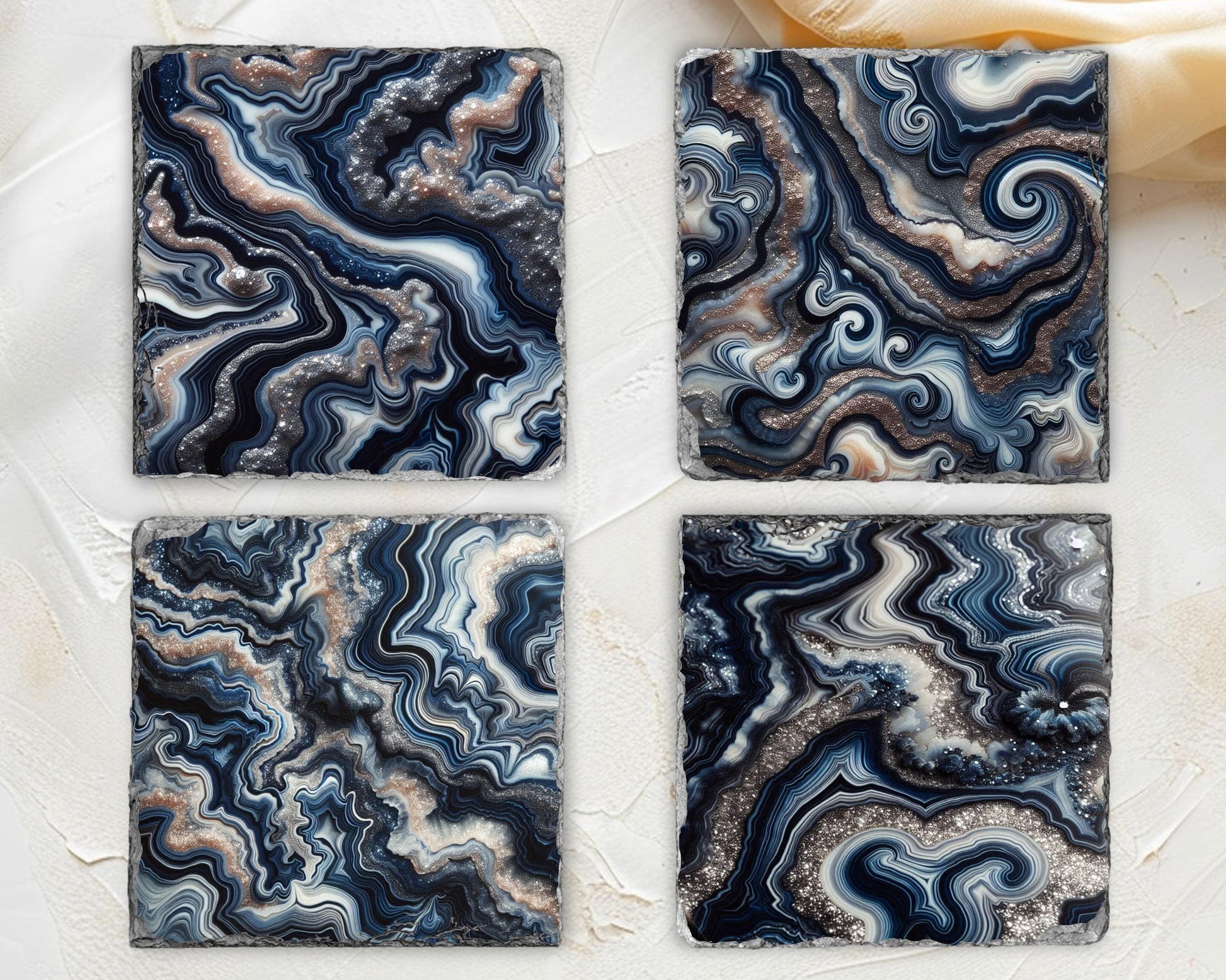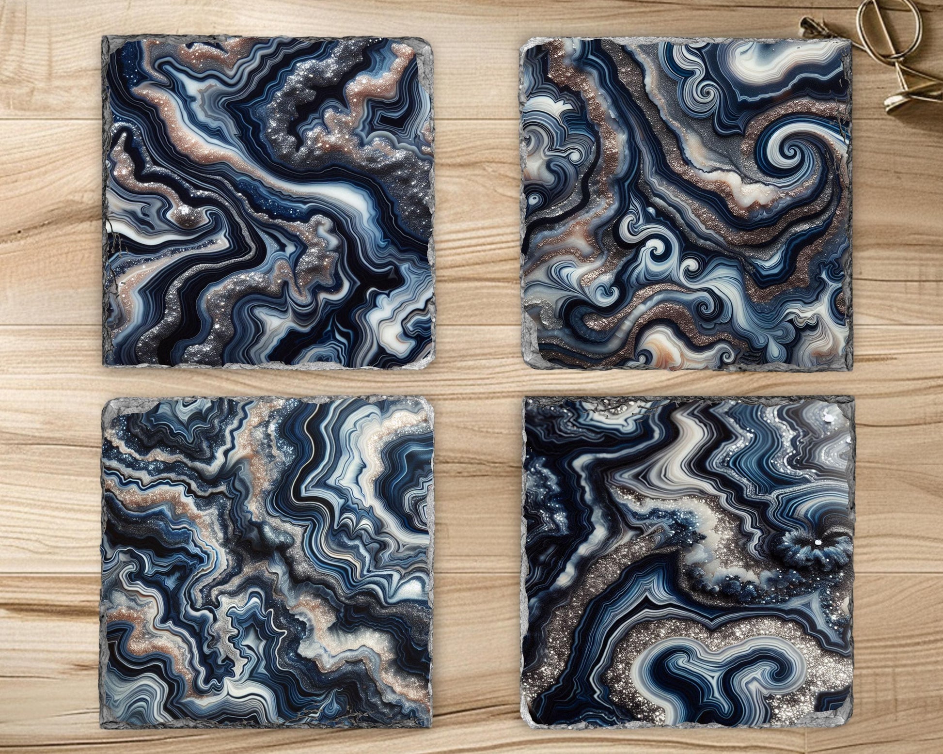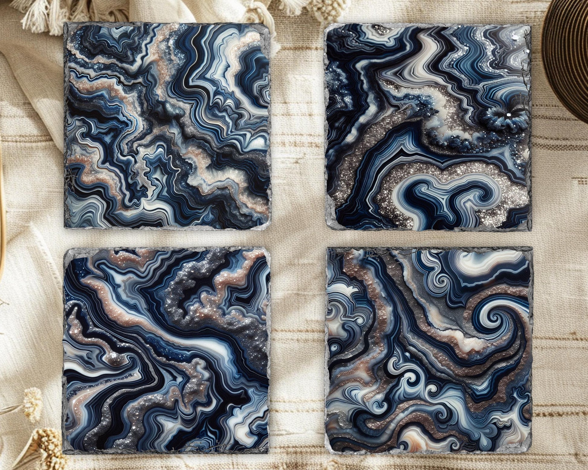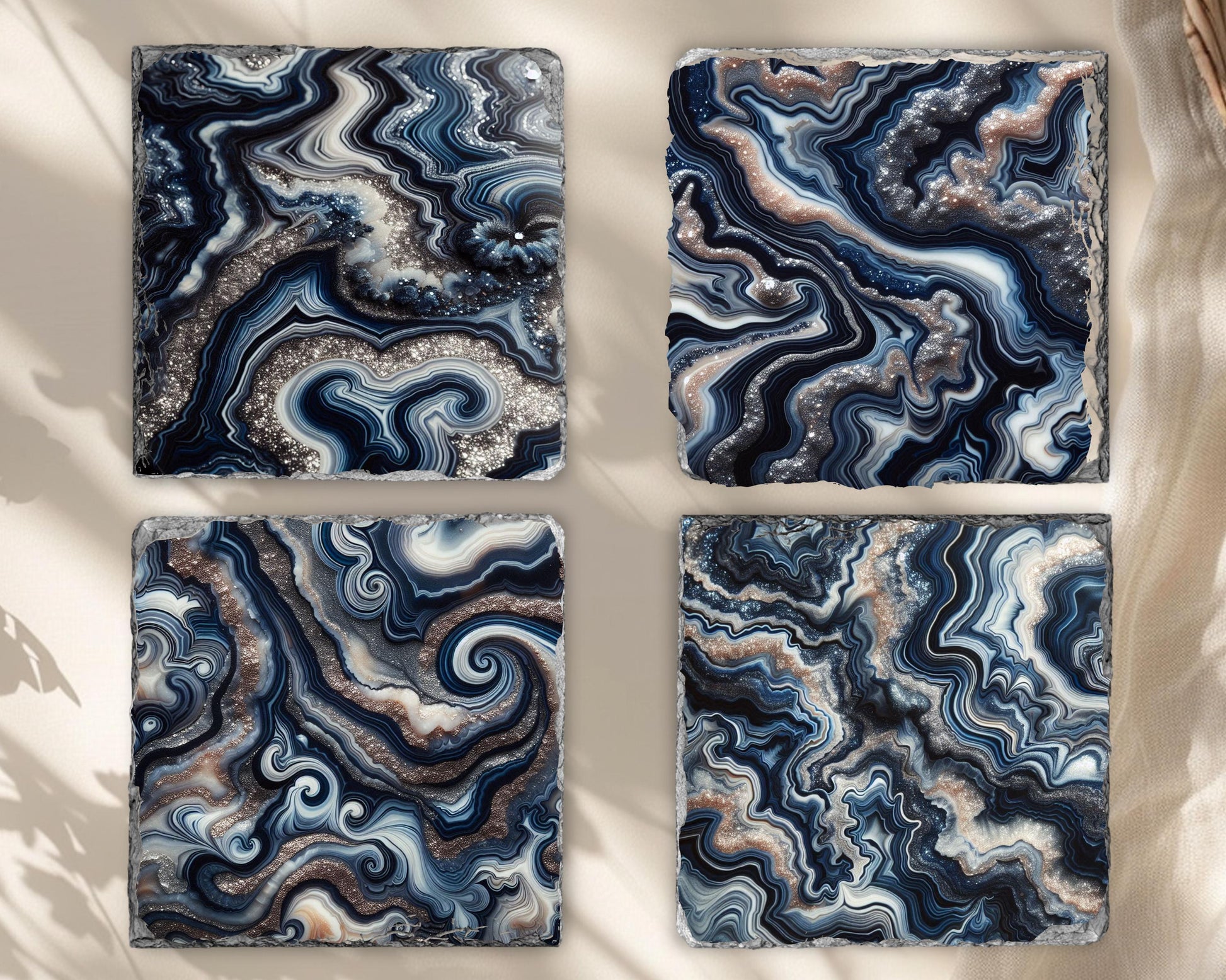 Navy Blue Silver Agate Pattern Slate Coasters - Set of 4 Ideal Housewarming Gift for Boho Home Decor