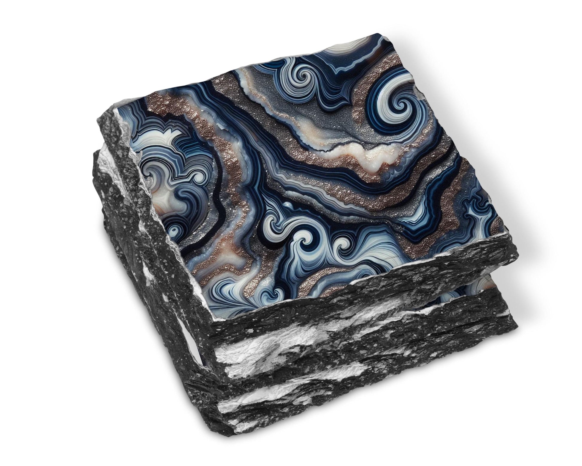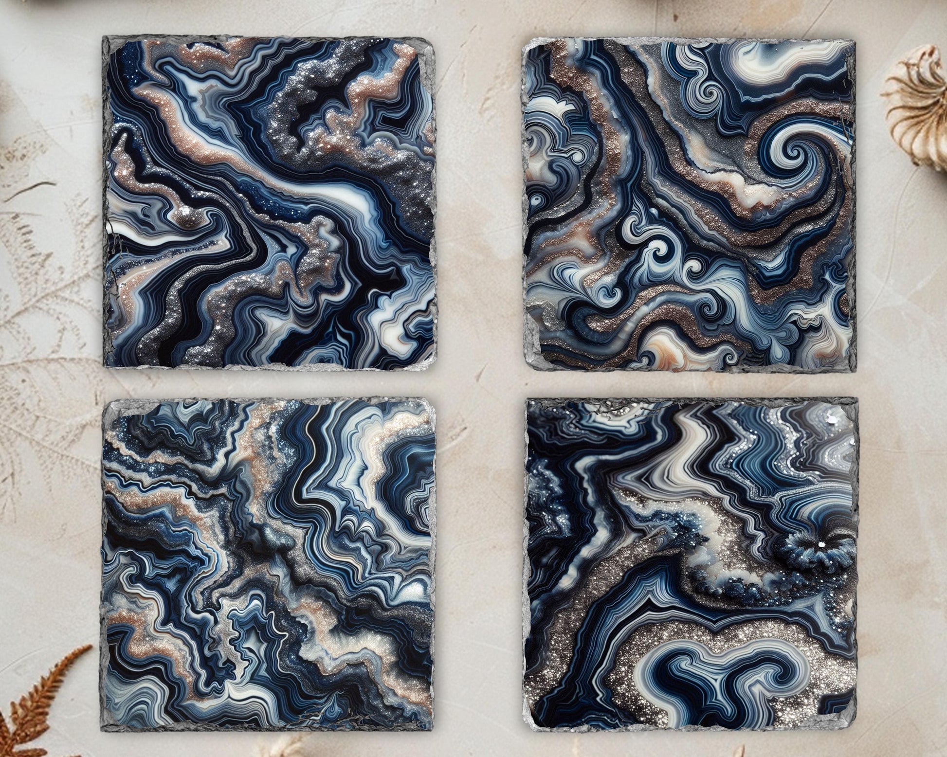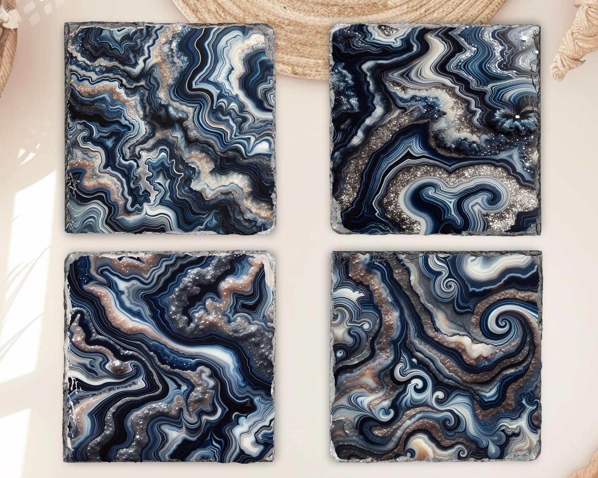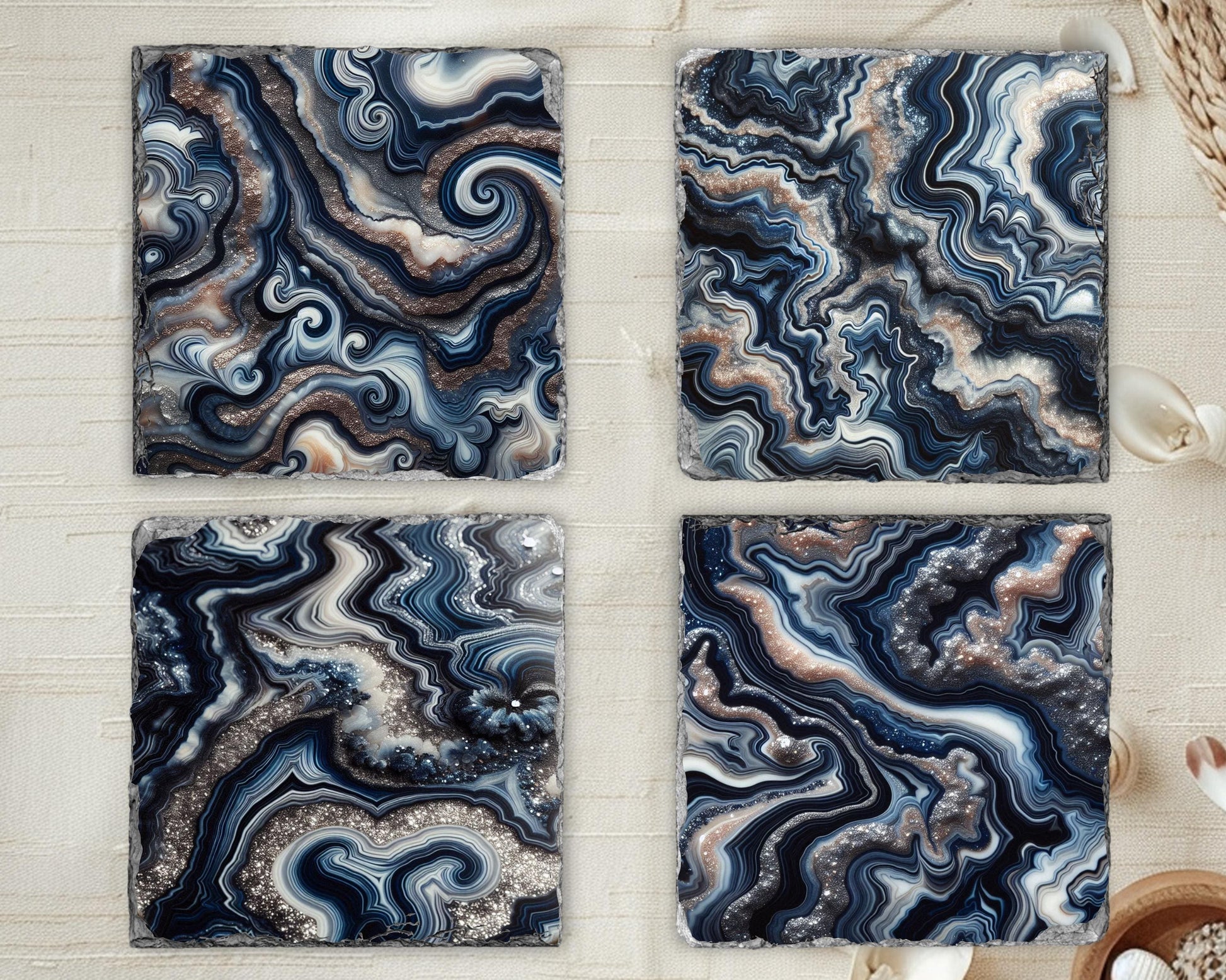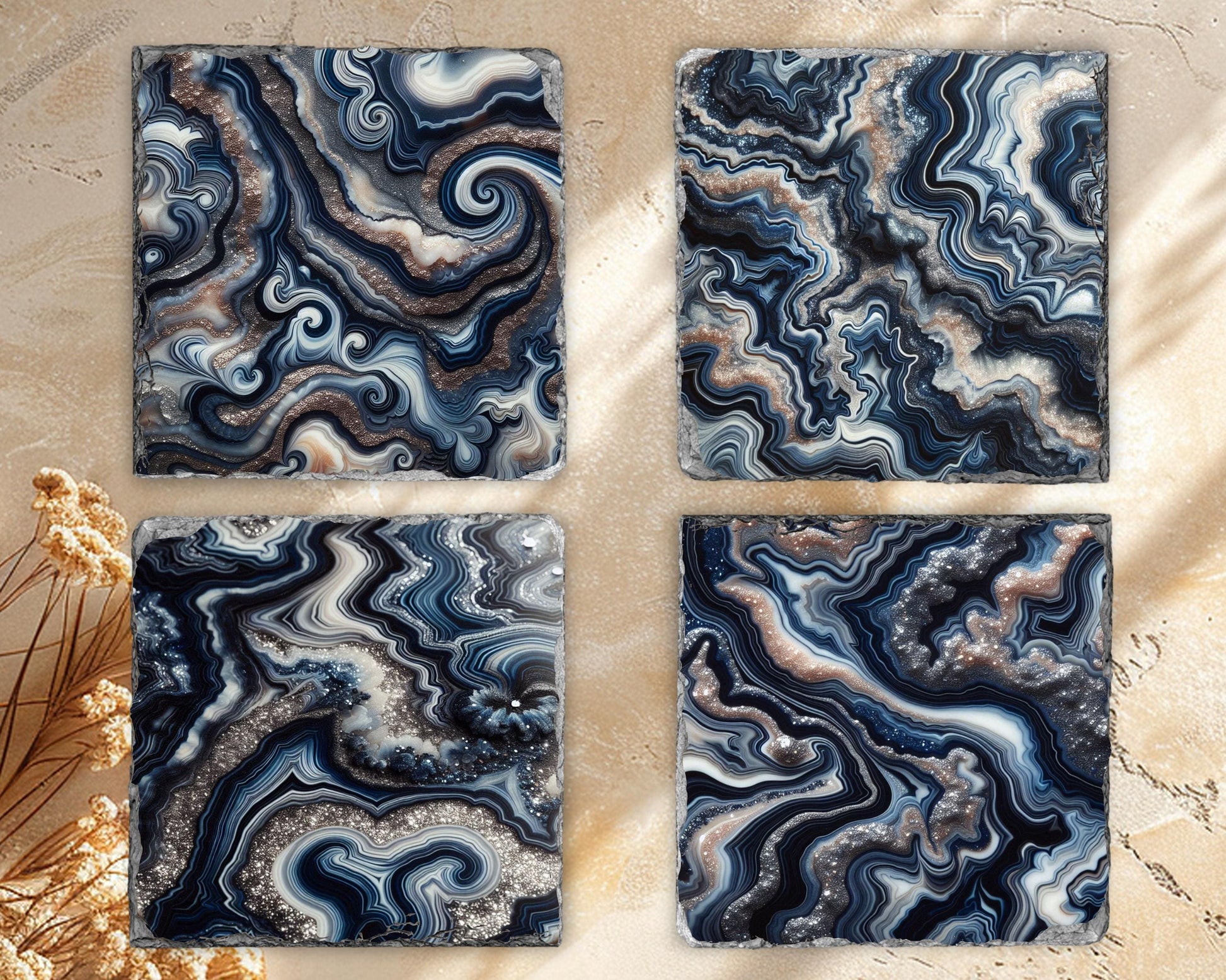 Navy Blue Silver Agate Pattern Slate Coasters - Set of 4 Ideal Housewarming Gift for Boho Home Decor