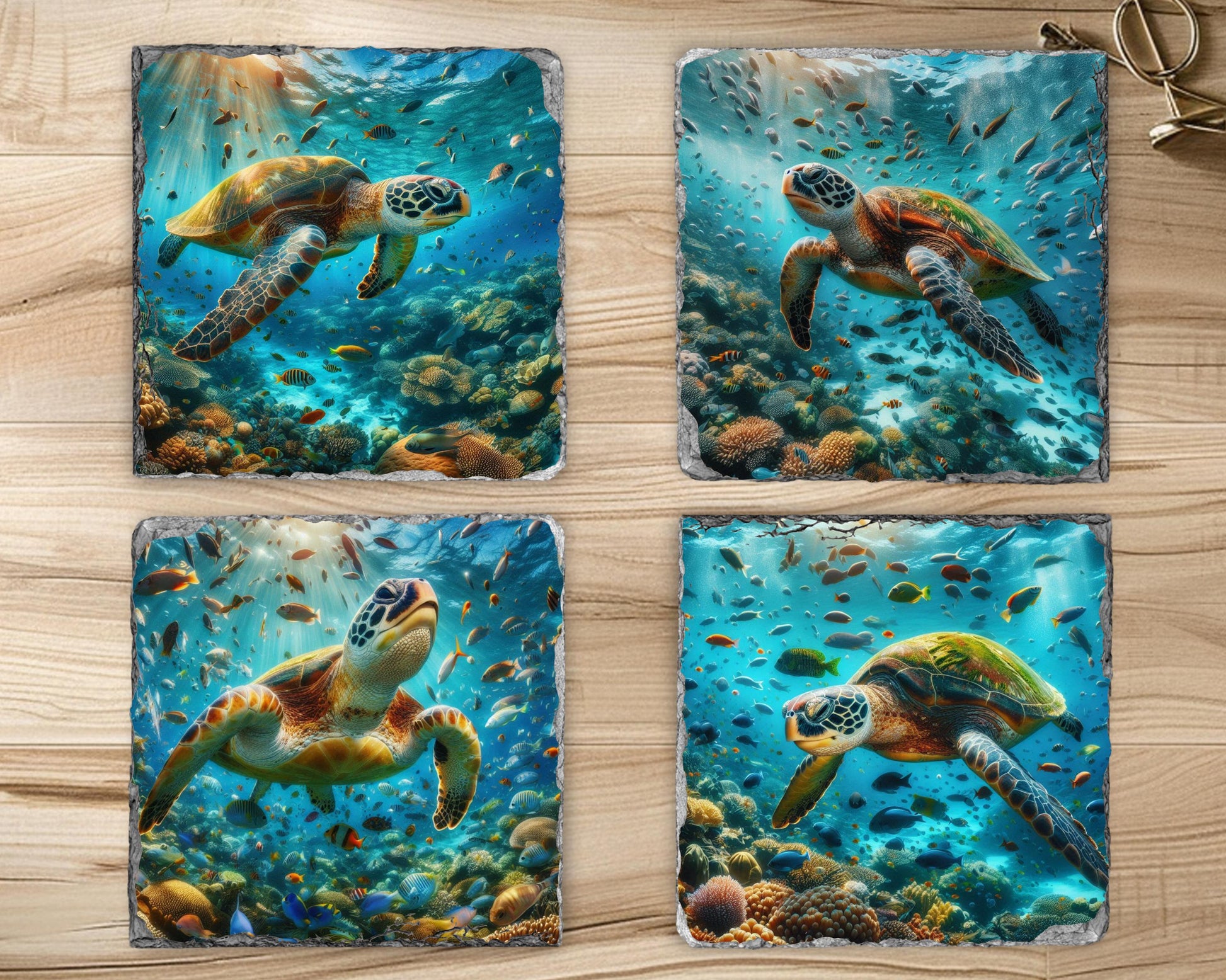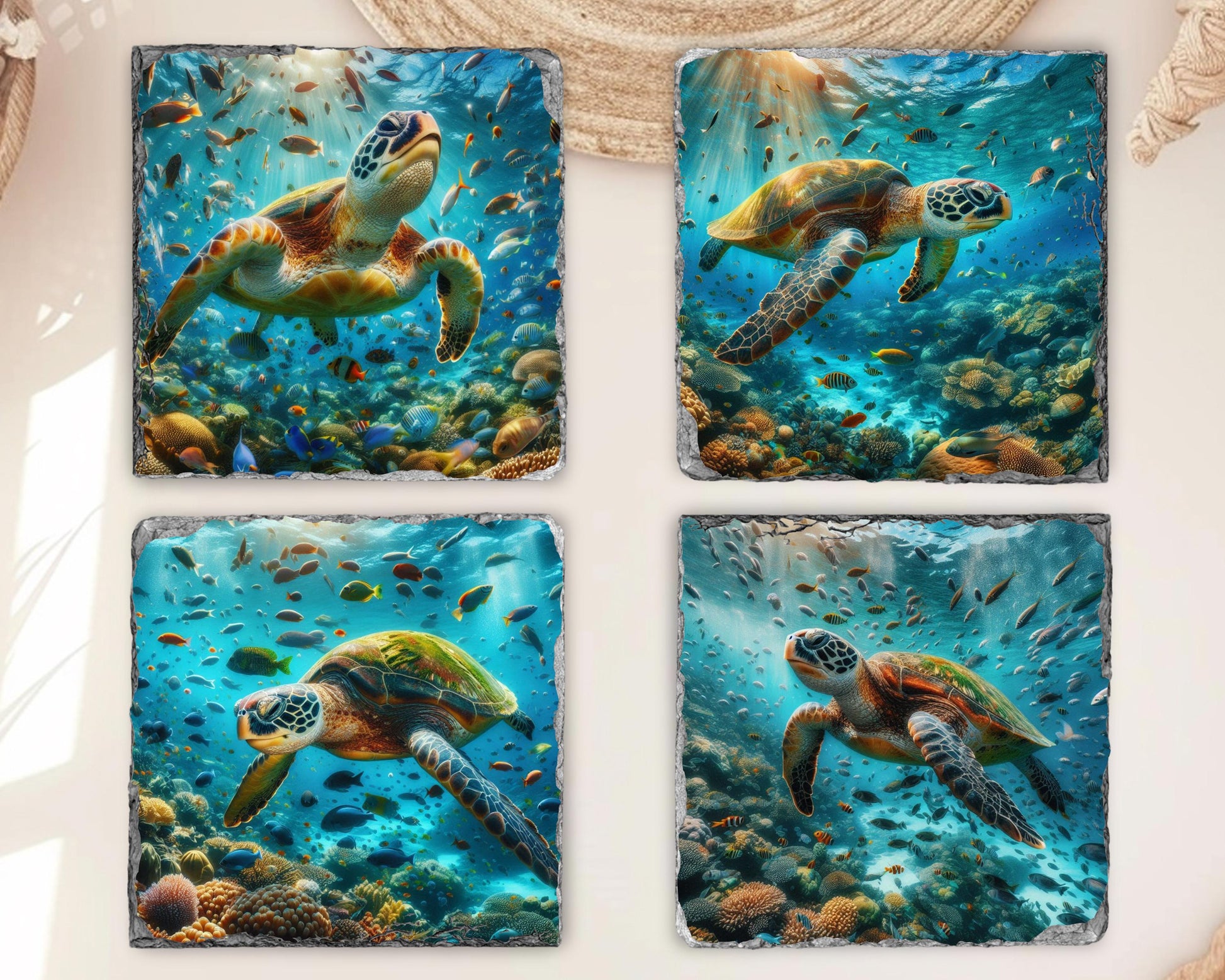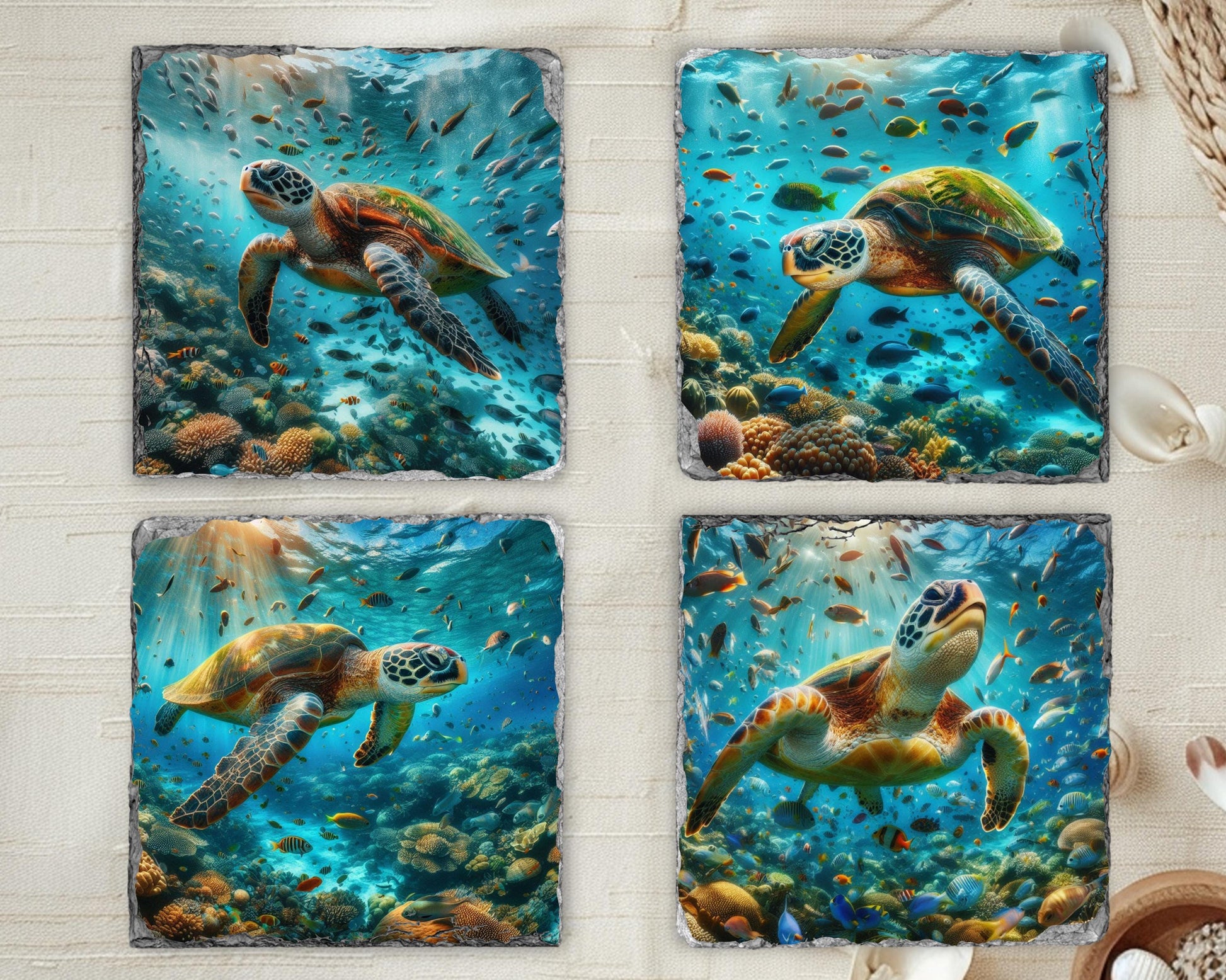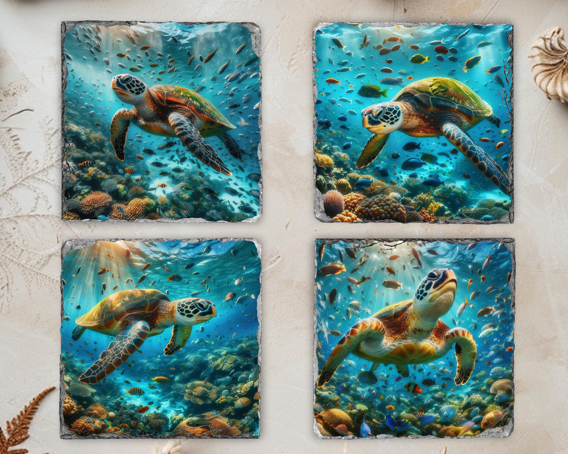 Measuring approximately 3.5" x 3.5" (with slight variations of up to -0.04"), each coaster showcases the distinctive texture of natural slate, complemented by sublimated artwork that brings the ocean to life. The set includes four distinct ocean-themed designs, making them perfect for beach houses, ocean enthusiasts, or as thoughtful gifts for nature lovers. These coasters add a refreshing touch of sea life to any space and are ideal for birthdays, housewarmings, or holidays.