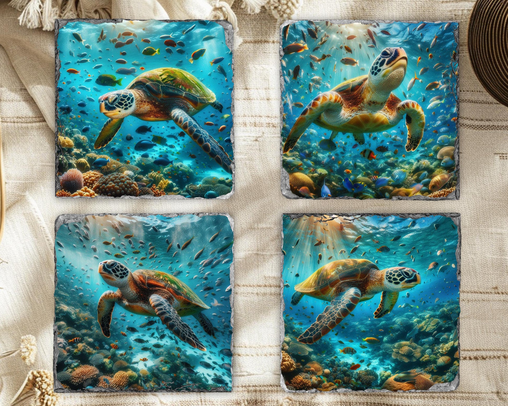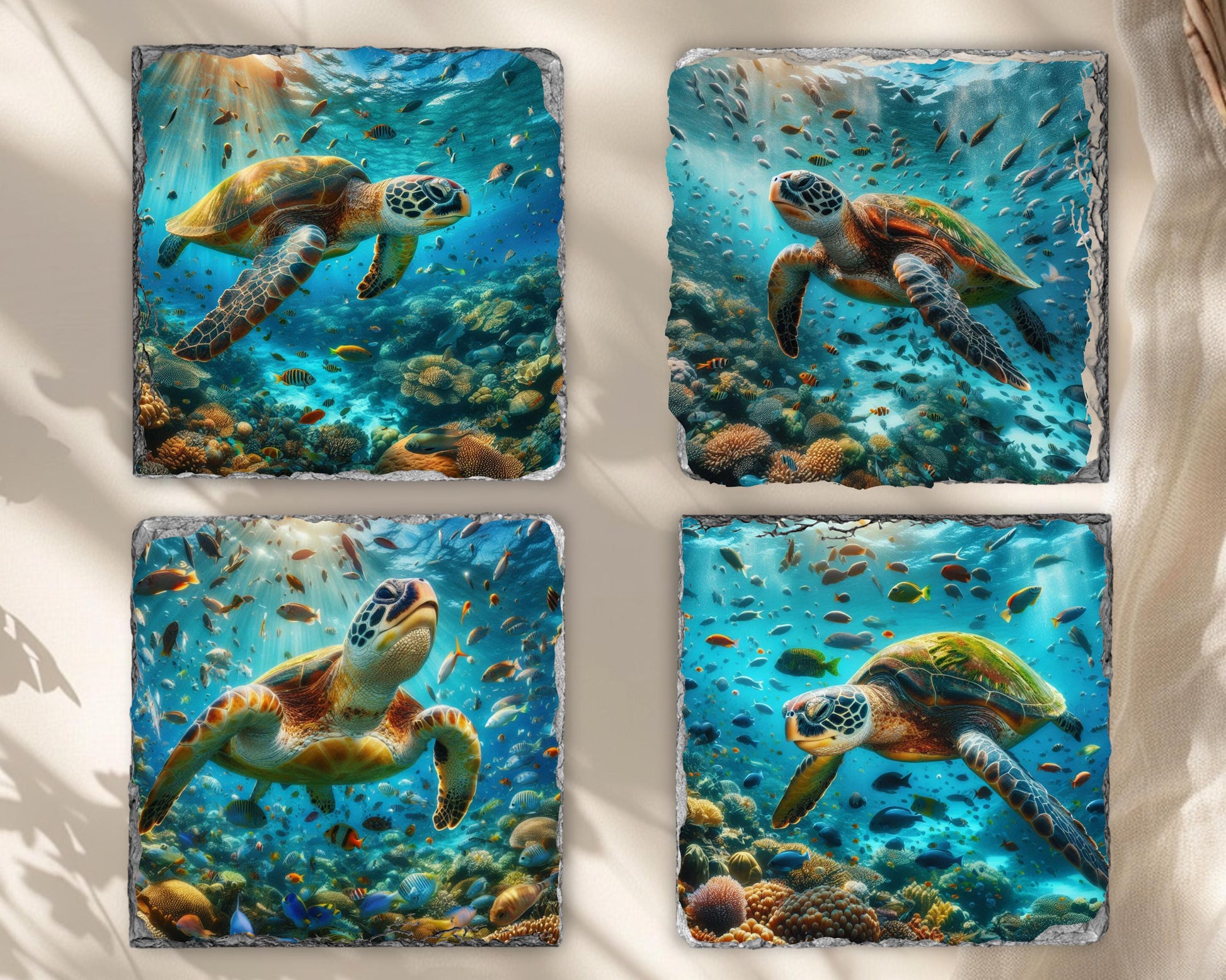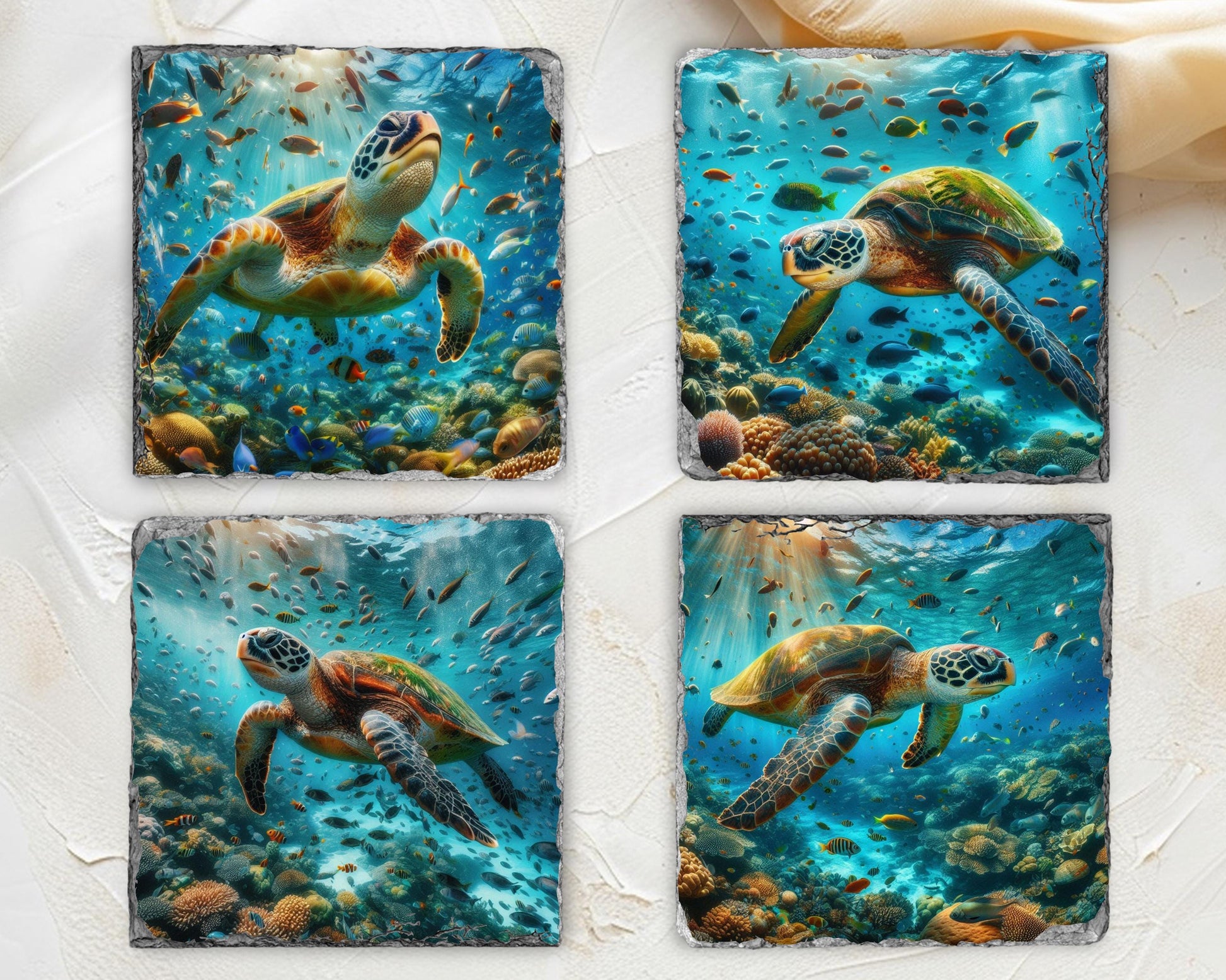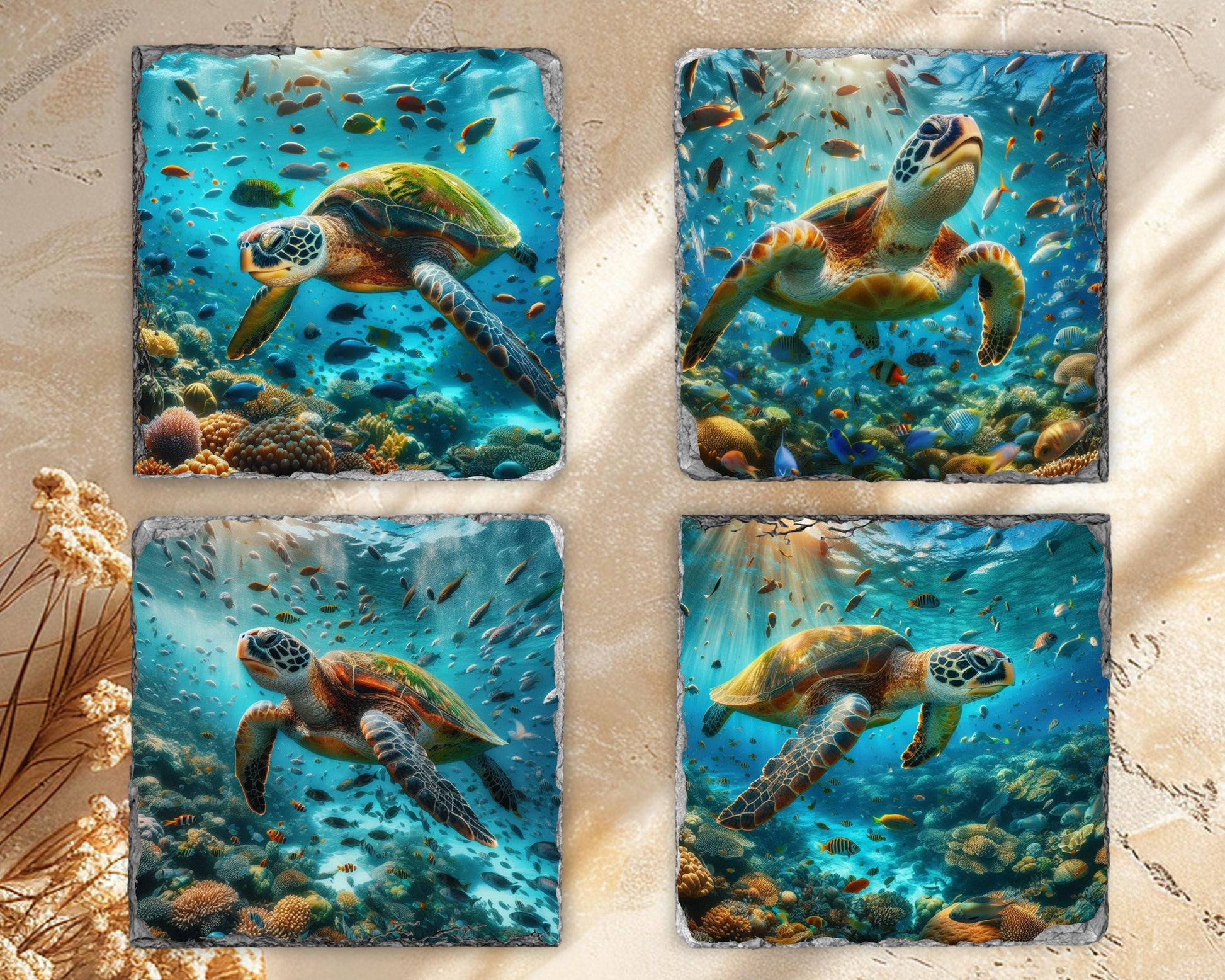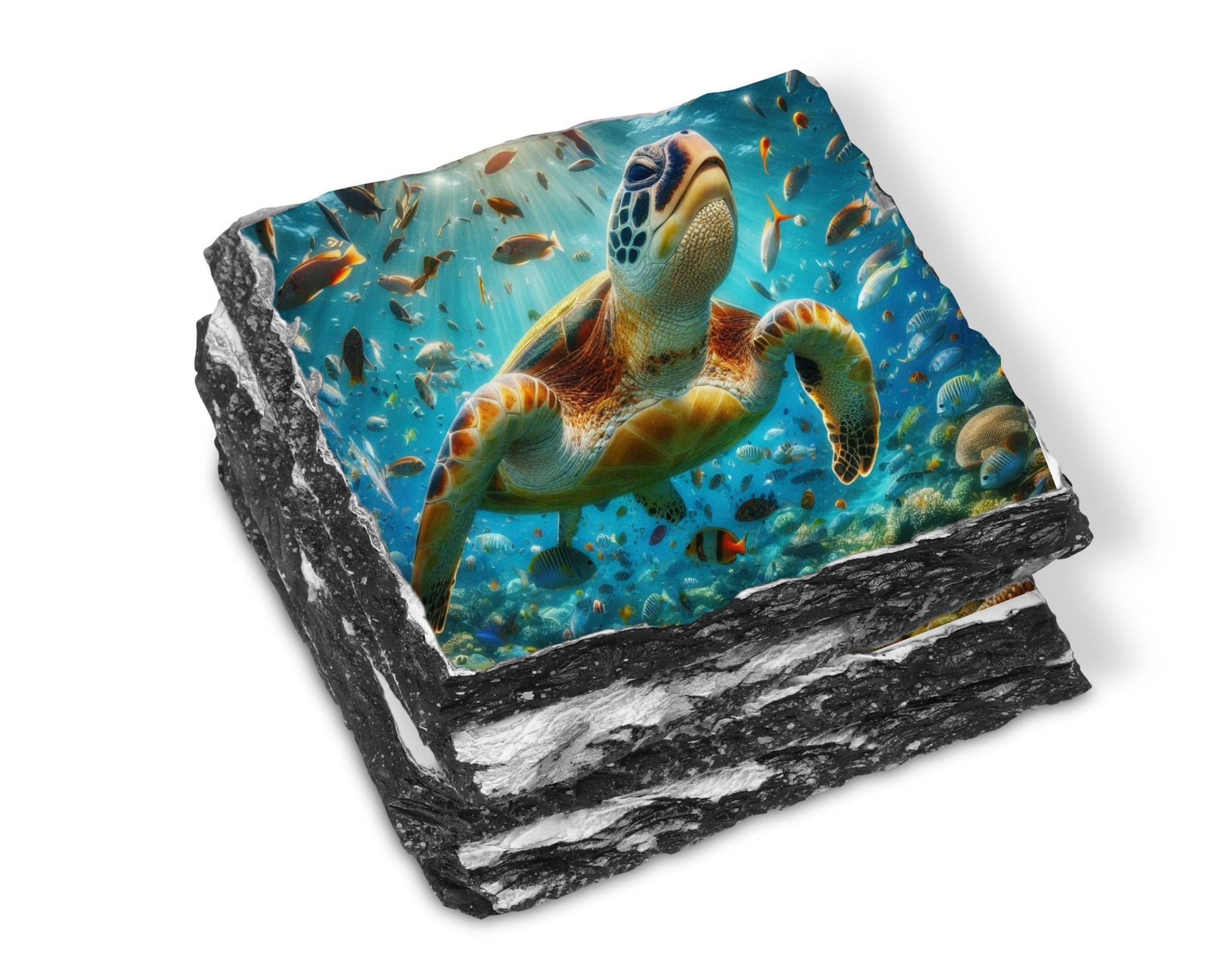 Measuring approximately 3.5" x 3.5" (with slight variations of up to -0.04"), each coaster showcases the distinctive texture of natural slate, complemented by sublimated artwork that brings the ocean to life. The set includes four distinct ocean-themed designs, making them perfect for beach houses, ocean enthusiasts, or as thoughtful gifts for nature lovers. These coasters add a refreshing touch of sea life to any space and are ideal for birthdays, housewarmings, or holidays.