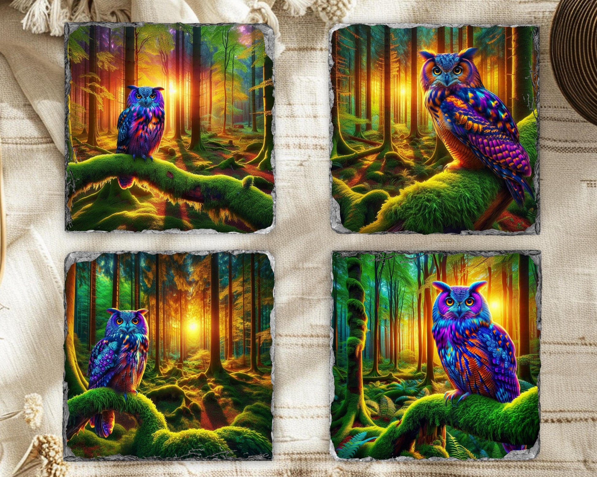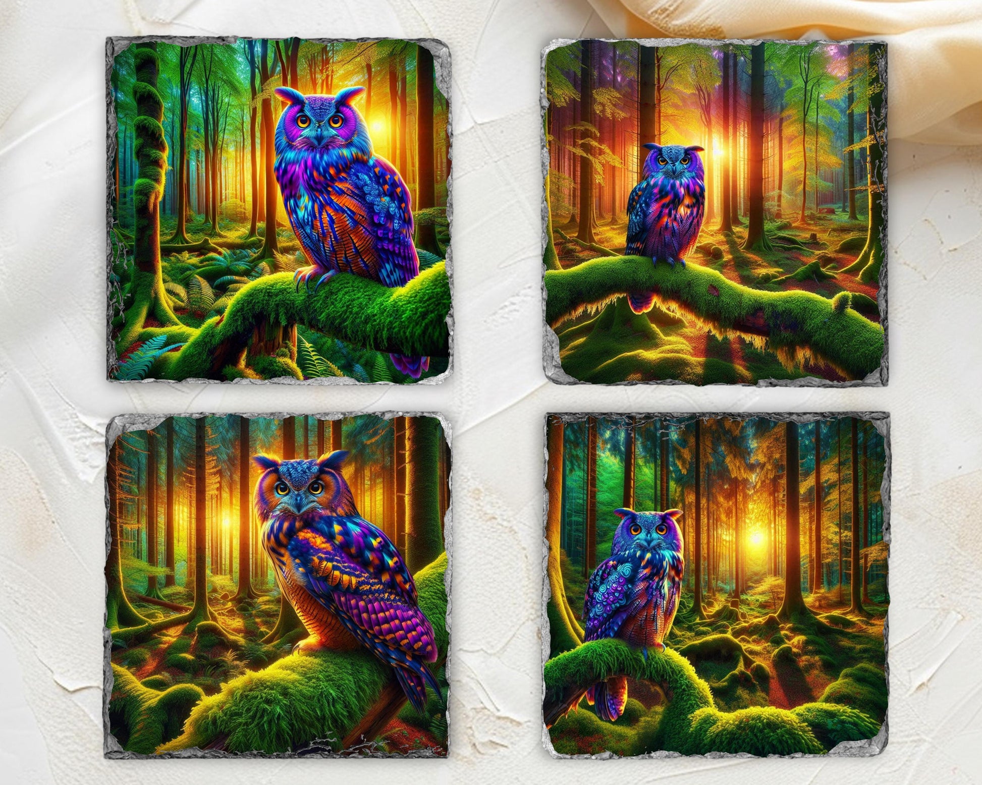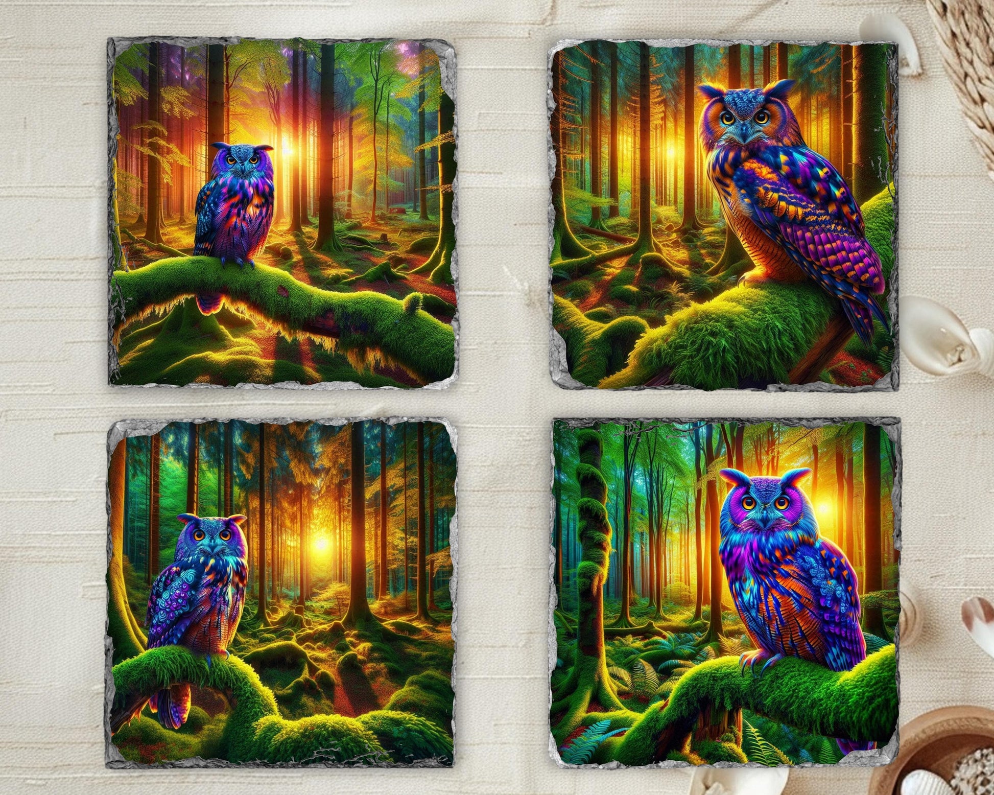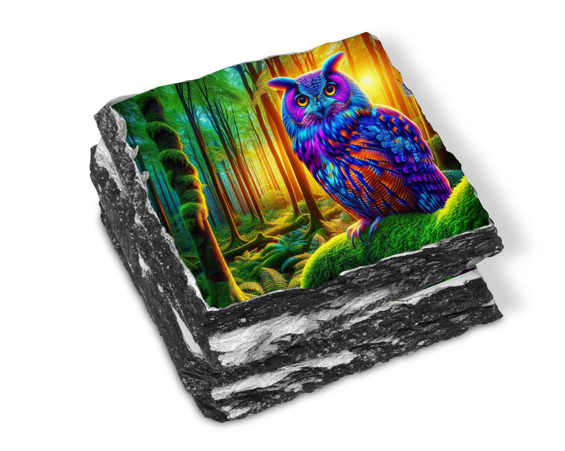 Elevate your dining experience with this charming set of four 3.5″ square slate coasters, each featuring a stunning illustration of a vibrant owl perched on a moss-covered branch in a tranquil woodland scene at dusk. The high-resolution sublimation printing ensures that the colors remain bright and enduring over time. Made from natural slate, each coaster showcases unique fractured edges, adding a touch of character and charm, with size variations of up to 0.04″.