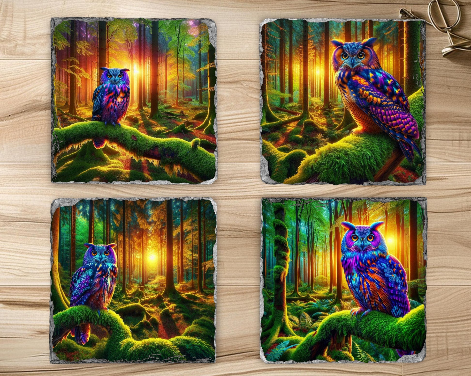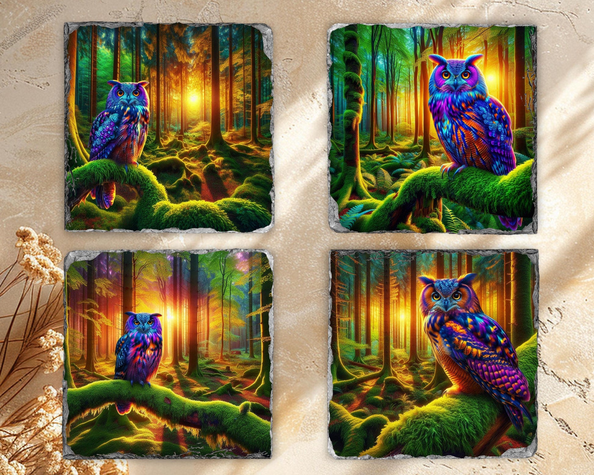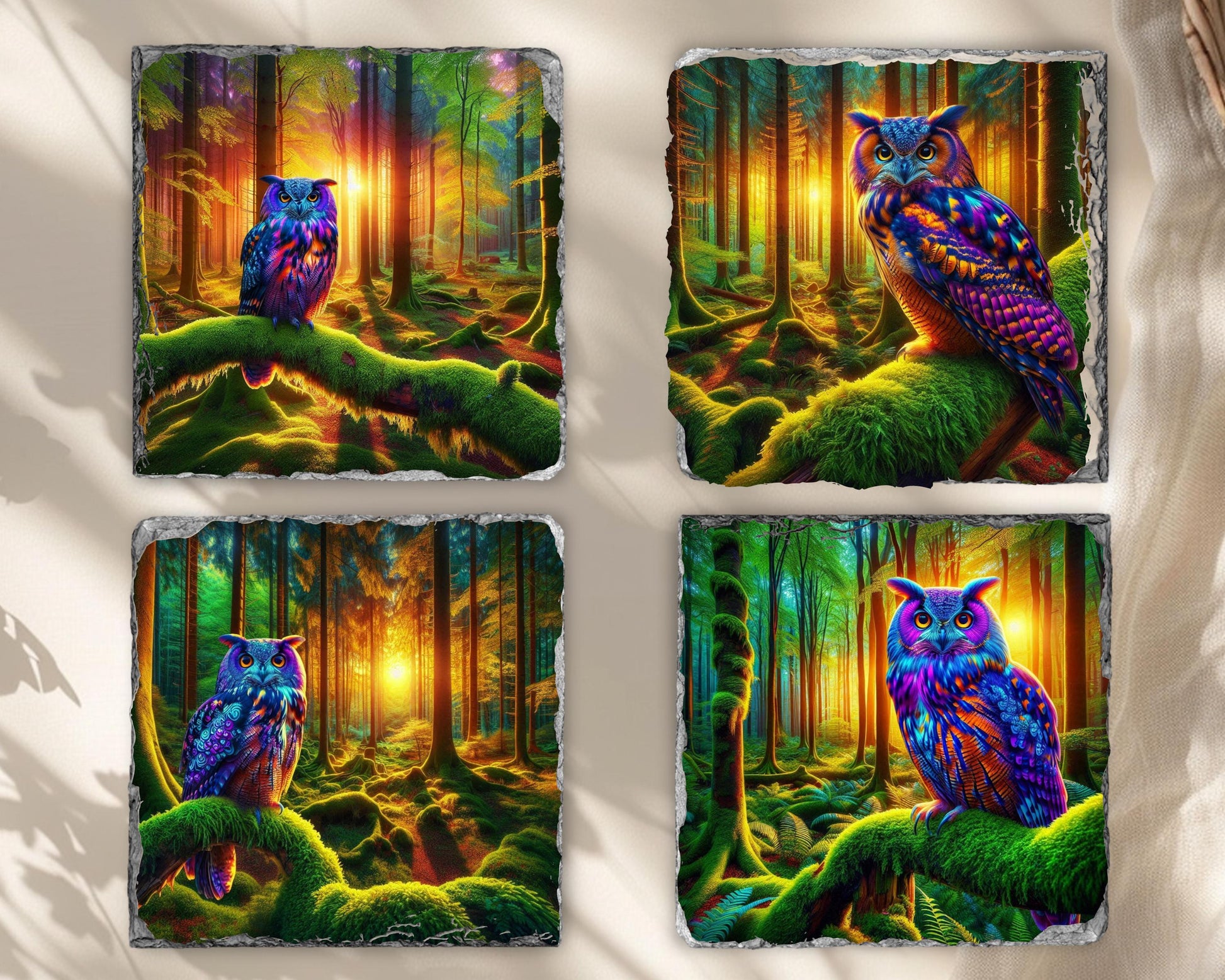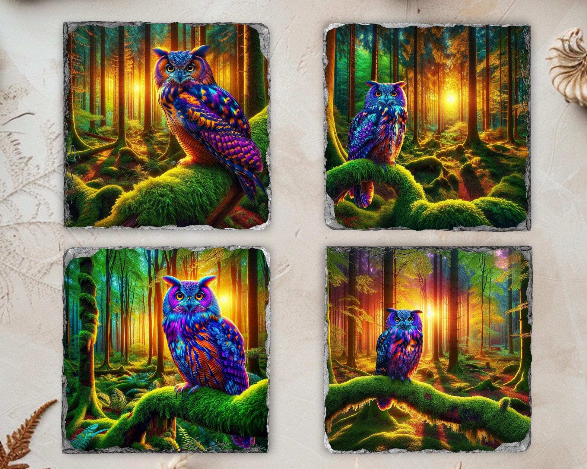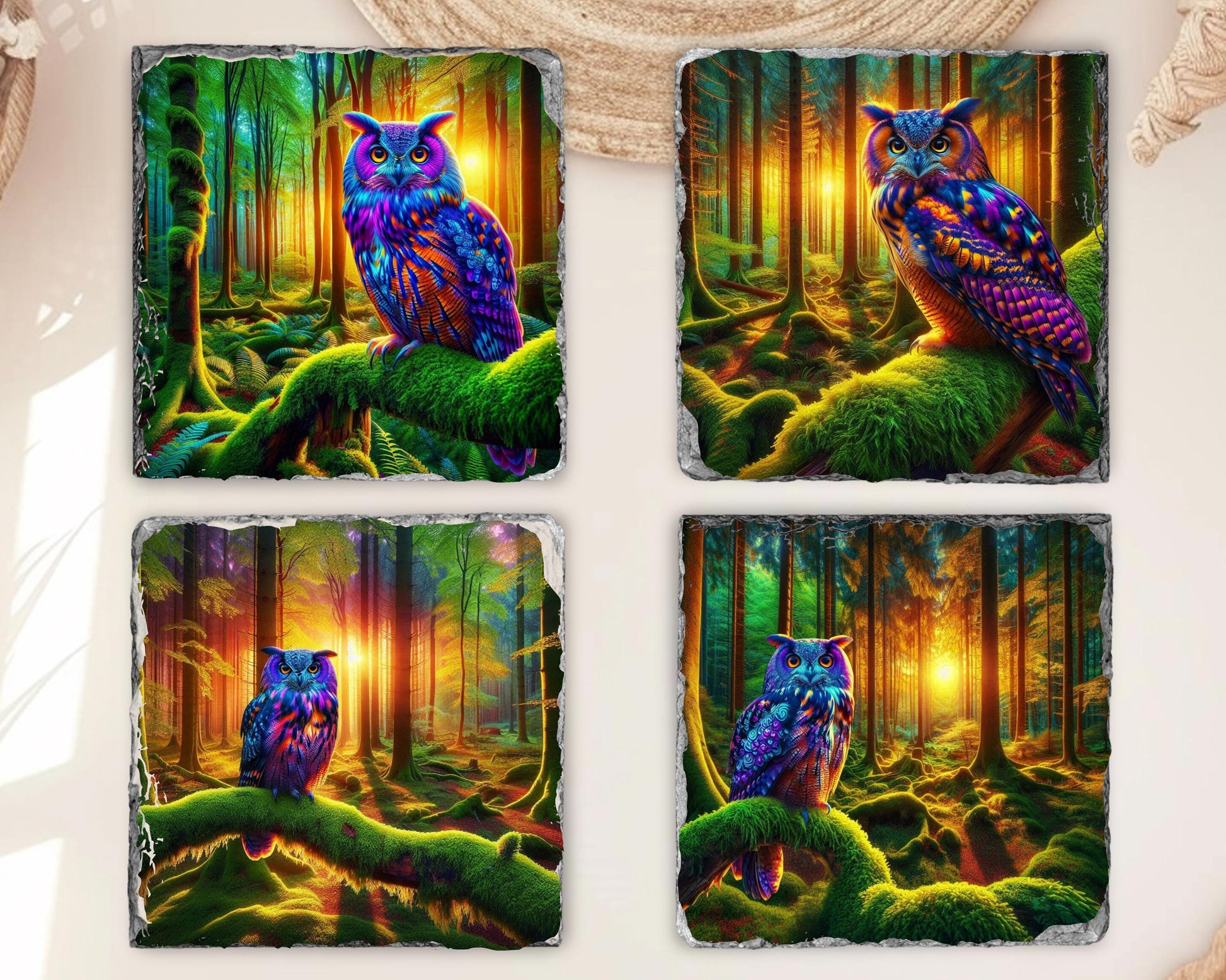 Elevate your dining experience with this charming set of four 3.5″ square slate coasters, each featuring a stunning illustration of a vibrant owl perched on a moss-covered branch in a tranquil woodland scene at dusk. The high-resolution sublimation printing ensures that the colors remain bright and enduring over time. Made from natural slate, each coaster showcases unique fractured edges, adding a touch of character and charm, with size variations of up to 0.04″.