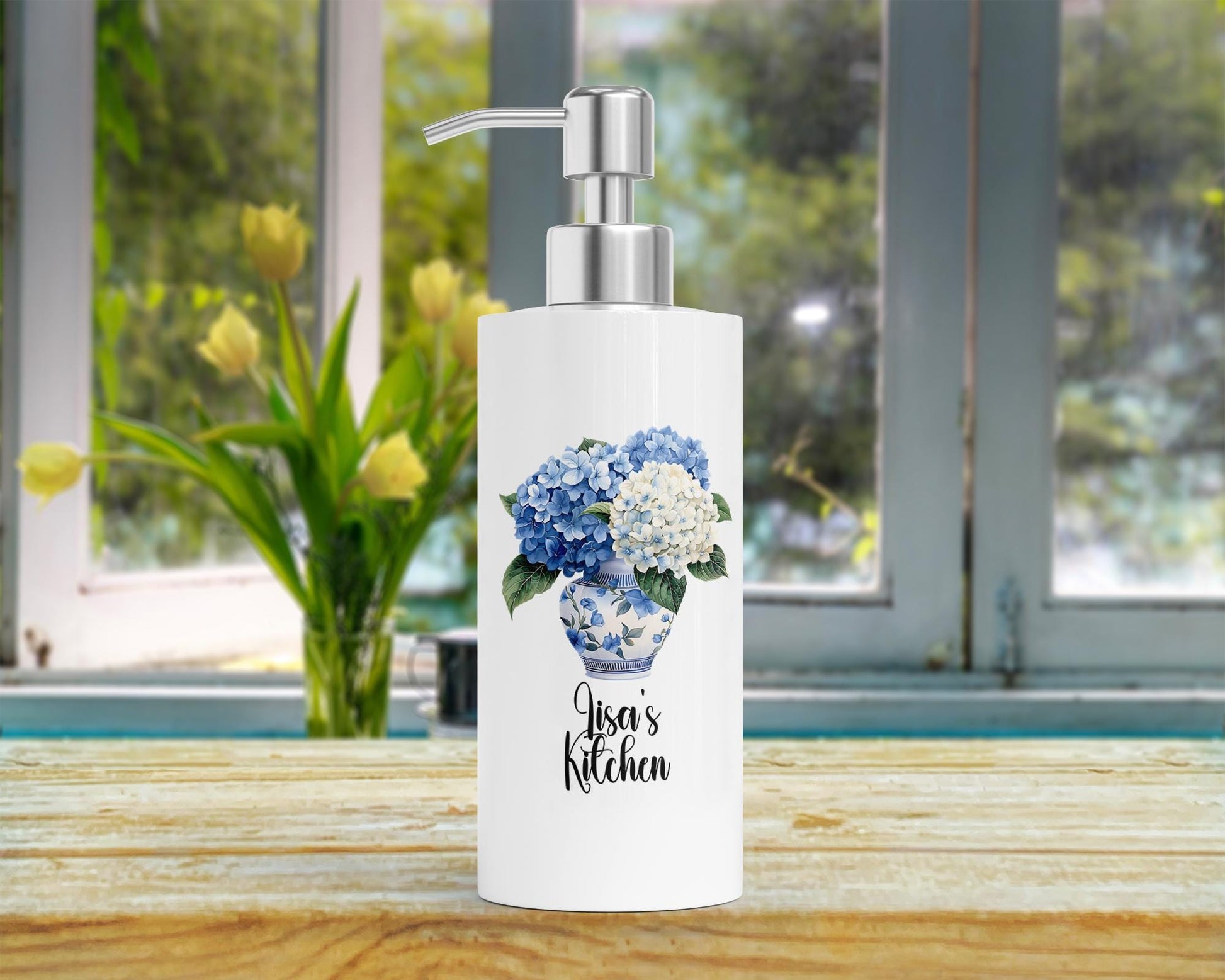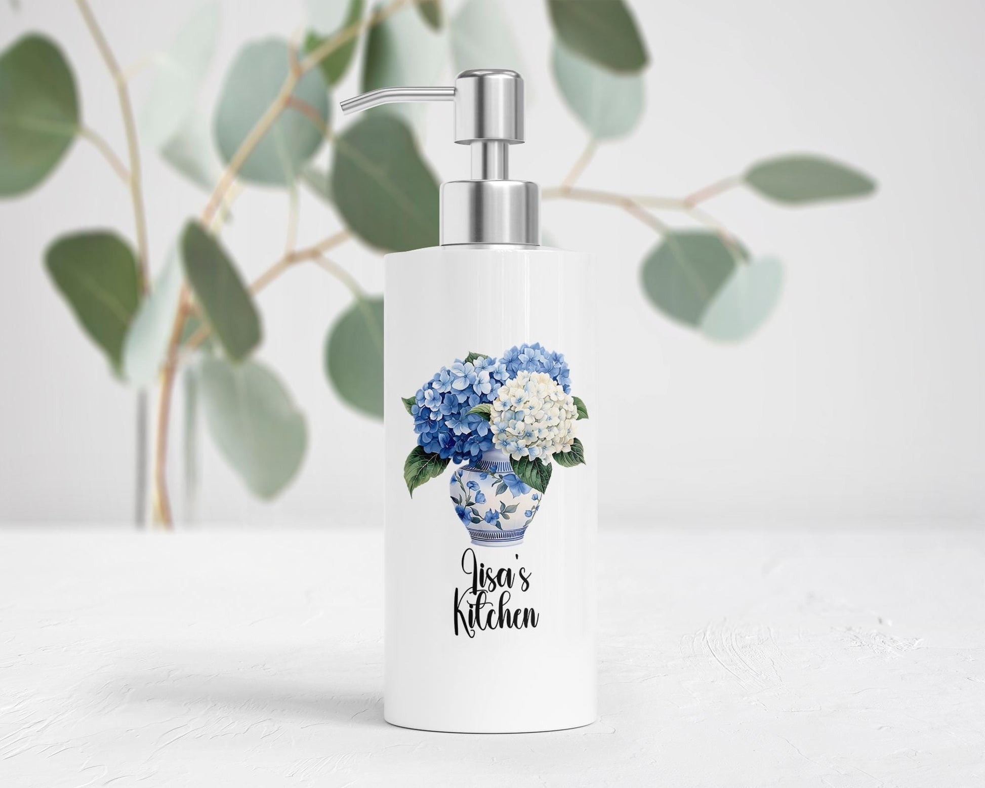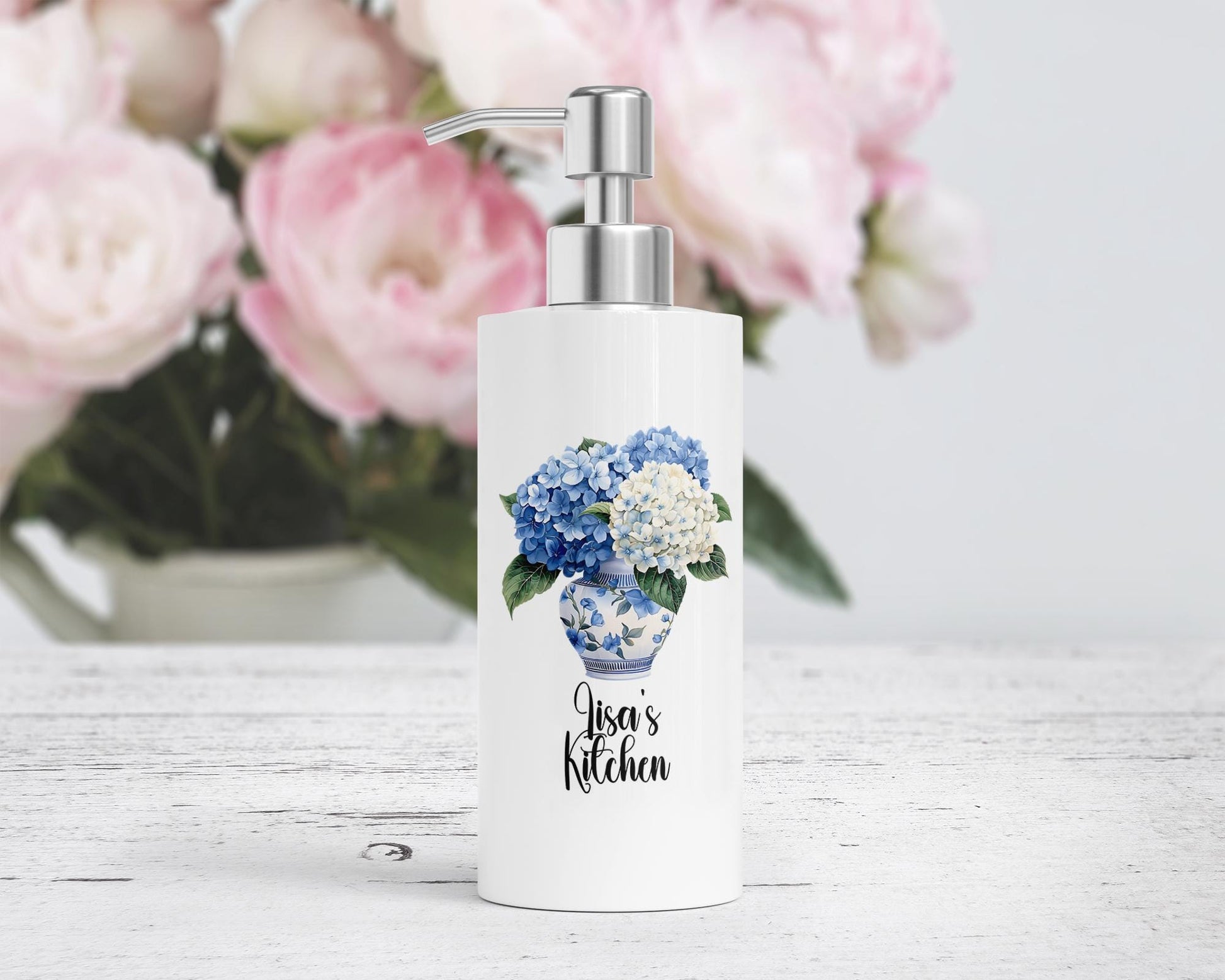Personalized Hydrangea Soap Dispenser - Custom Chinoiserie Lotion Pump for Kitchen Decor Blue Preppy Gift