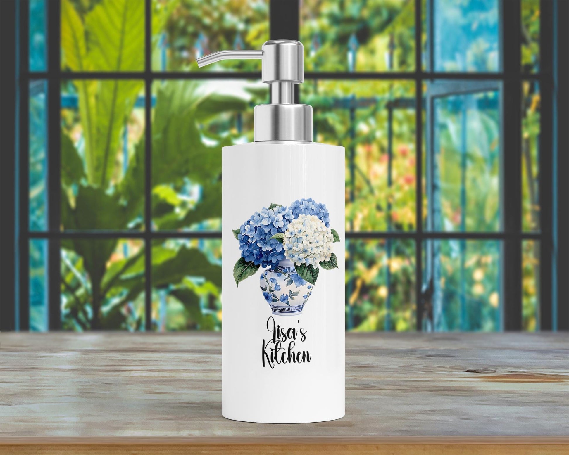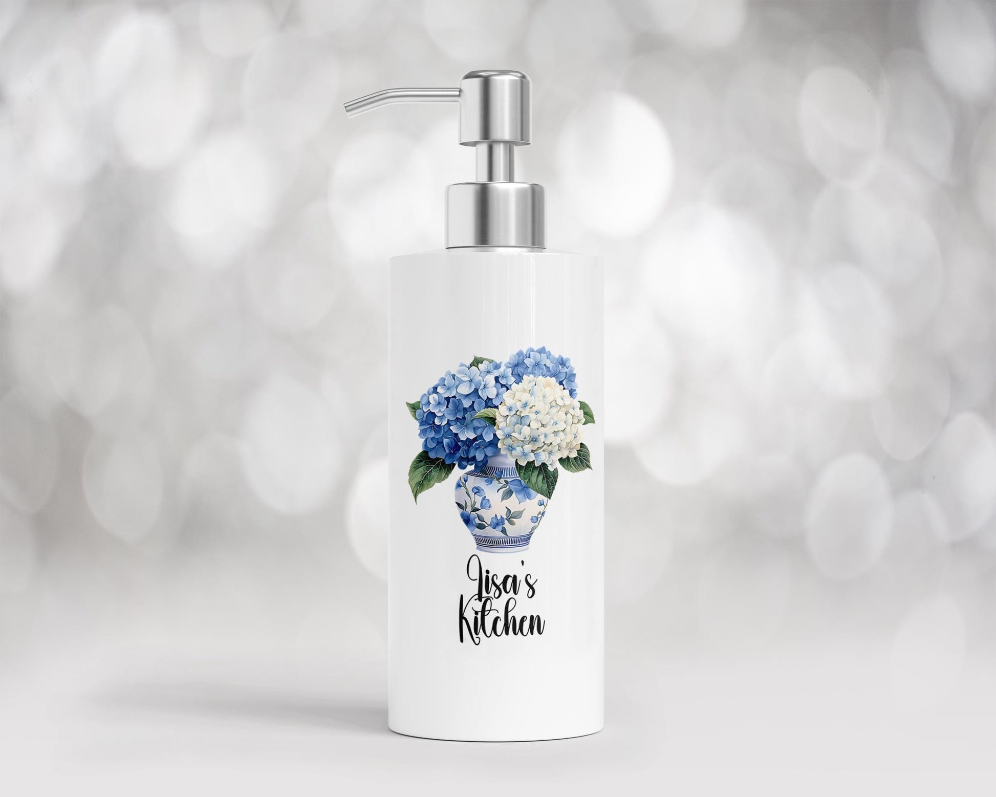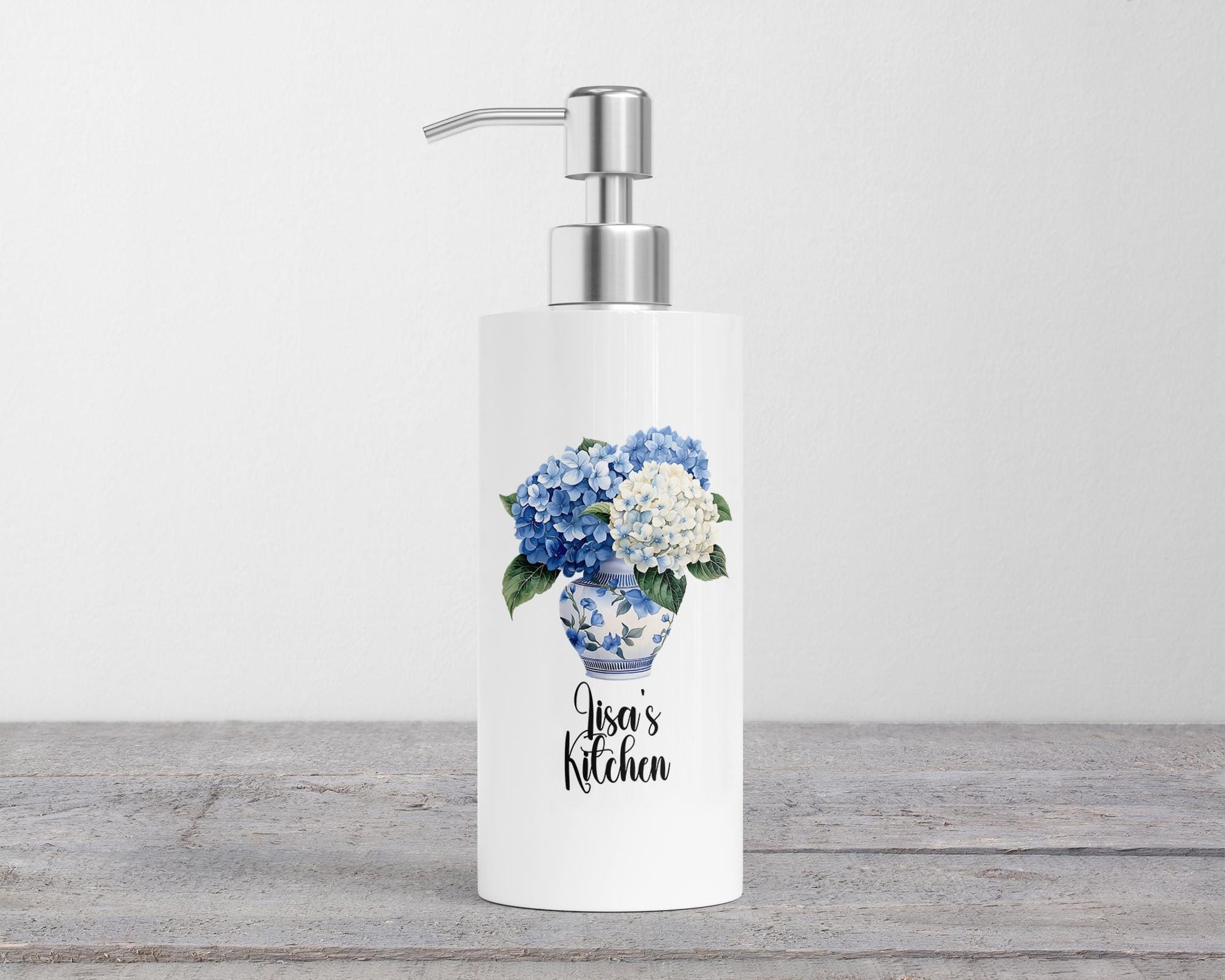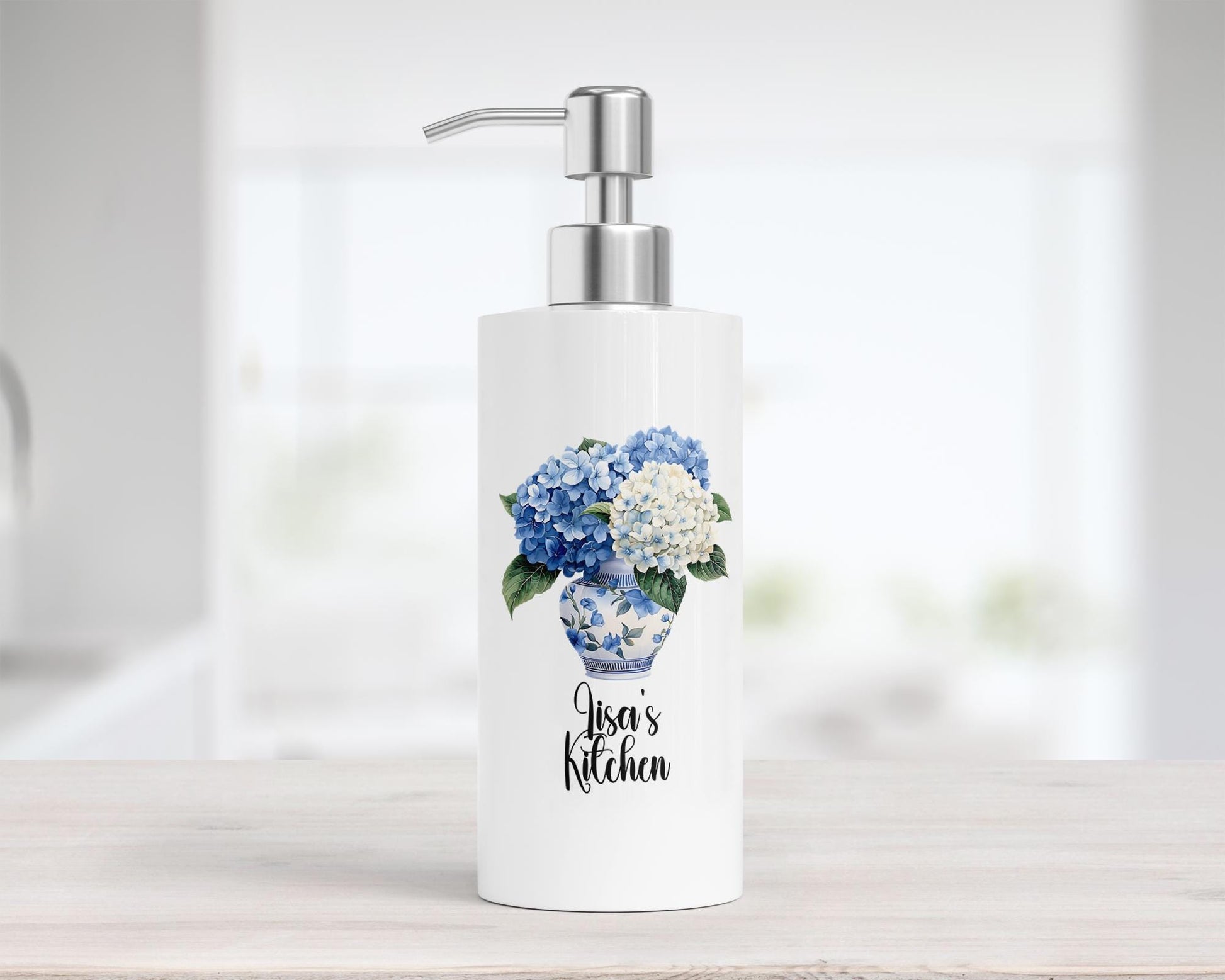 Personalized Hydrangea Soap Dispenser - Custom Chinoiserie Lotion Pump for Kitchen Decor Blue Preppy Gift