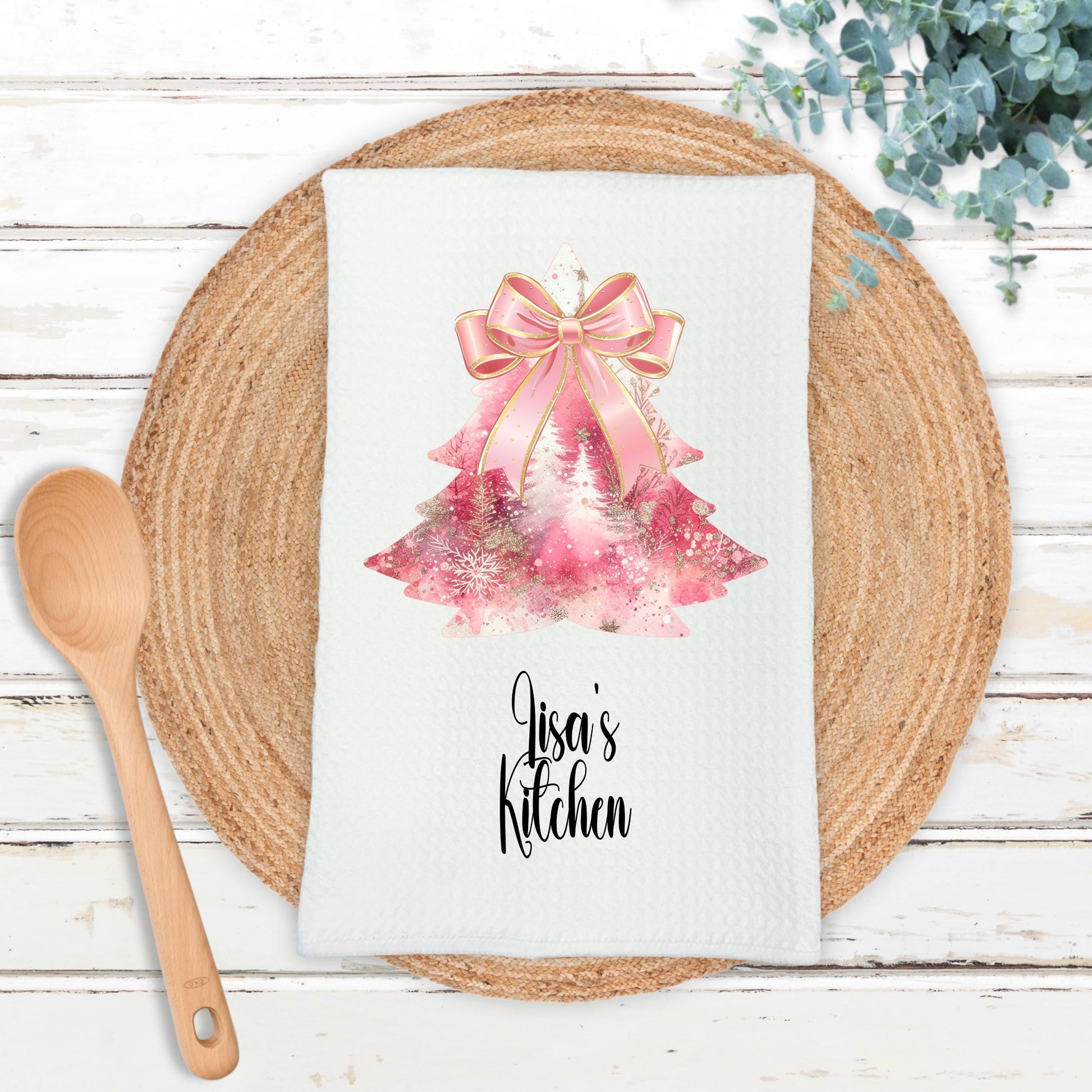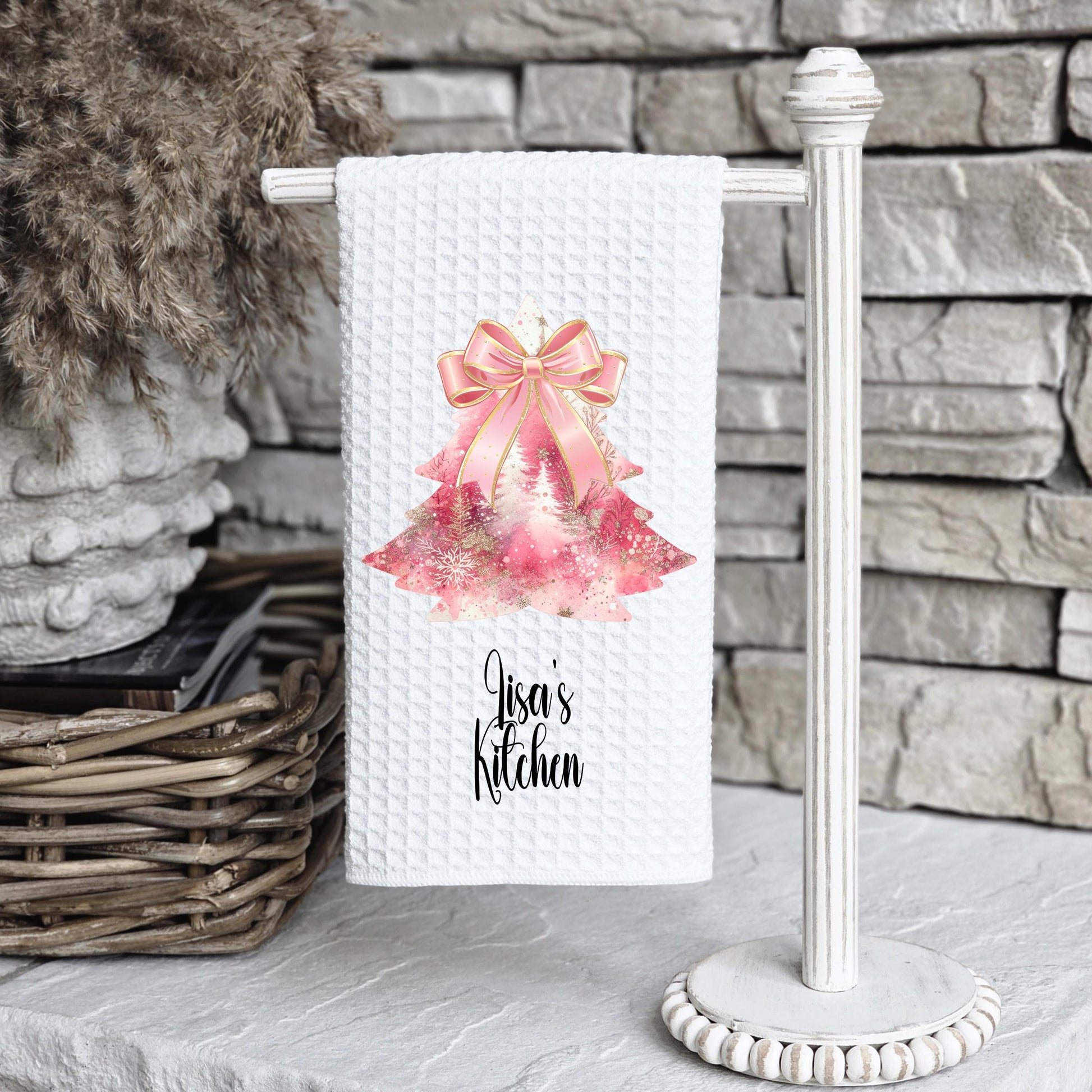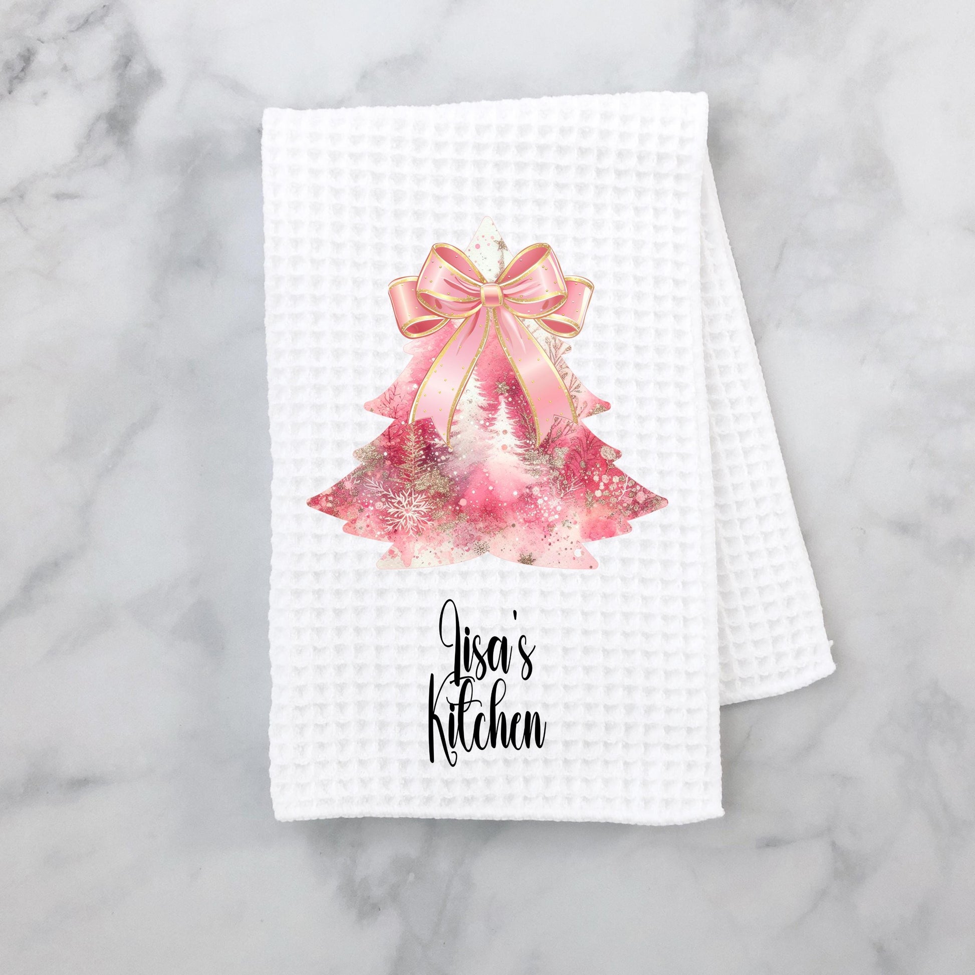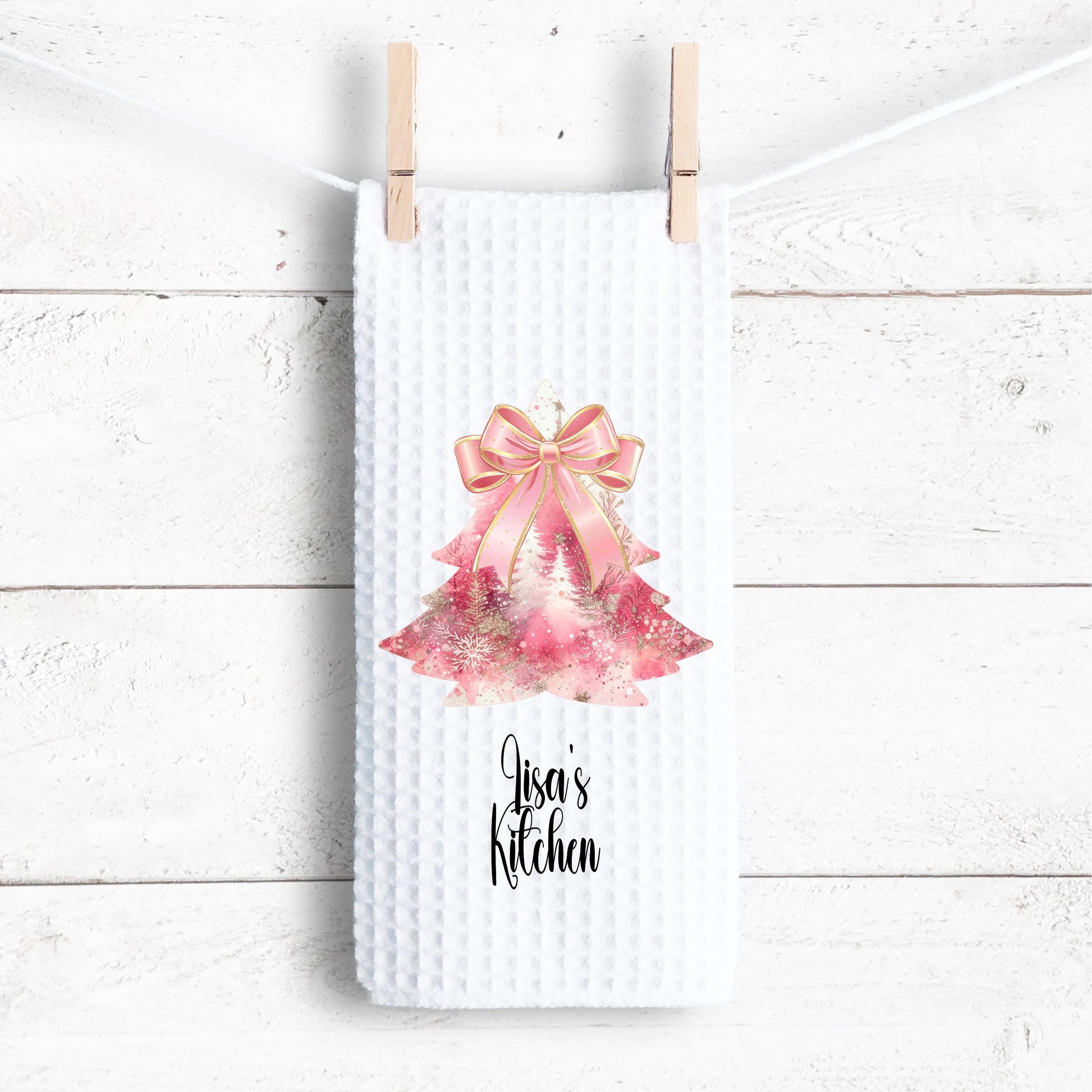 Personalized Christmas Tree Kitchen Towel in Pink Gold - Waffle Weave Design