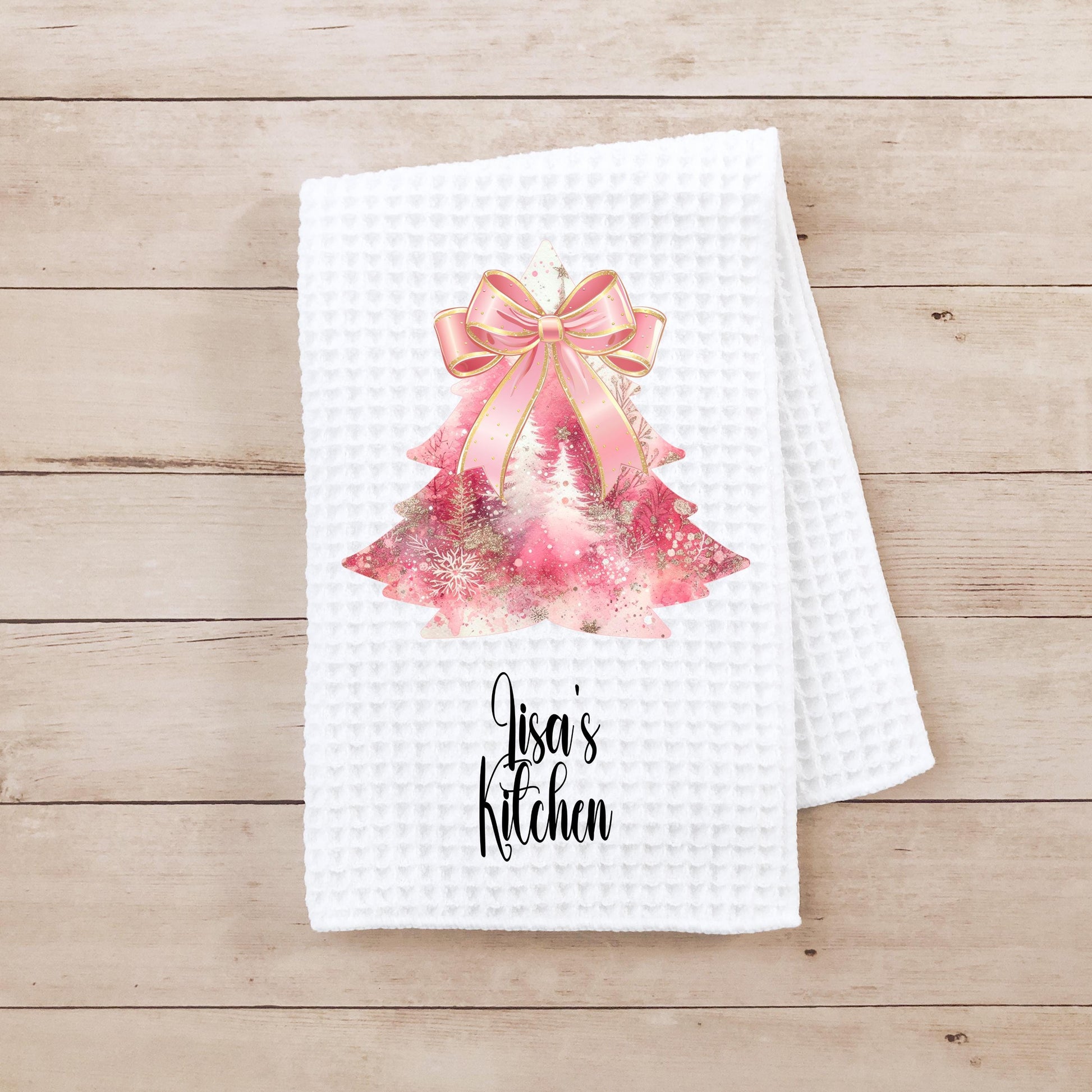 Add a touch of holiday magic to your kitchen with our beautiful 16x24 waffle weave microfiber towel, featuring a delightful Pink Gold Christmas Tree design topped with a charming pink bow. This towel is designed to keep your kitchen festive and stylish throughout the season.
