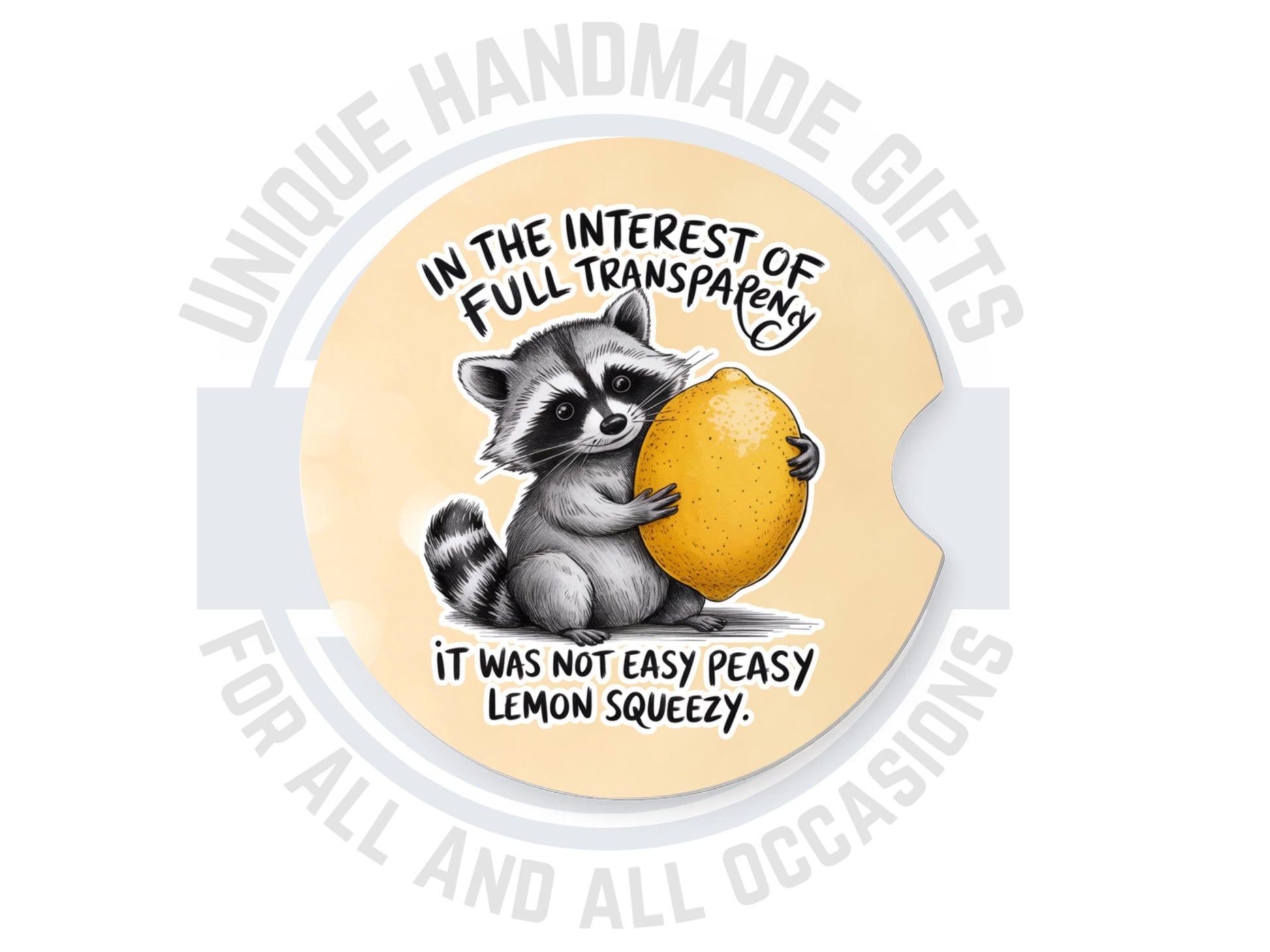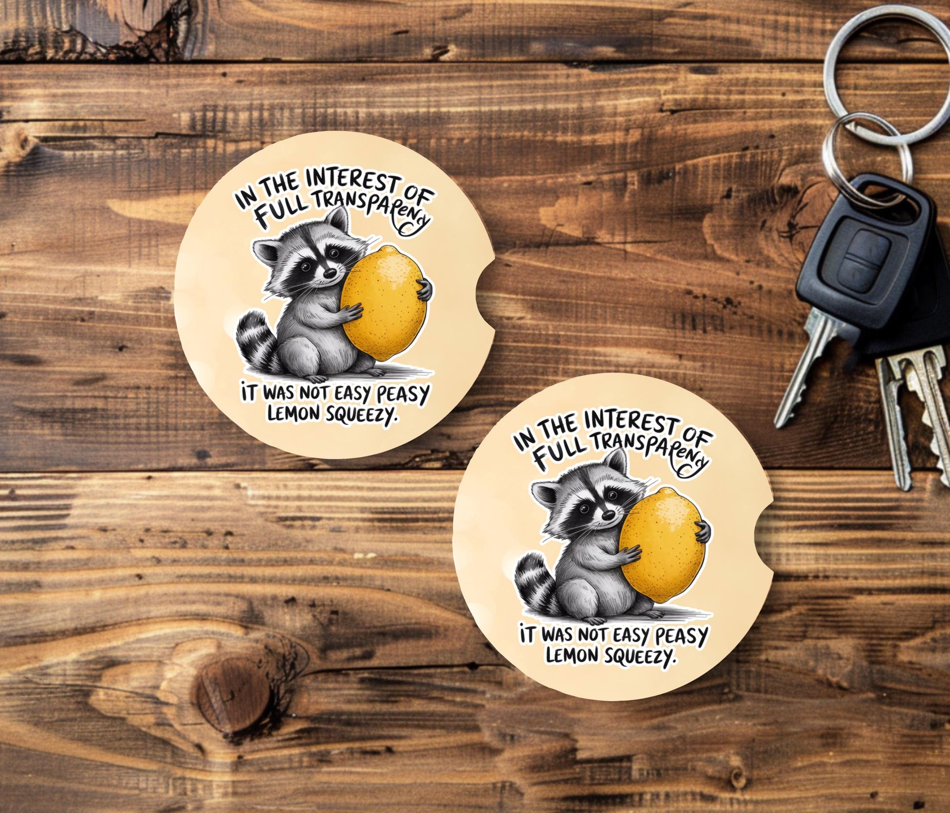 Add a playful touch to your vehicle with this delightful set of two sandstone car coasters, each adorned with a charming raccoon design and a whimsical lemon quote. Measuring 2.56 inches in diameter and 0.30 inches thick, these coasters are ideal for keeping your cup holders clean and dry. The quote reads, "In the interest of full transparency, it was not easy peasy lemon squeezy."