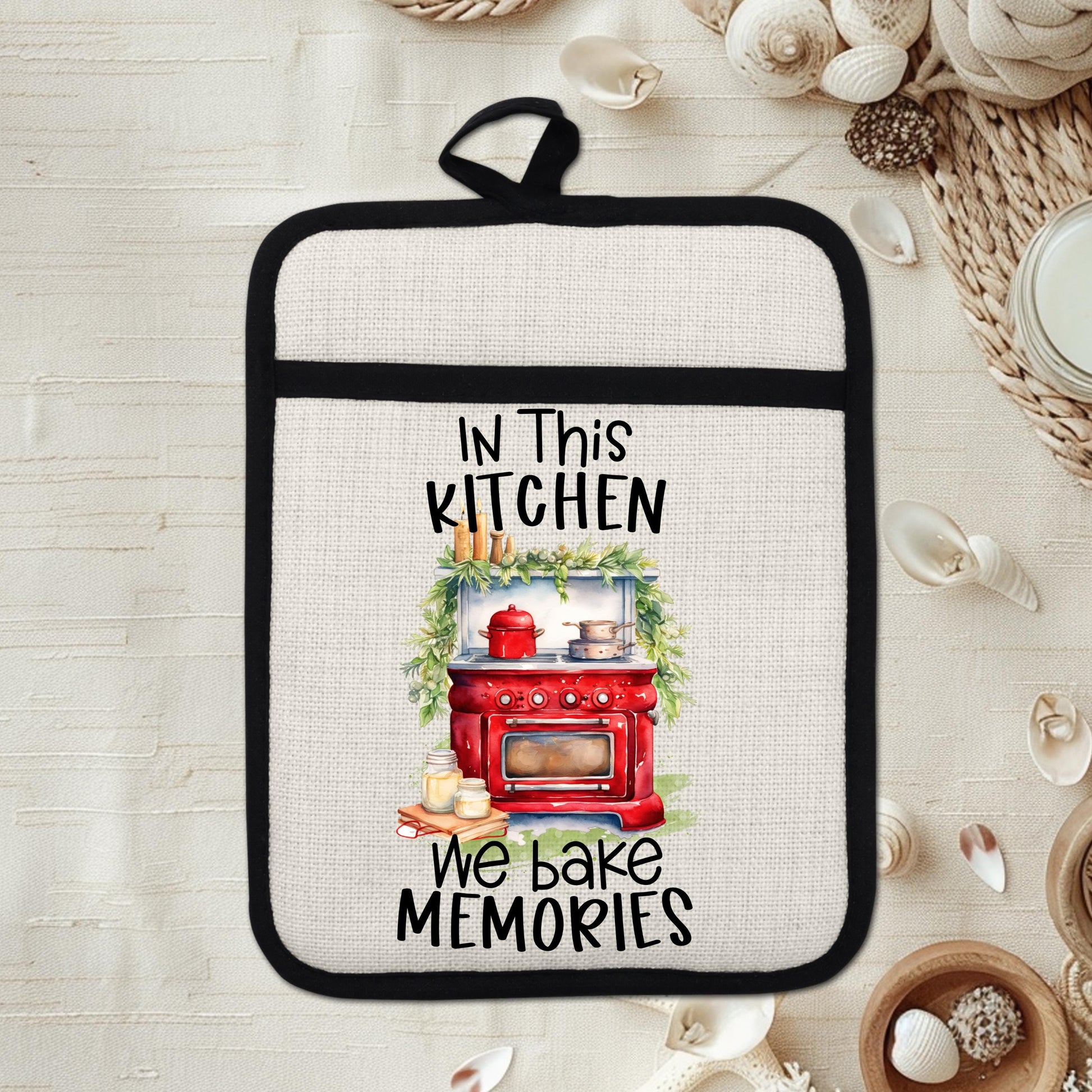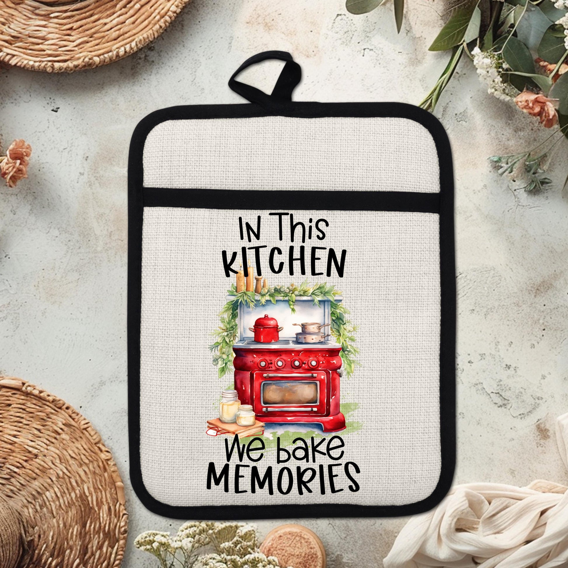 Red Farmhouse Oven Pot Holder - We Bake Memories Quote Rustic Linen Hot Pad for Christmas Kitchen Decor Holiday Gifts