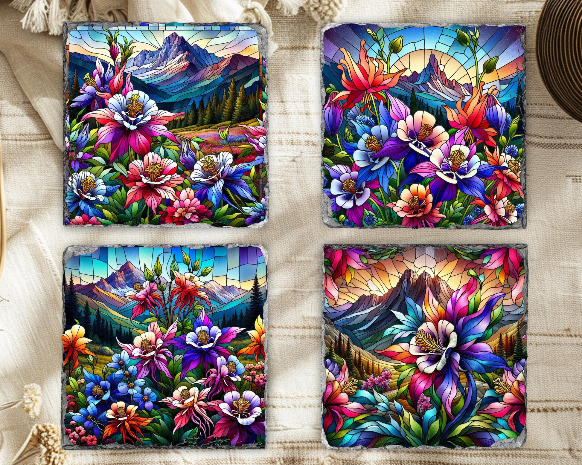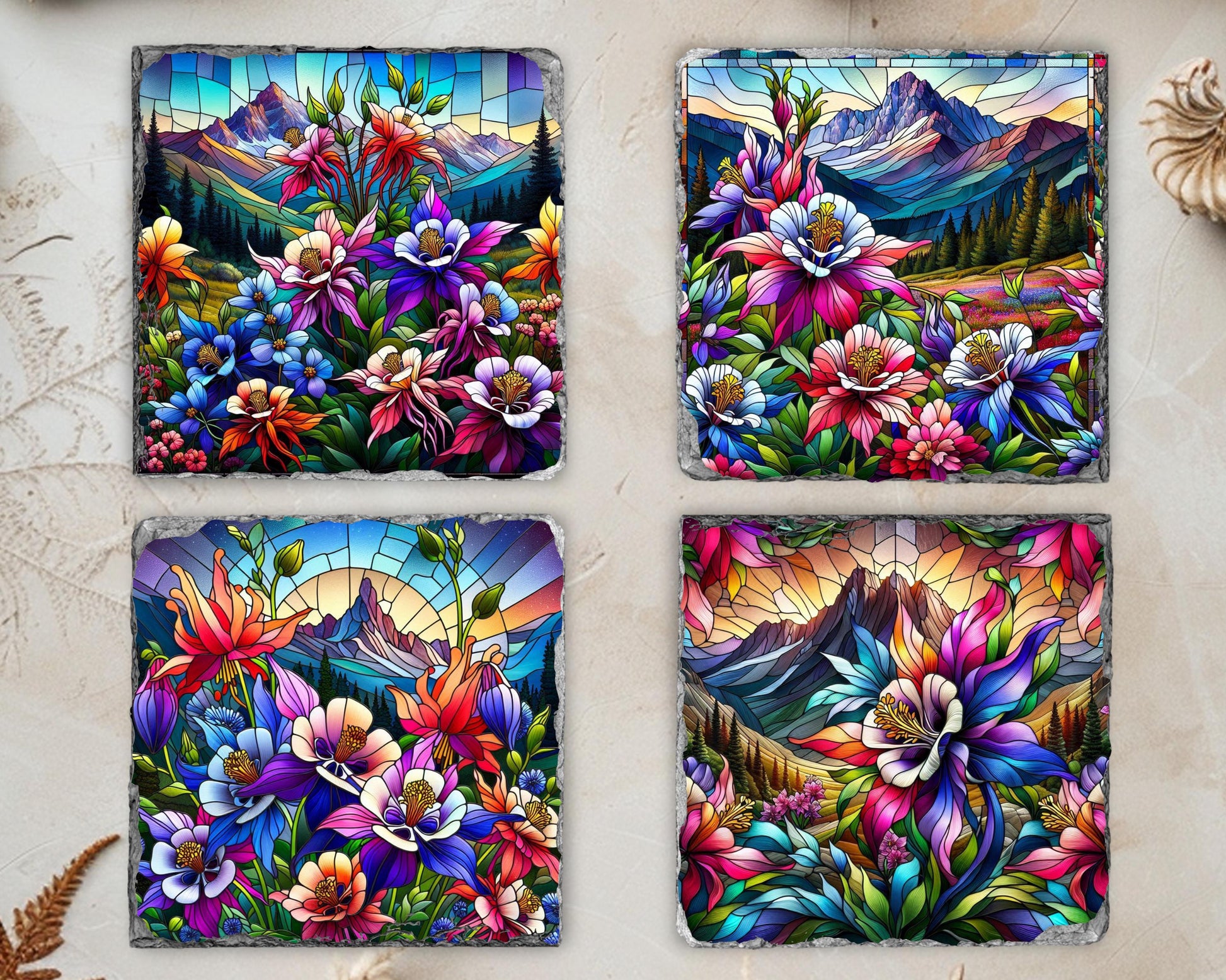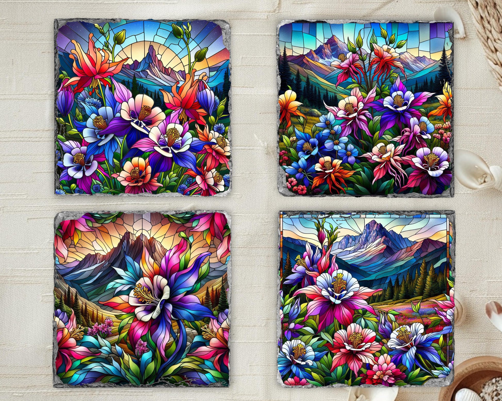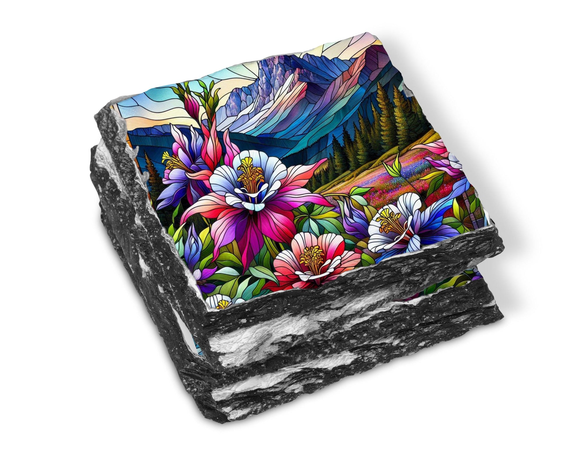 Discover the natural beauty of Colorado's state flower with this stunning set of four slate coasters, each featuring a vibrant faux stained glass illustration of colorful Rocky Mountain columbines thriving in a tranquil mountain valley. Made from genuine natural slate, these coasters showcase unique fractured edges that enhance their artistic appeal while offering practical functionality for everyday use.
