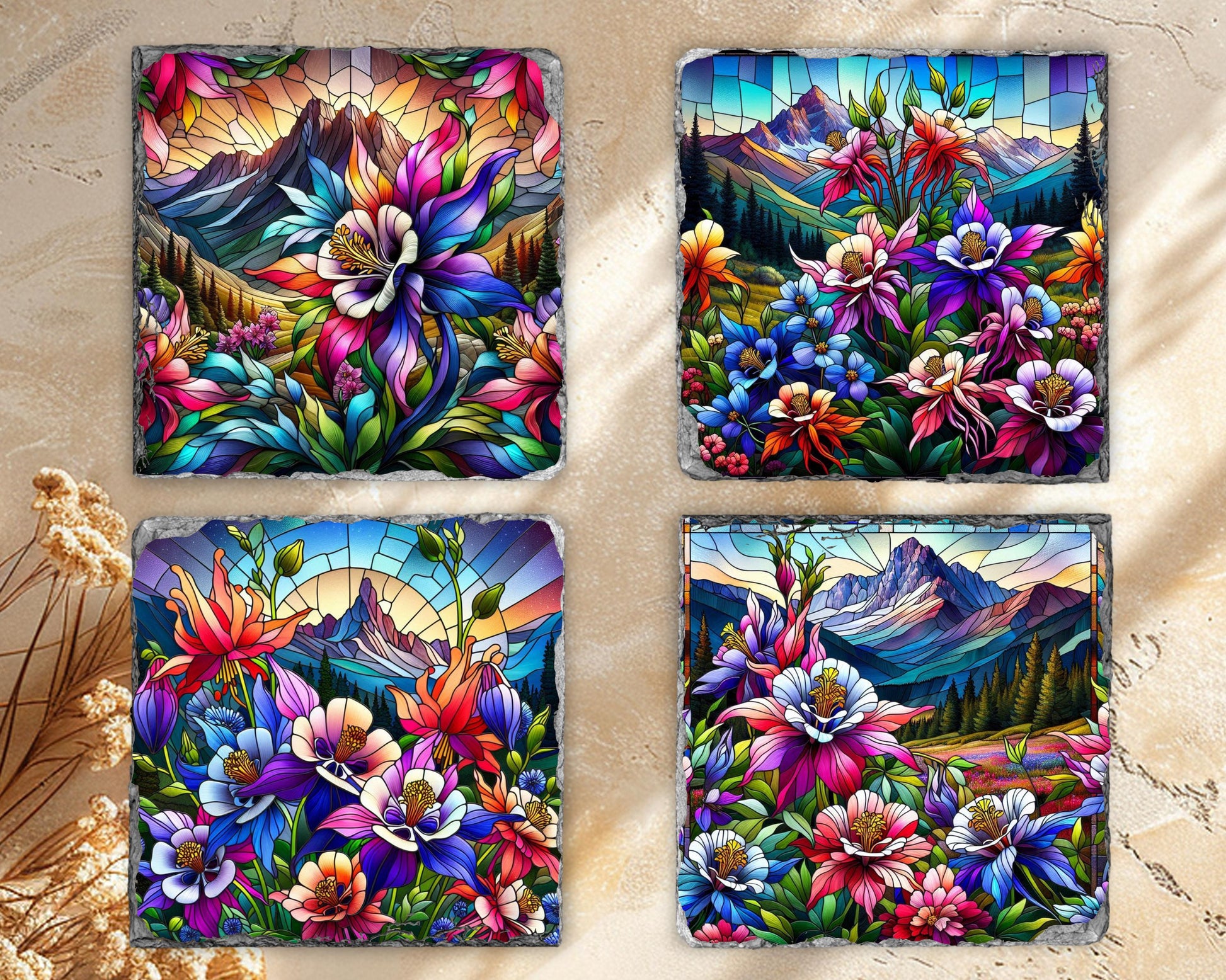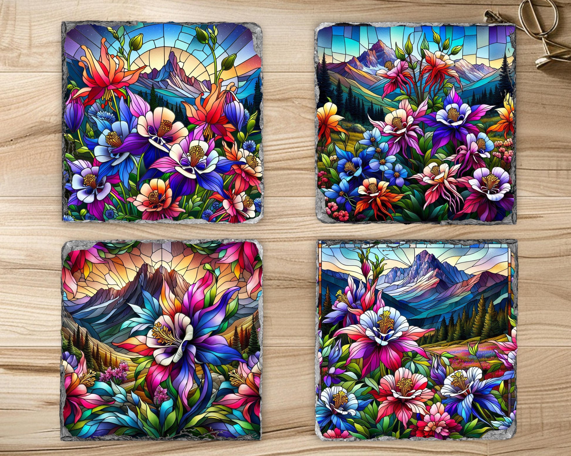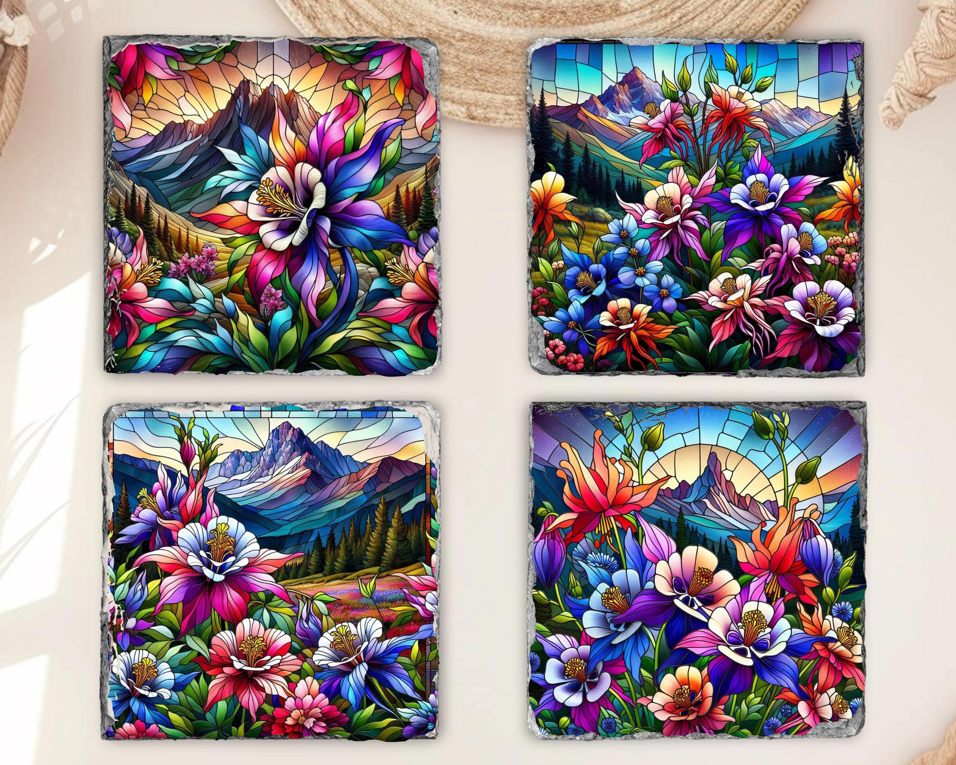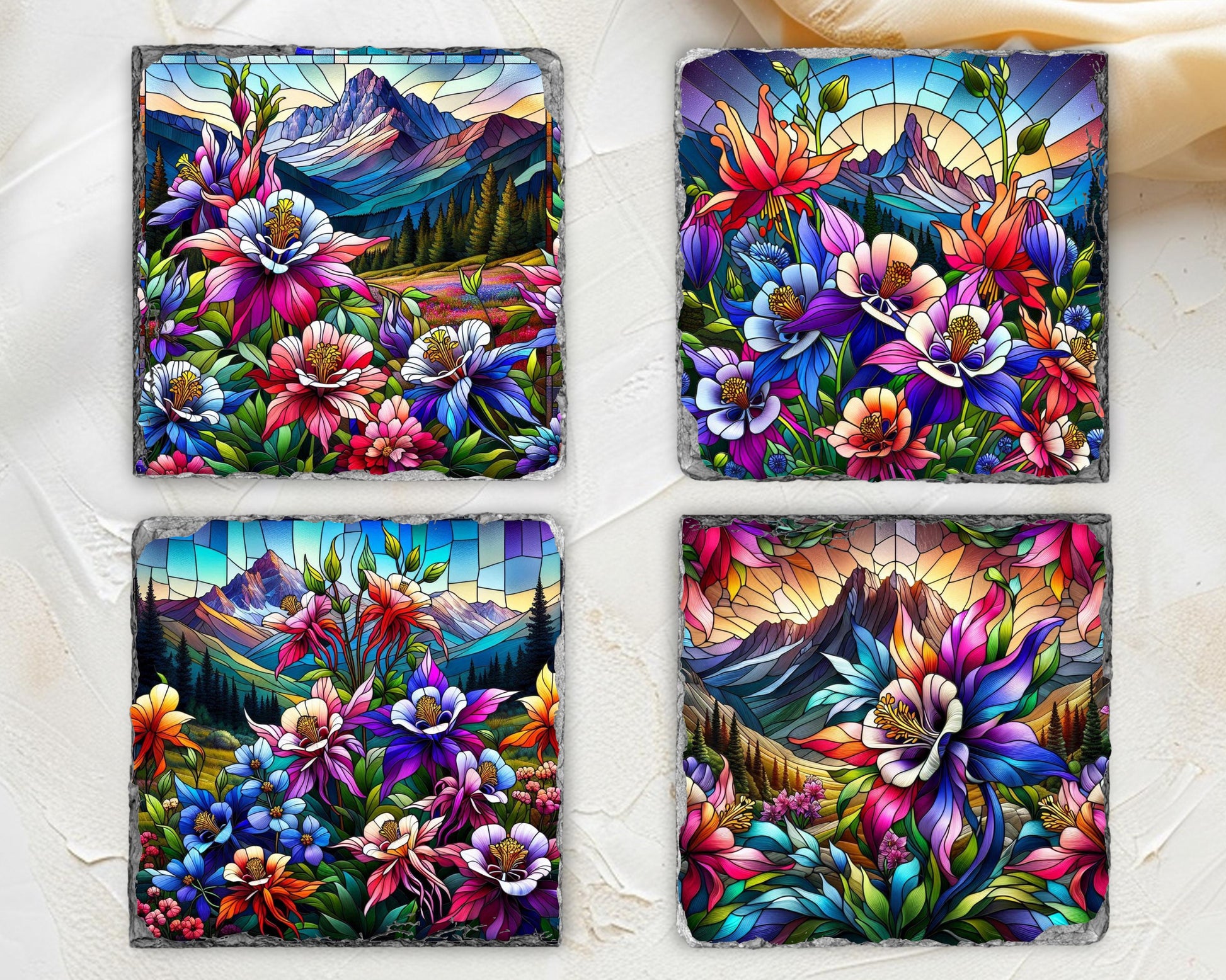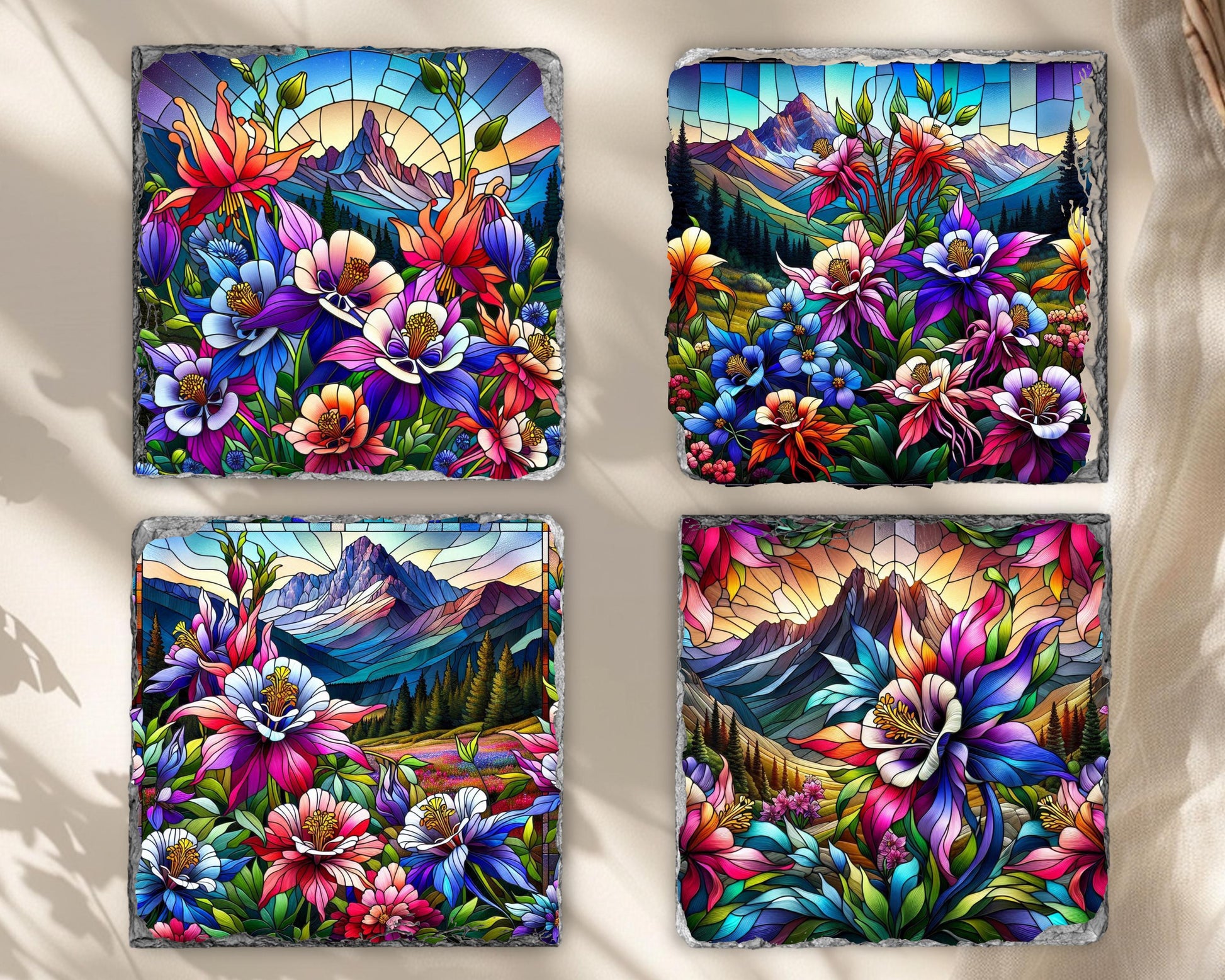 Discover the natural beauty of Colorado's state flower with this stunning set of four slate coasters, each featuring a vibrant faux stained glass illustration of colorful Rocky Mountain columbines thriving in a tranquil mountain valley. Made from genuine natural slate, these coasters showcase unique fractured edges that enhance their artistic appeal while offering practical functionality for everyday use.